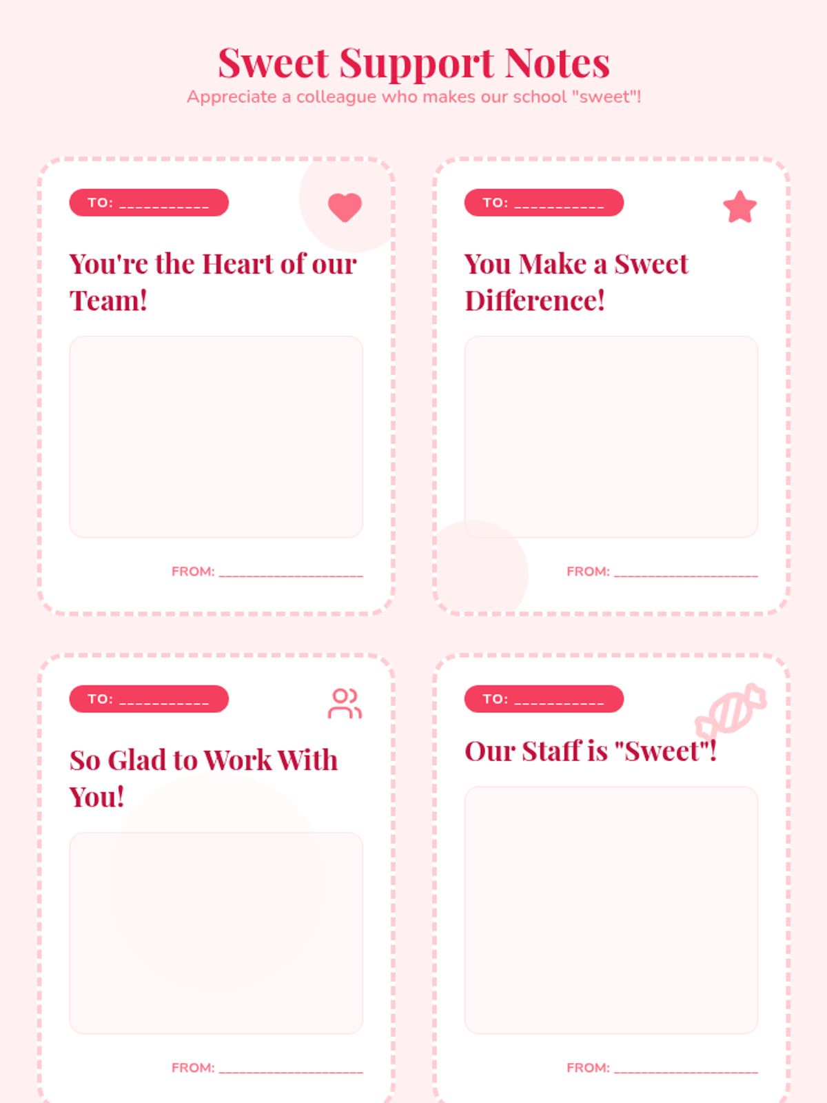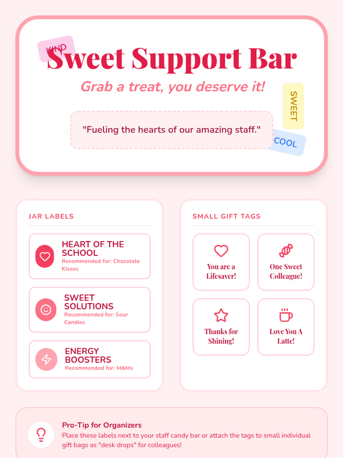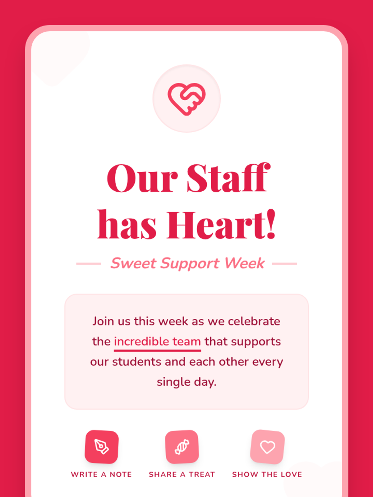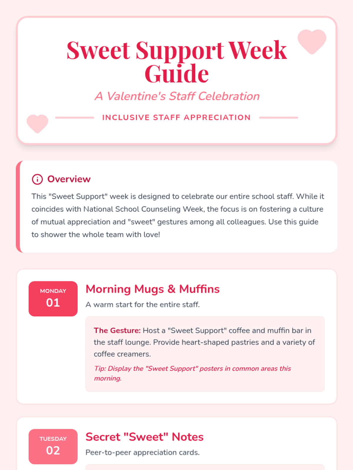 A week-long celebration plan for National School Counseling Week with a Valentine's Day theme, featuring daily small gestures and activities to show appreciation for school counselors.