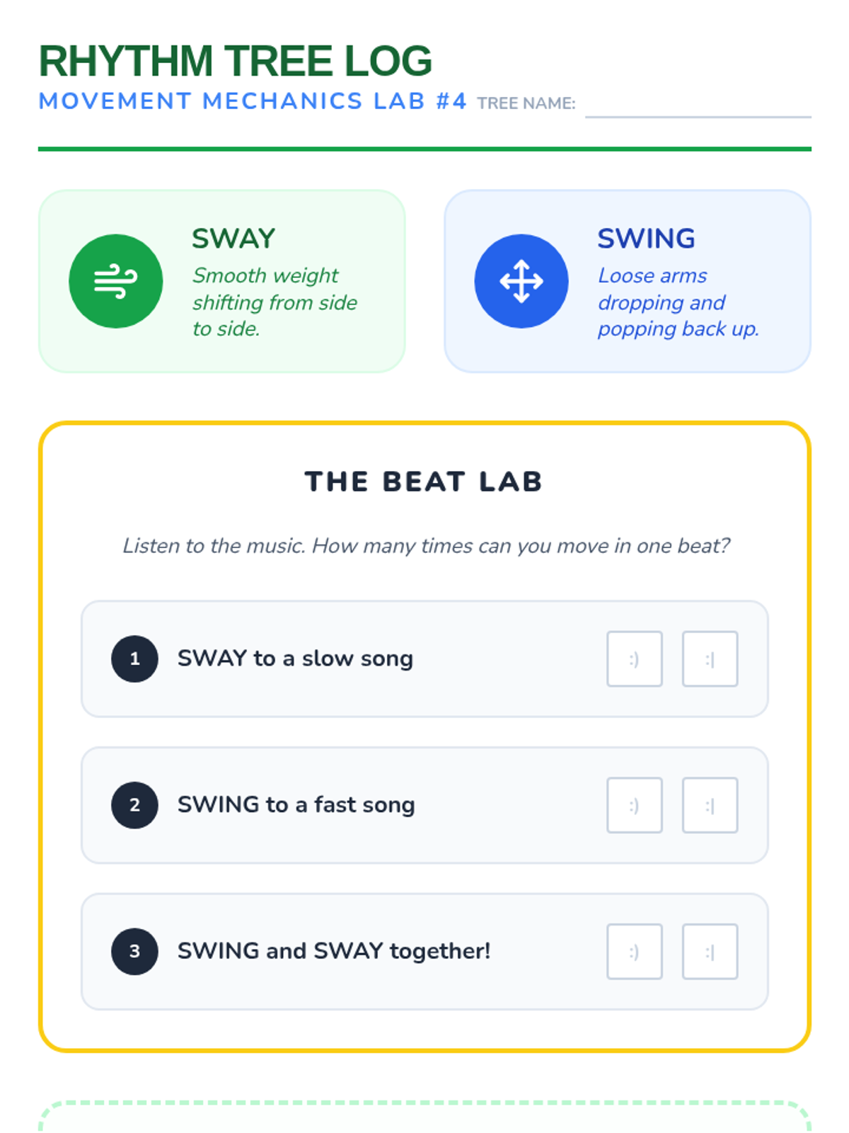 Explores pendular movements like swinging and swaying. Students investigate the difference between abrupt, gravity-driven swings and controlled, weight-shifting sways.