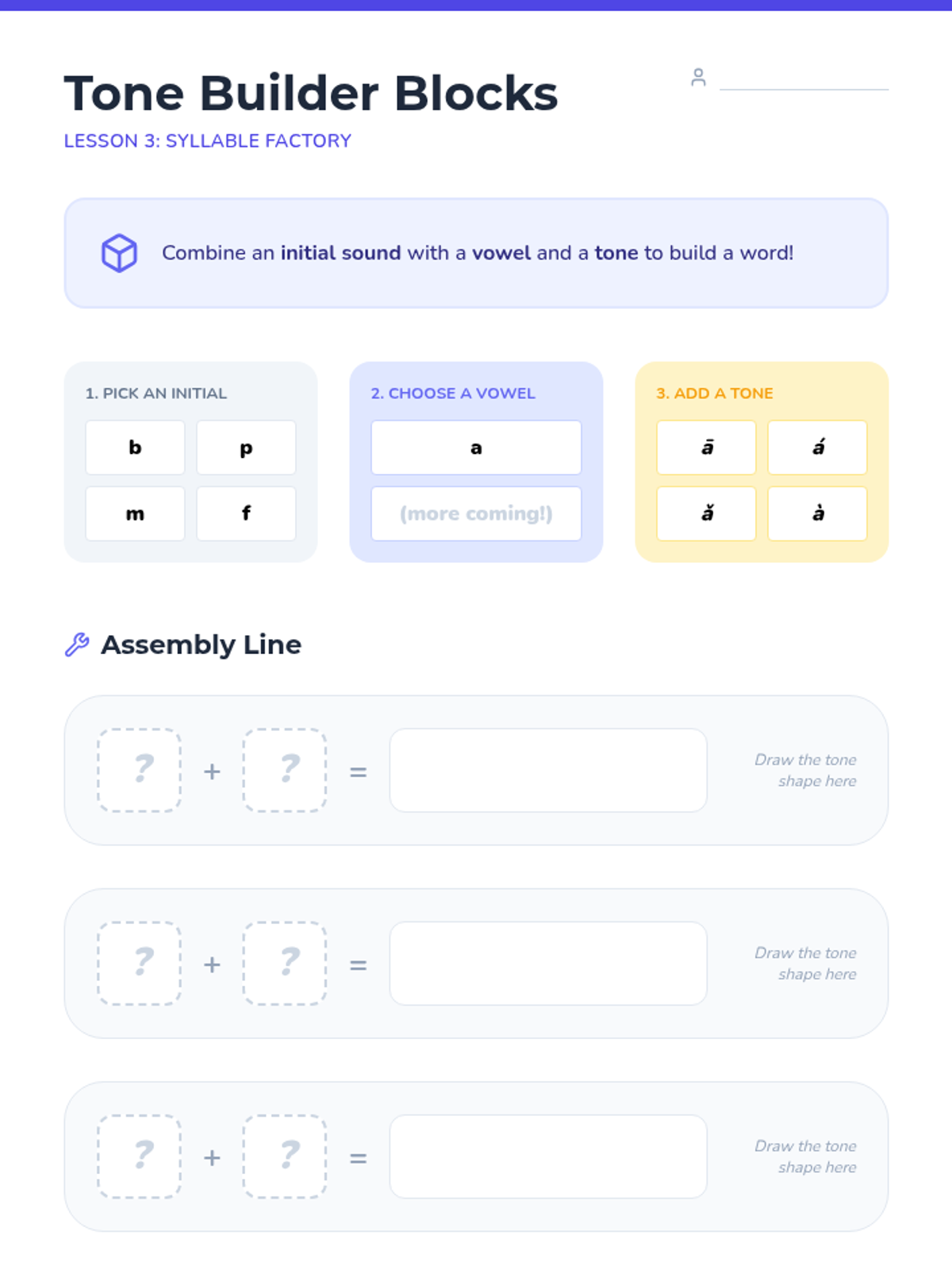 Students combine initial consonants (b, p, m, f) with vowels and the four tones to create complete syllables.