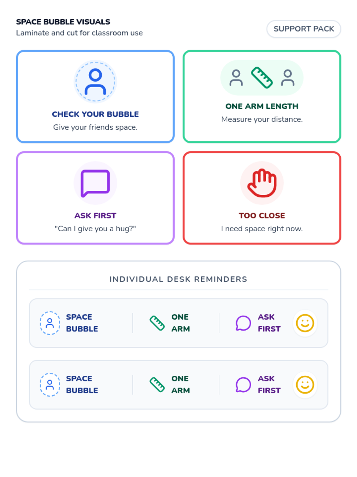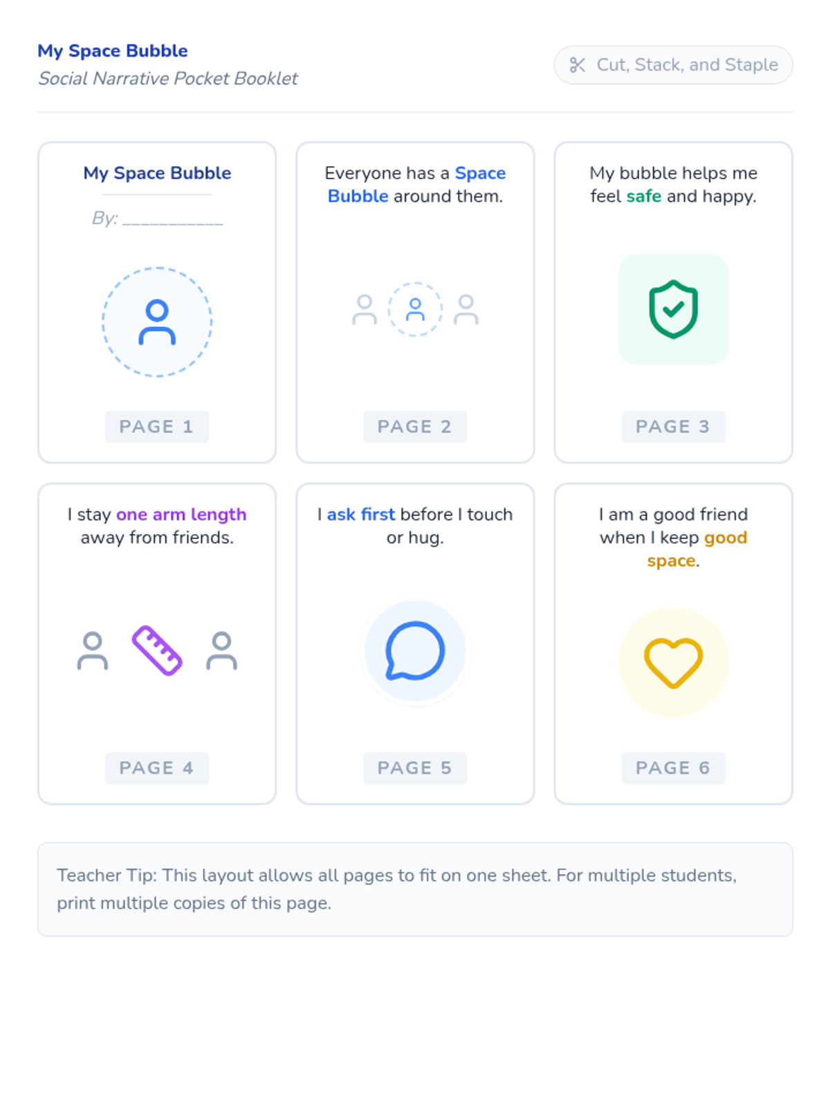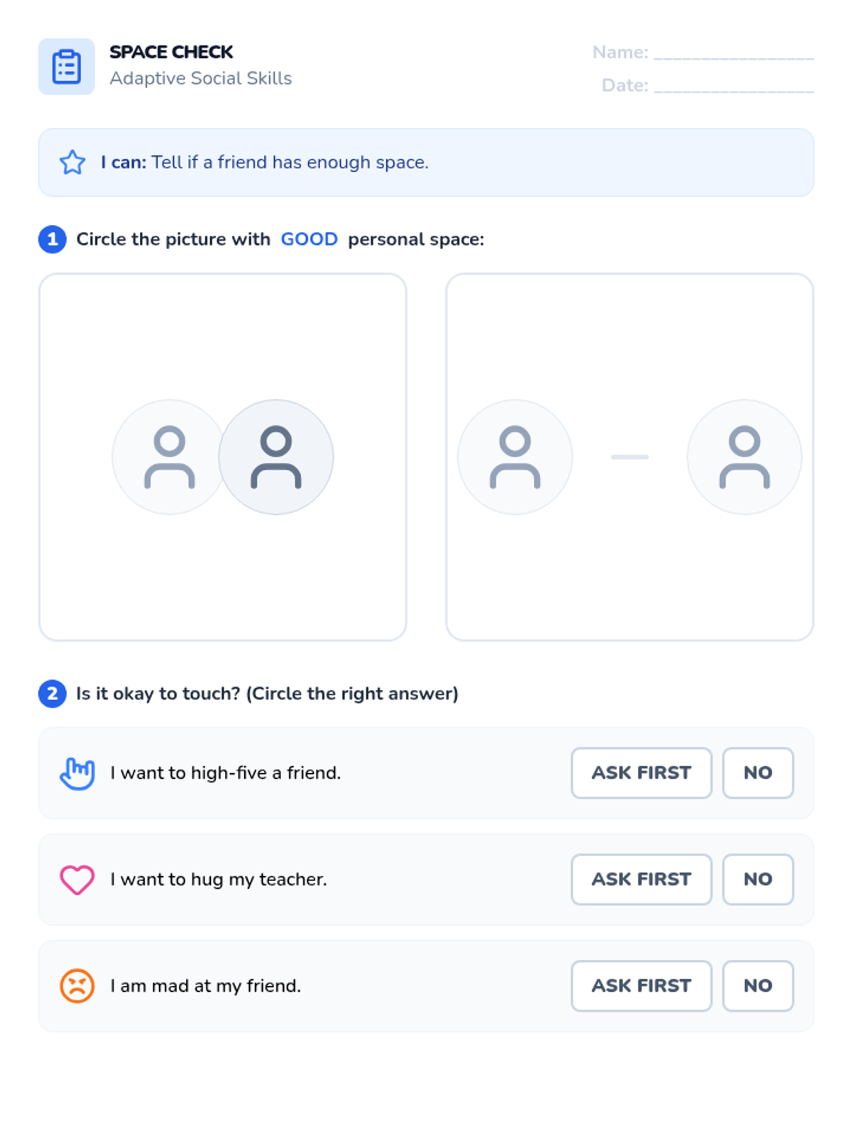 A foundational social skills lesson focusing on understanding and respecting personal space boundaries using visual narratives and interactive practice.