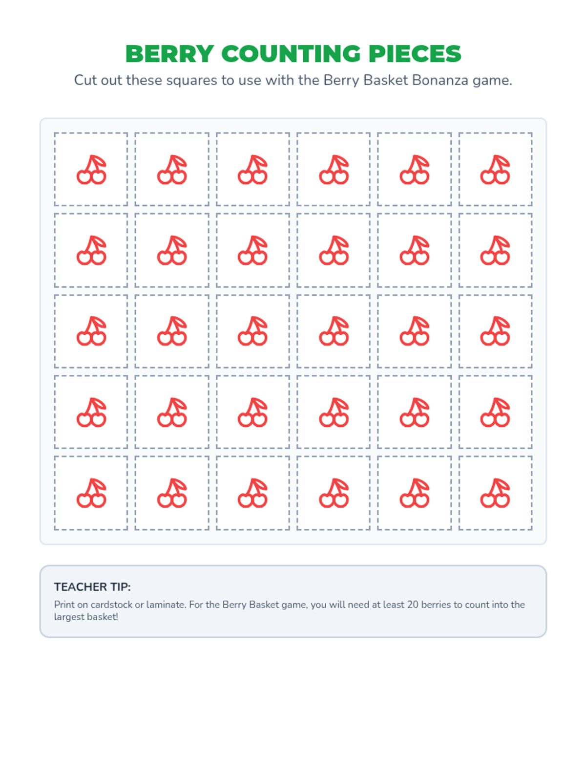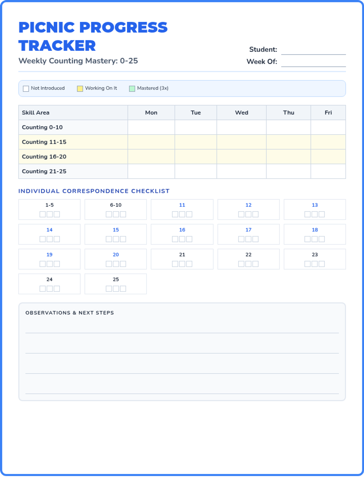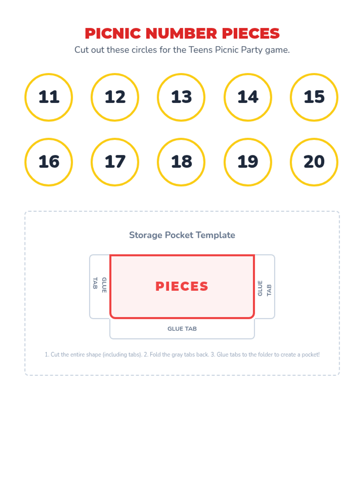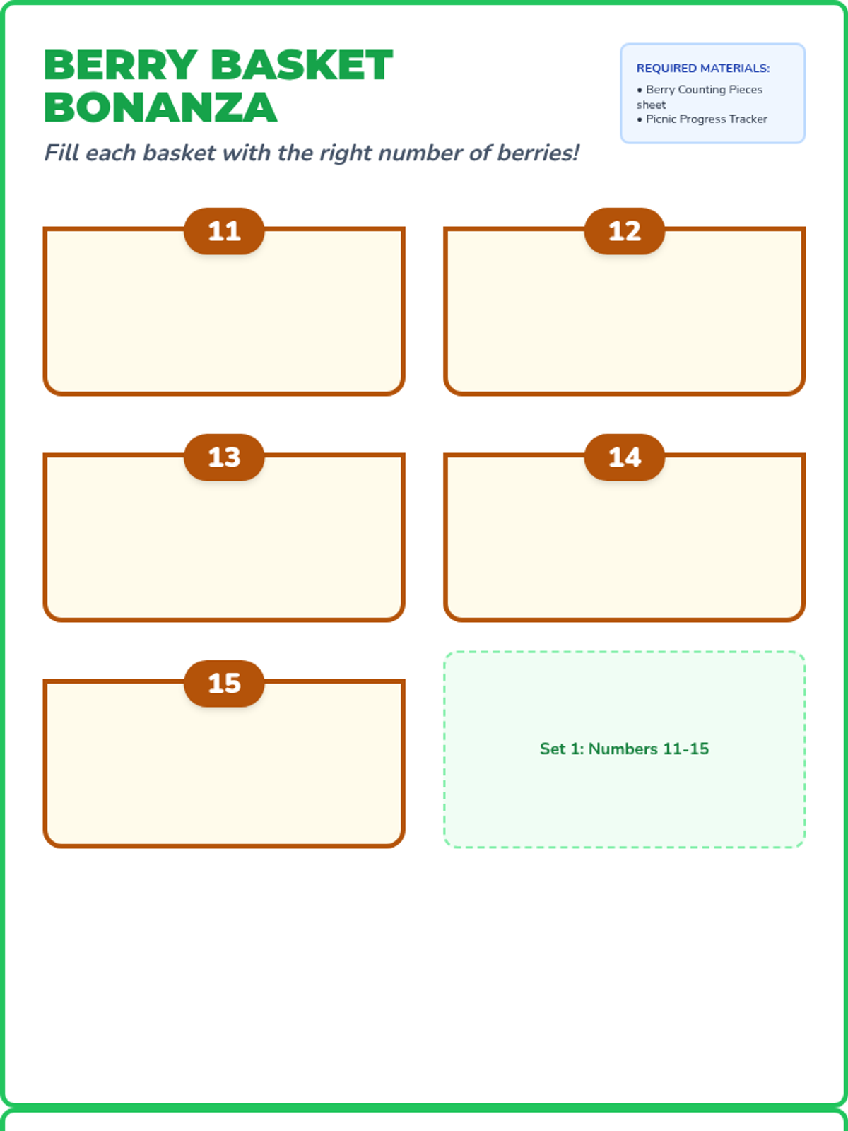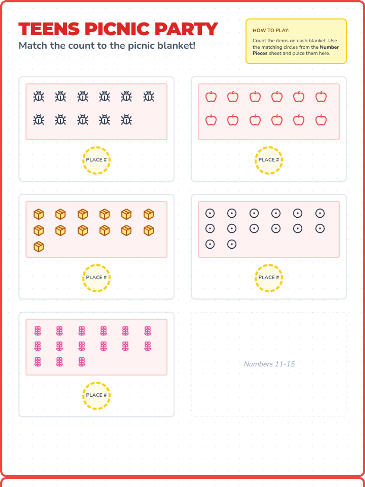 A collection of hands-on file folder games and tracking tools focused on counting objects from 0-25, with a specific emphasis on the teen numbers 11-20 using a picnic theme.