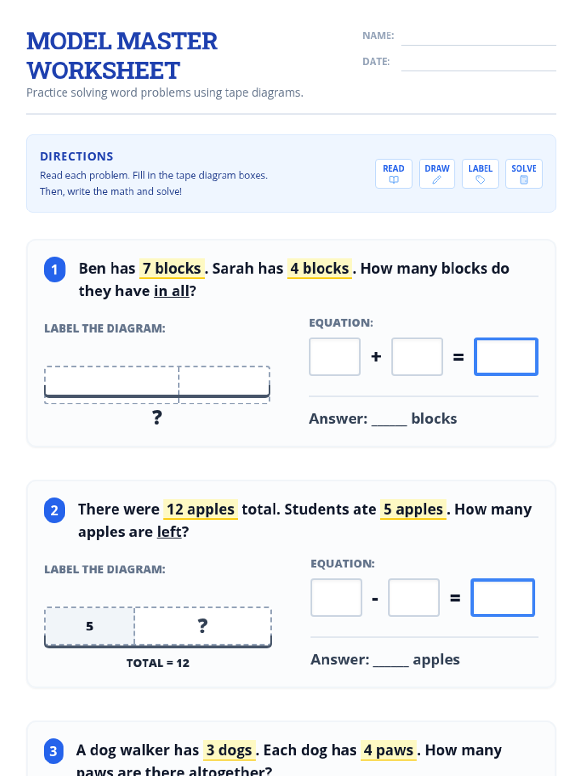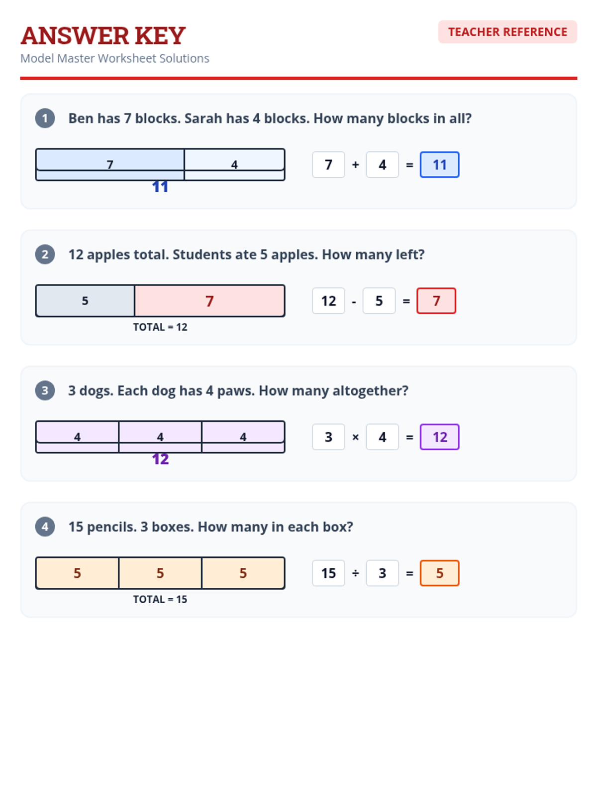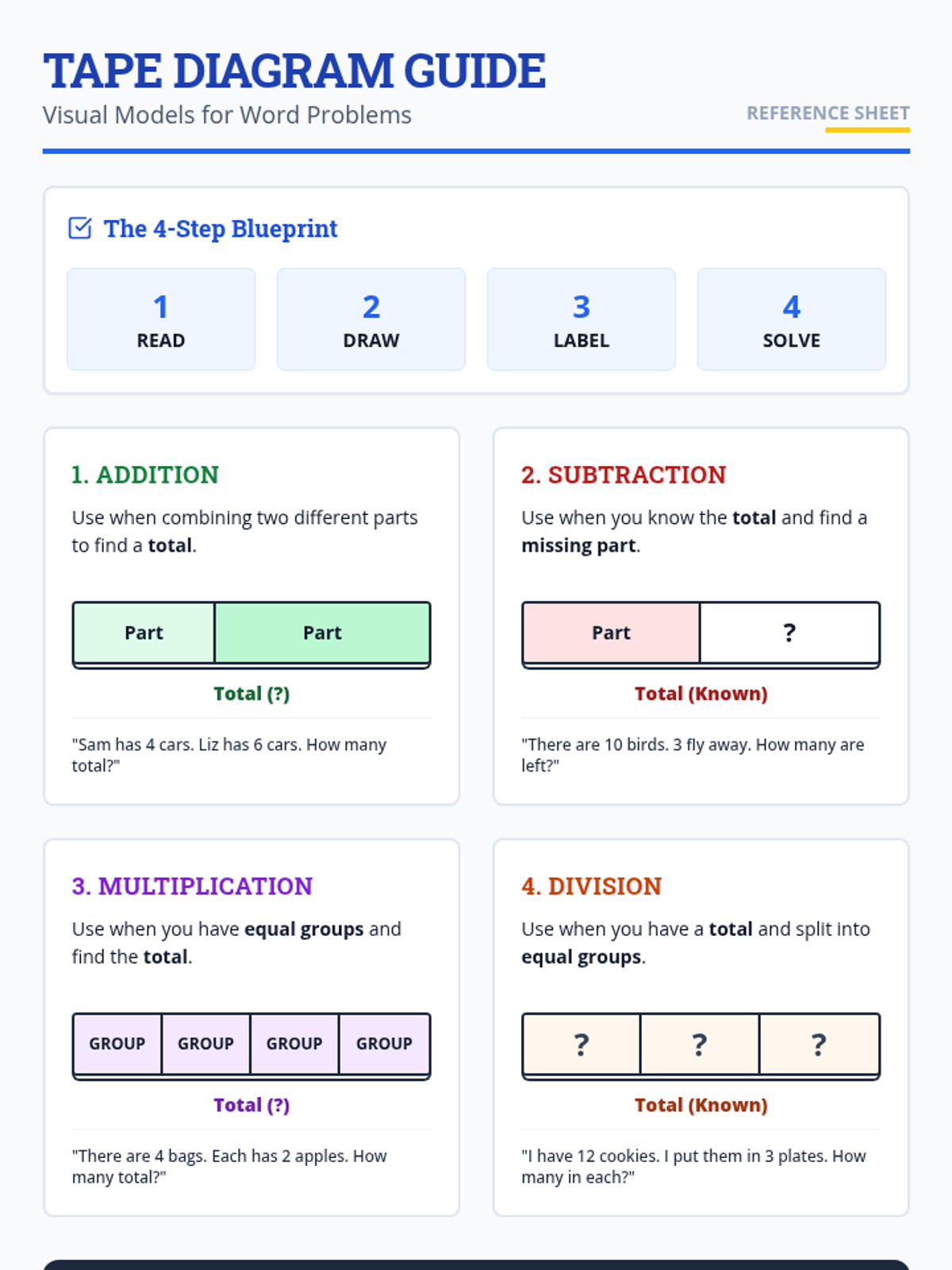A comprehensive toolkit for Special Education students to master word problems using tape diagrams across all four operations. The lesson focuses on visual scaffolding, consistent routines, and color-coded models to reduce cognitive load.