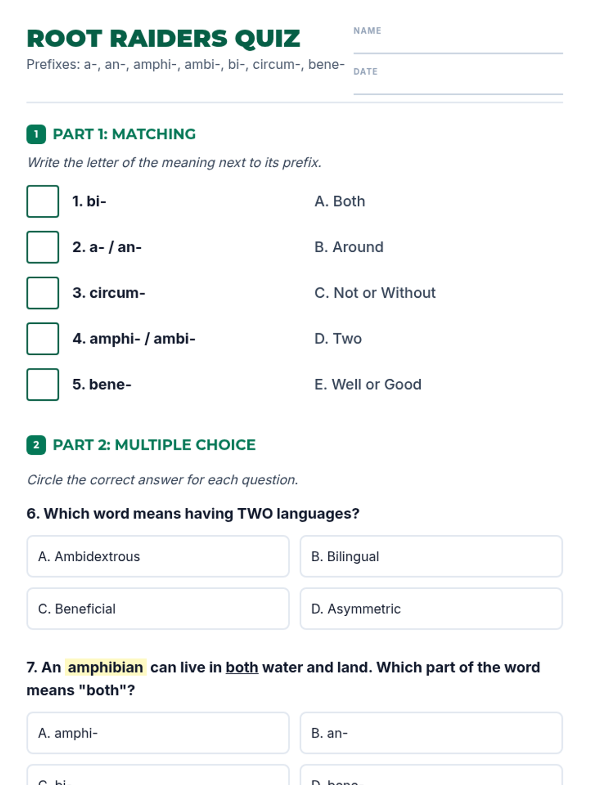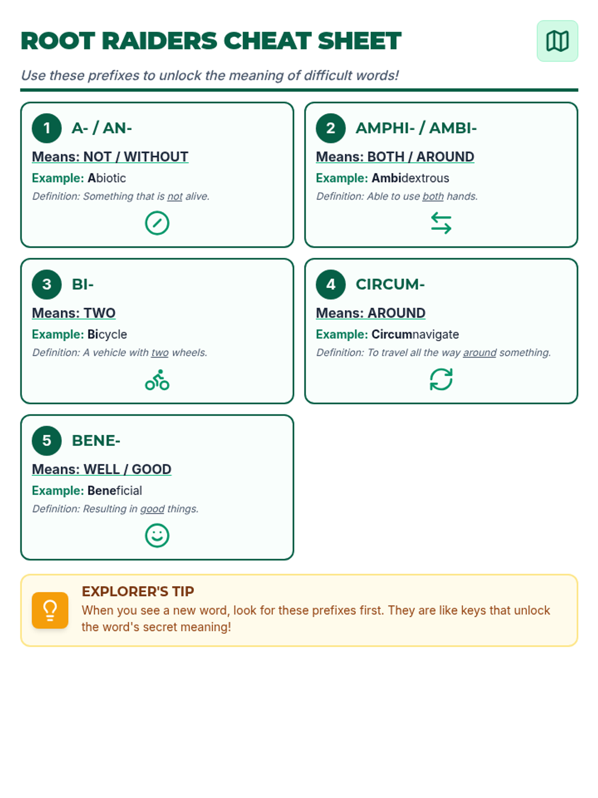 A high-interest, high-scaffold lesson focused on Greek and Latin roots (a-, an-, amphi-, ambi-, bi-, circum-) designed for students with learning disabilities. Includes a visual reference guide and a clear, accessible assessment.