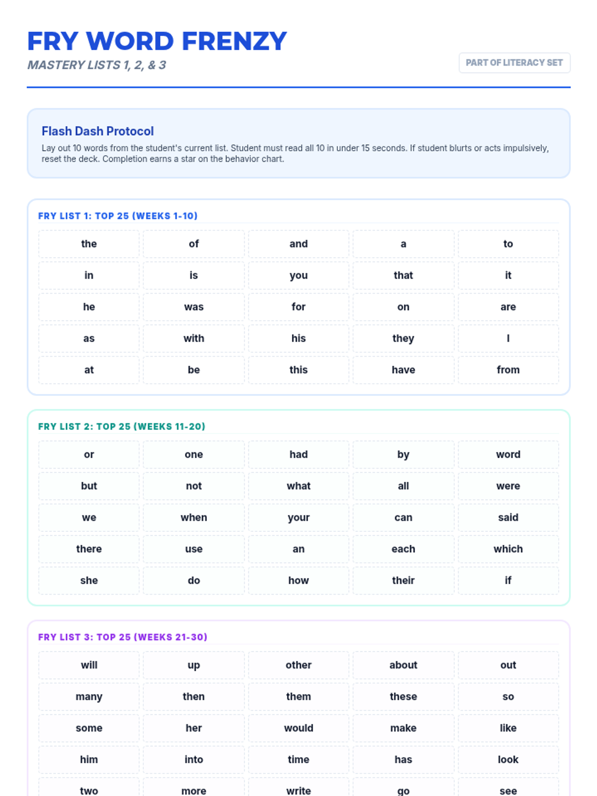 Introduces the target words through visual recognition and fine motor practice. Students engage with flashcards and tracing activities to build familiarity and spelling skills.