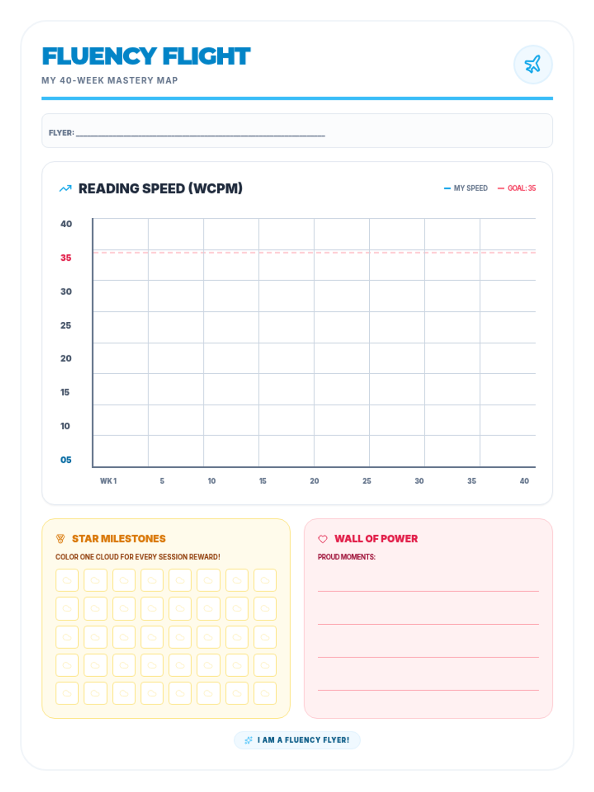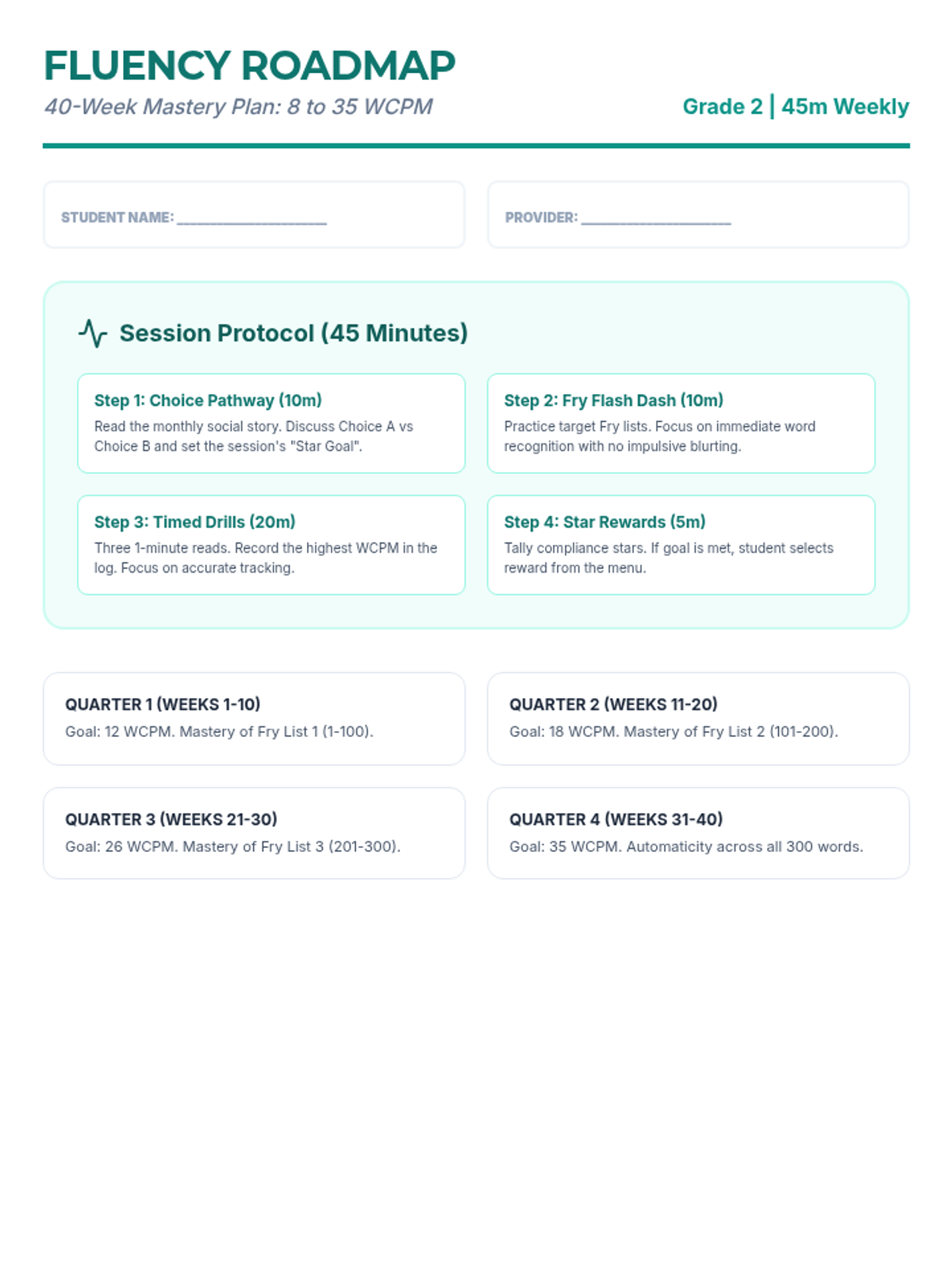 A comprehensive 40-week intervention program designed for a 2nd-grade student to improve reading fluency from 8 to 35 WCPM, master Fry words 1-3, and develop impulse control through social stories and behavior tracking.