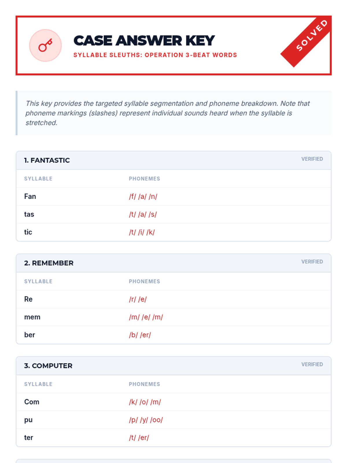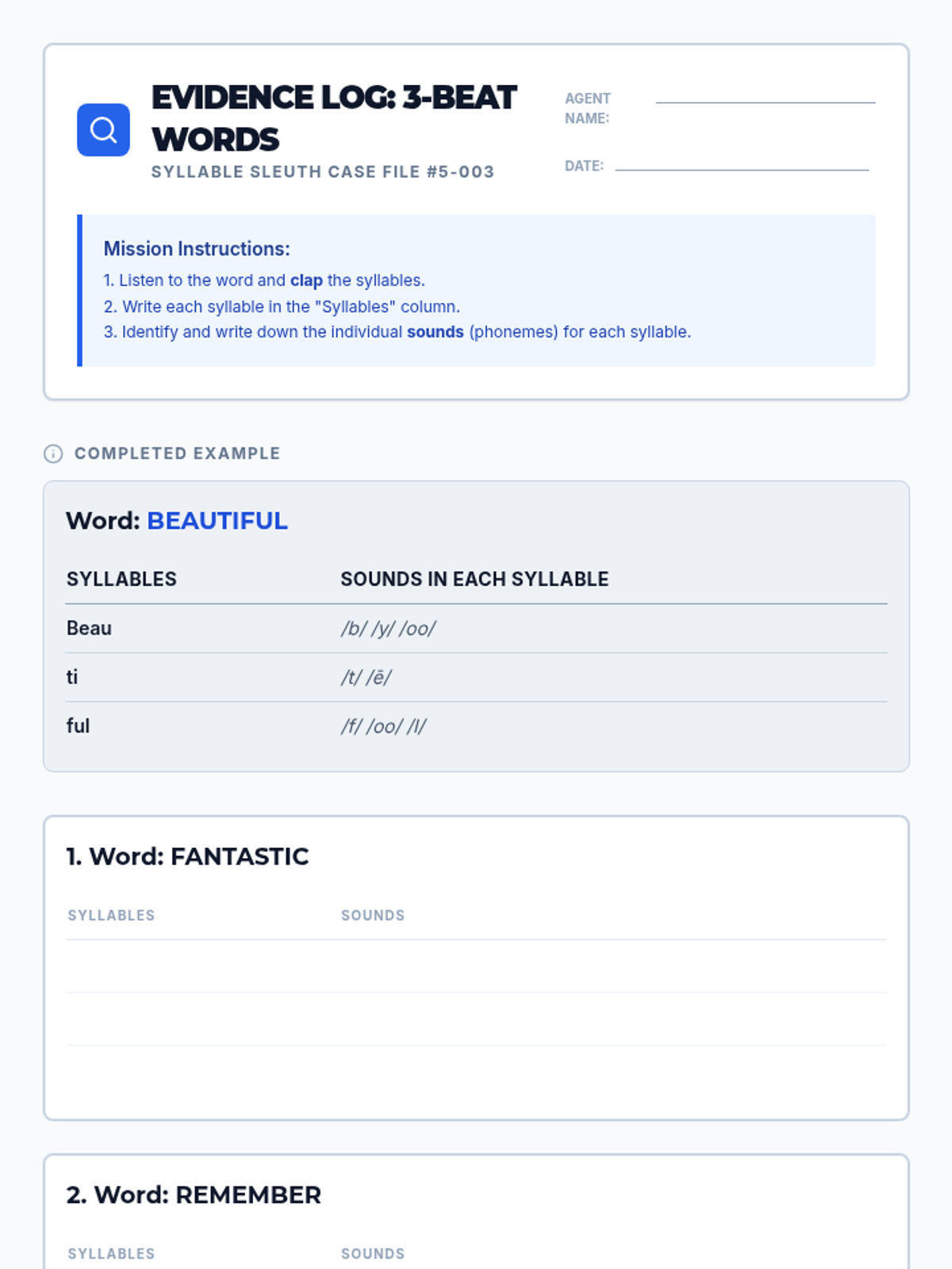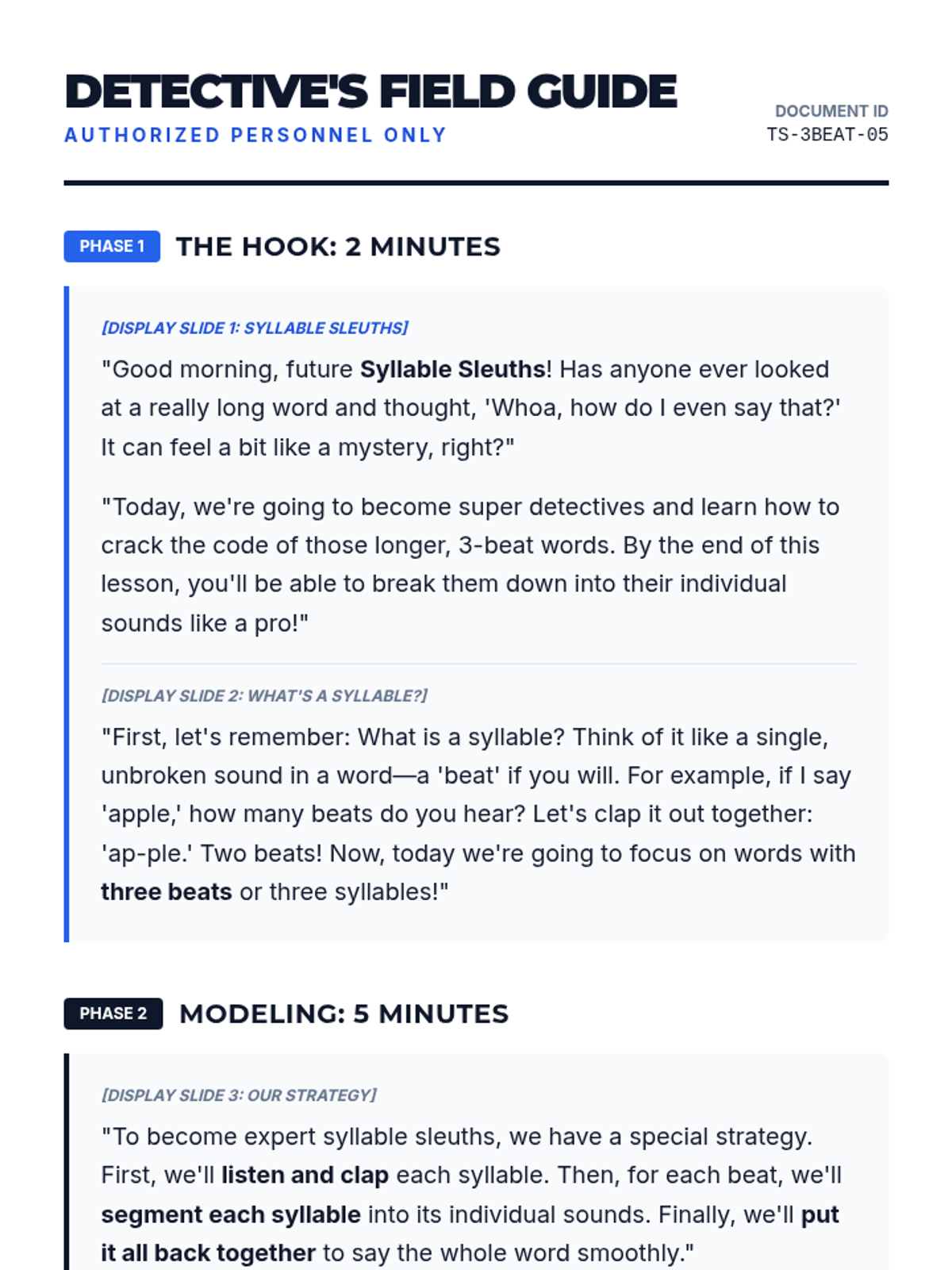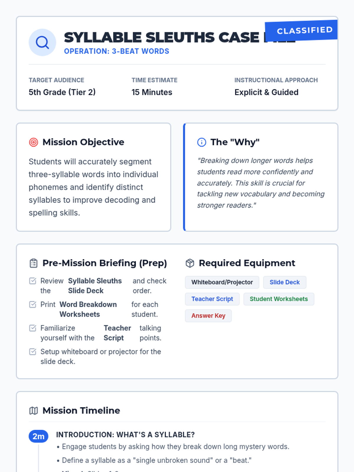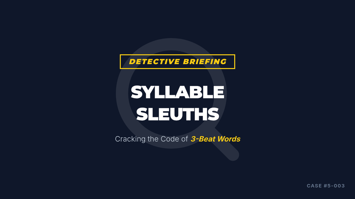 A 15-minute Tier 2 intervention for 5th graders focused on segmenting three-syllable words into phonemes to improve decoding and spelling. Students act as 'Syllable Sleuths' to solve the mystery of long words using a clap-and-segment strategy.
