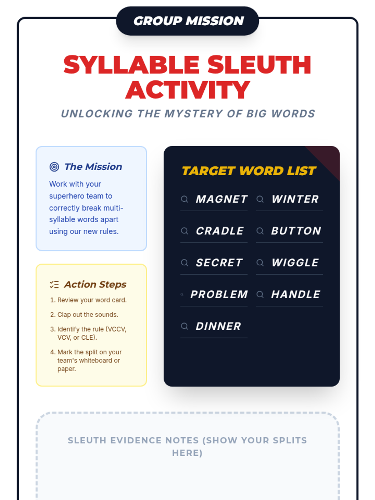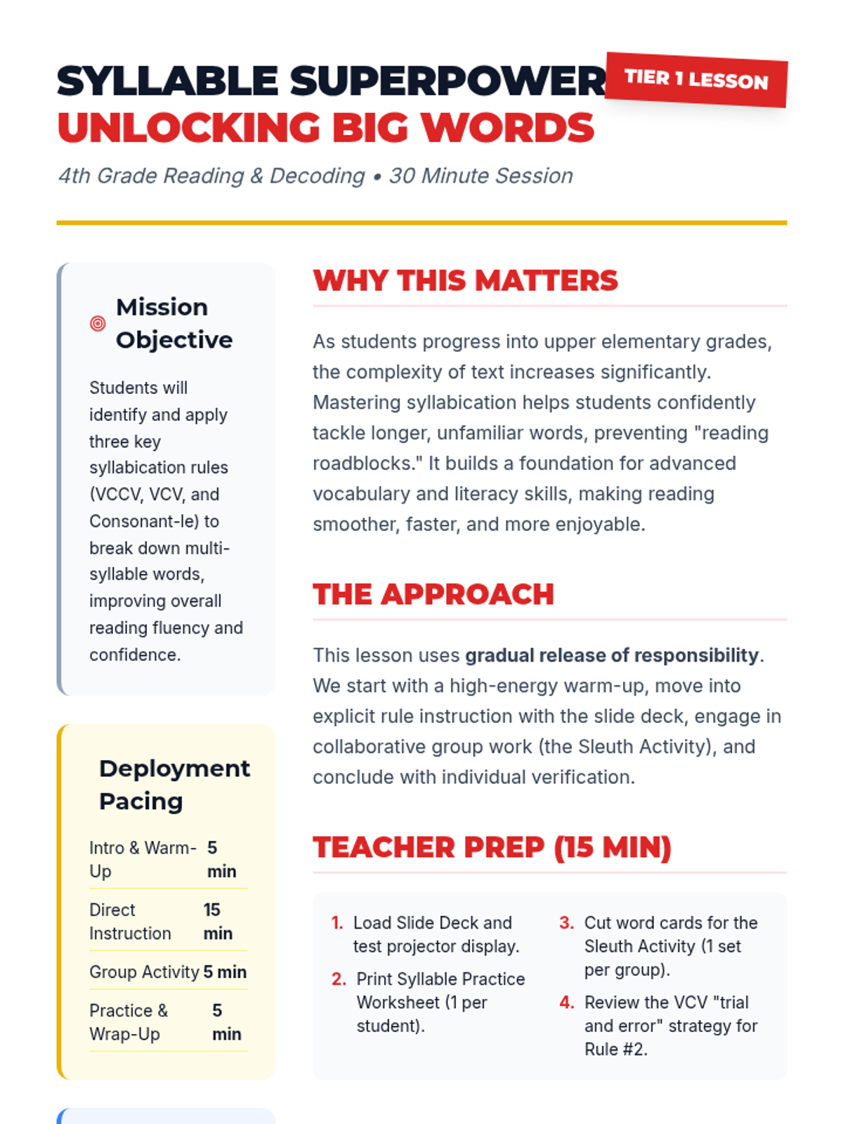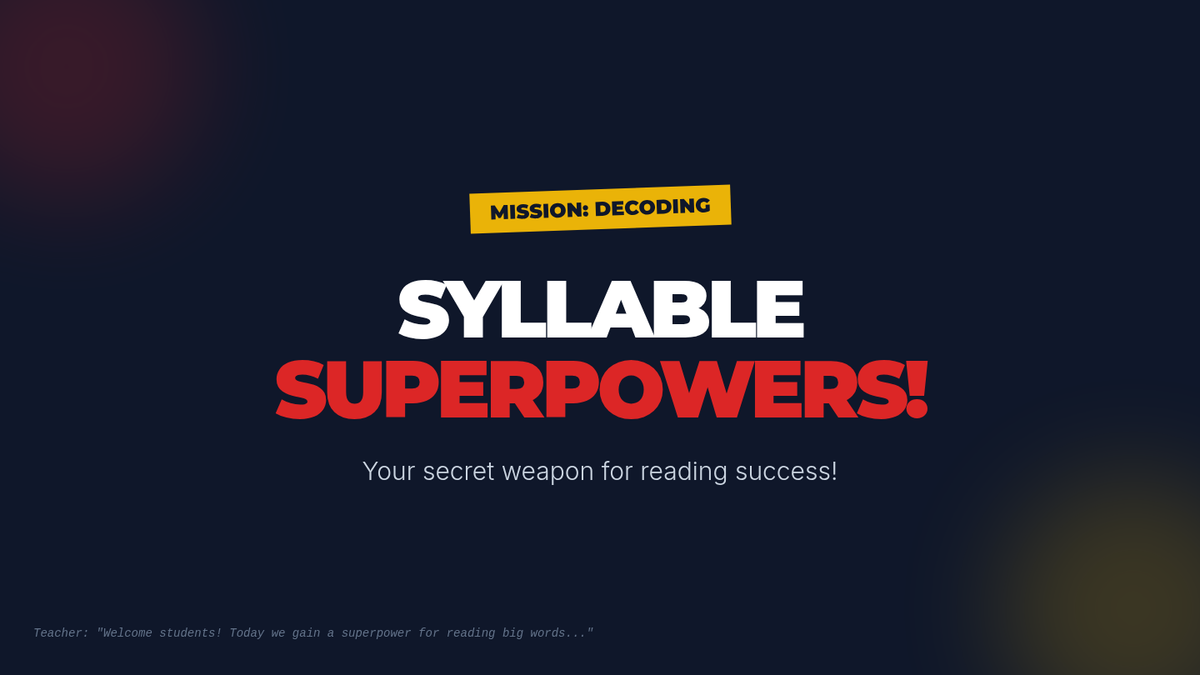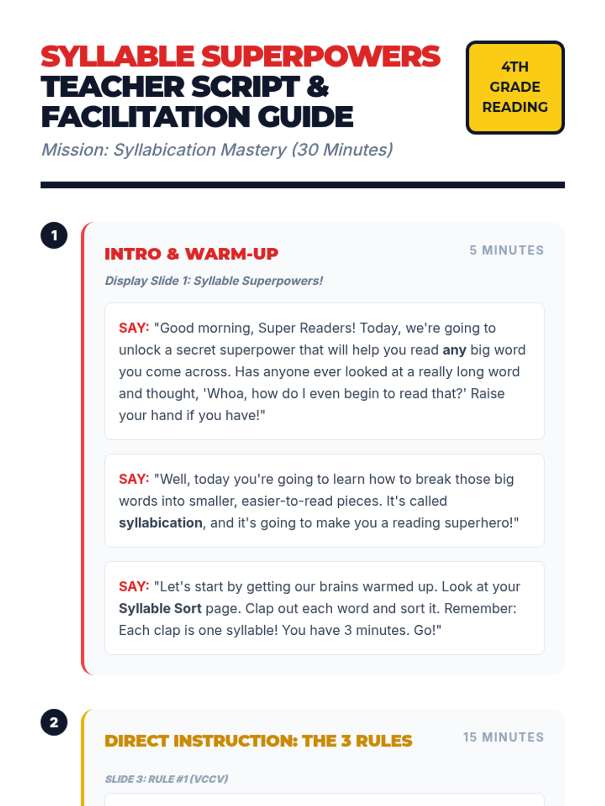 A 30-minute phonics and reading lesson for 4th graders focused on mastering three key syllabication rules (VCCV, VCV, and Consonant-le) through a superhero-themed interactive presentation and guided practice.