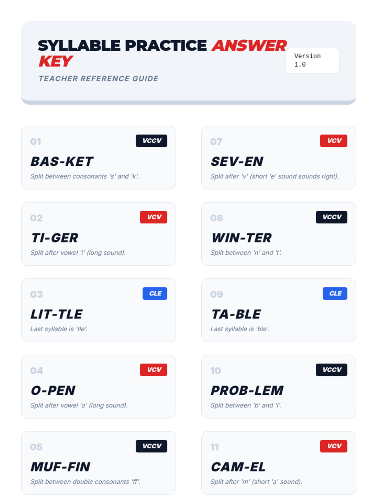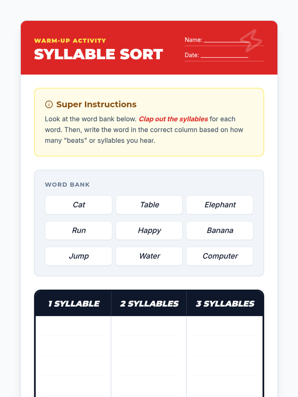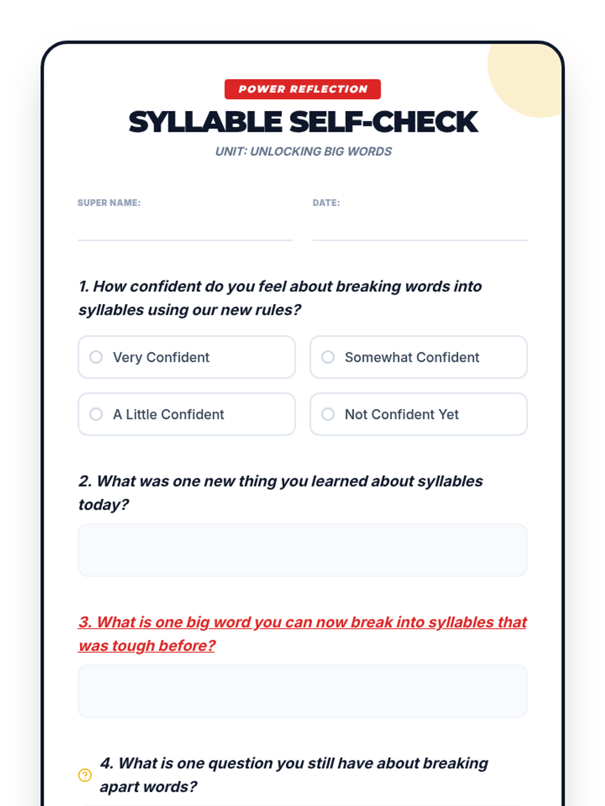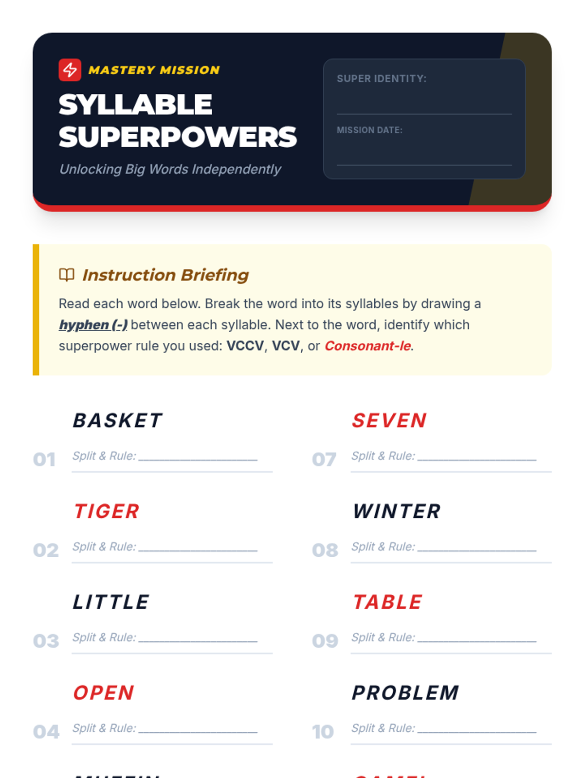 A 30-minute phonics and reading lesson for 4th graders focused on mastering three key syllabication rules (VCCV, VCV, and Consonant-le) through a superhero-themed interactive presentation and guided practice.