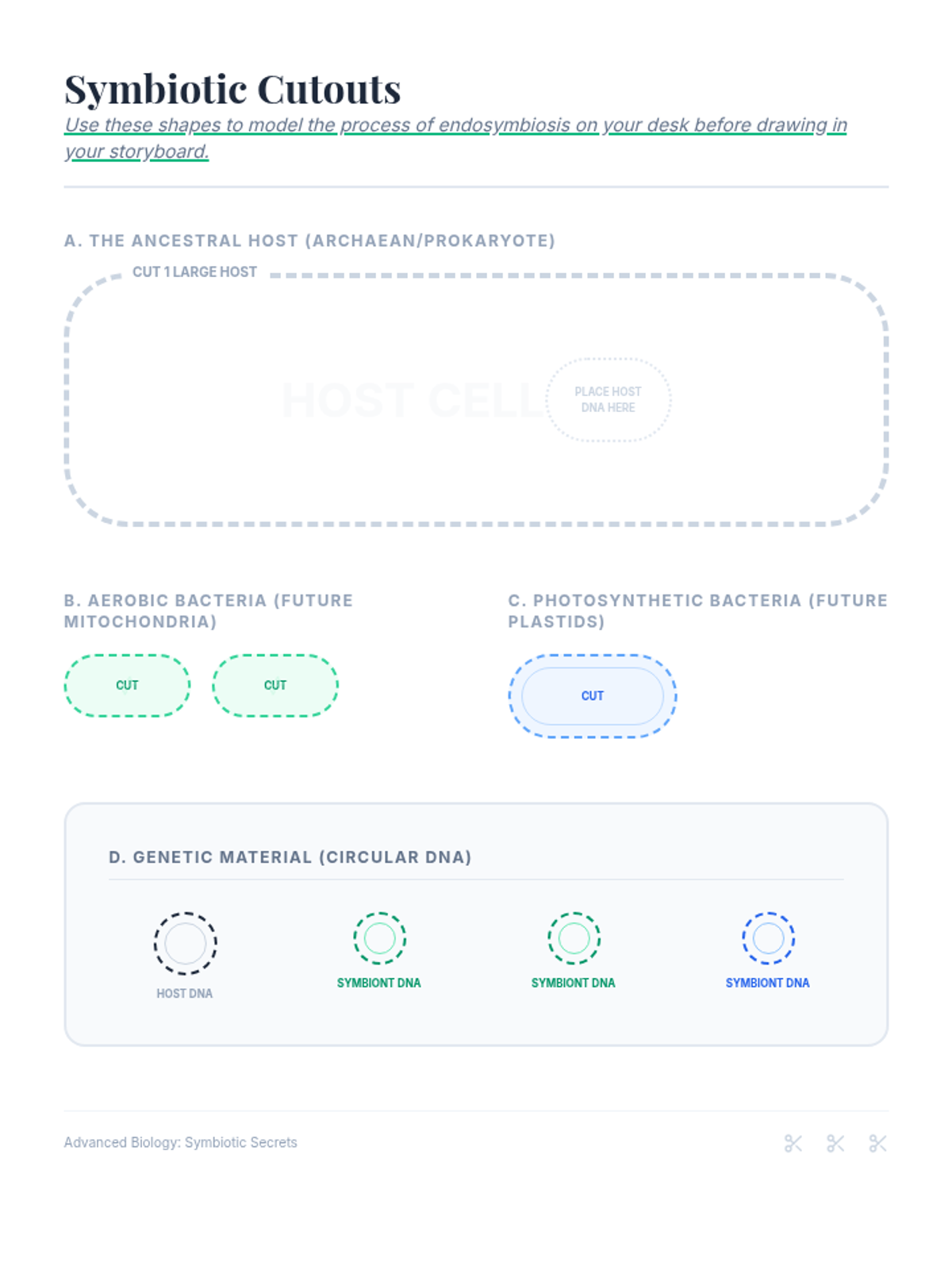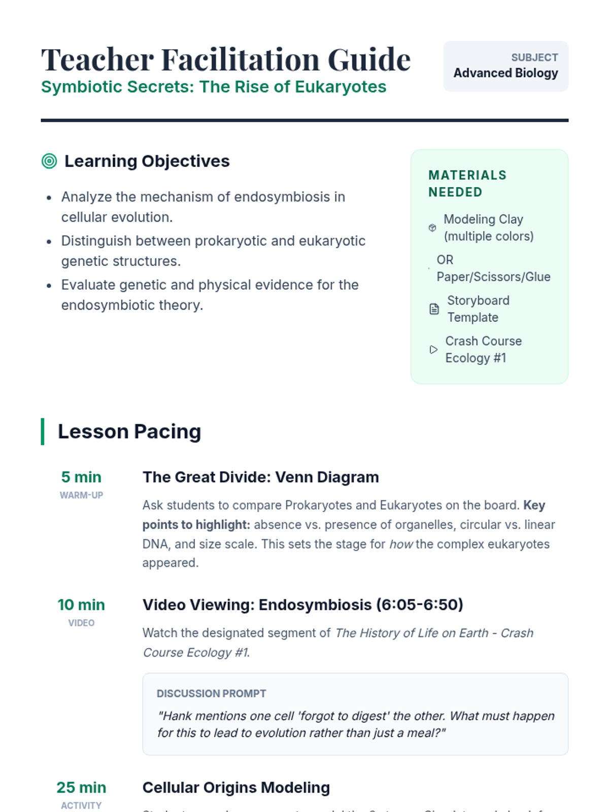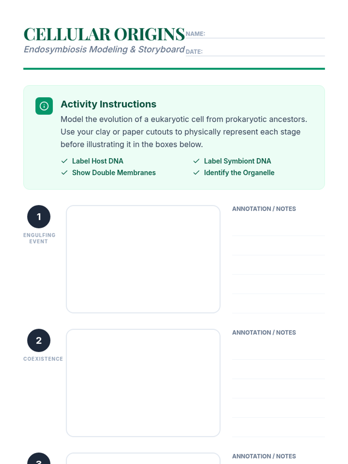 In this lesson, students analyze the theory of endosymbiosis and the evolution of eukaryotic cells from prokaryotic ancestors. They model the process through a storyboard activity and explore the genetic evidence for this evolutionary leap.