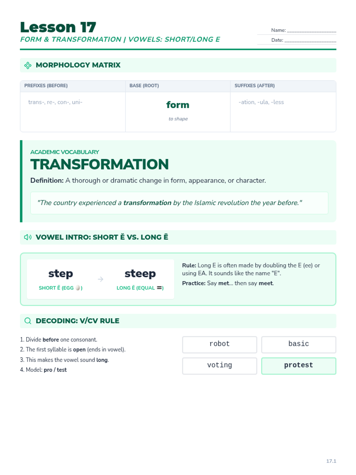 An intervention lesson focusing on morphology (form), academic vocabulary (transformation), and explicit instruction in short vs long E sounds. Includes a reading passage on shaping a country and structured writing practice.