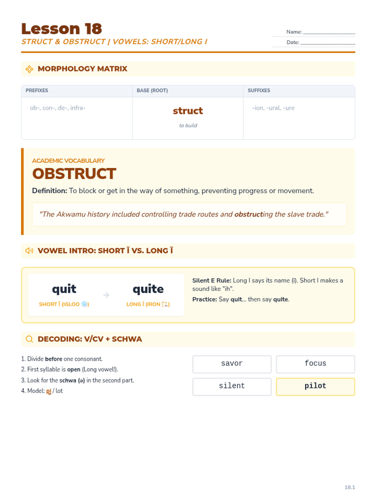 Focuses on the root 'struct', the vocabulary word 'obstruct', and Short/Long I sounds. Students analyze how obstructions block progress in both physical and social contexts.