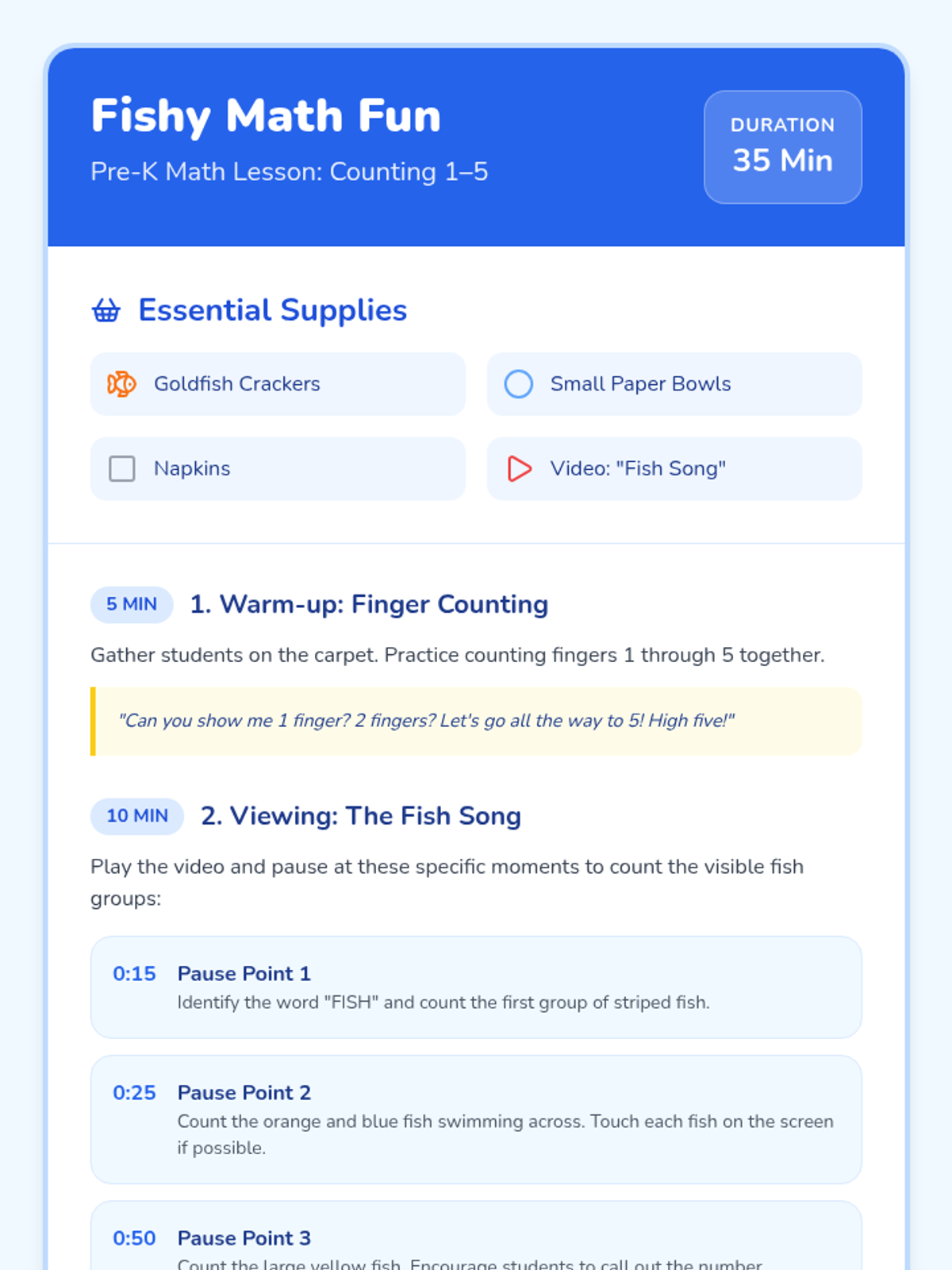 A Pre-K math lesson centered on counting 1-5 using a fun fish song, visual groups of fish, and hands-on practice with goldfish crackers. Students will practice one-to-one correspondence and group recognition through video observation and tactile activity.