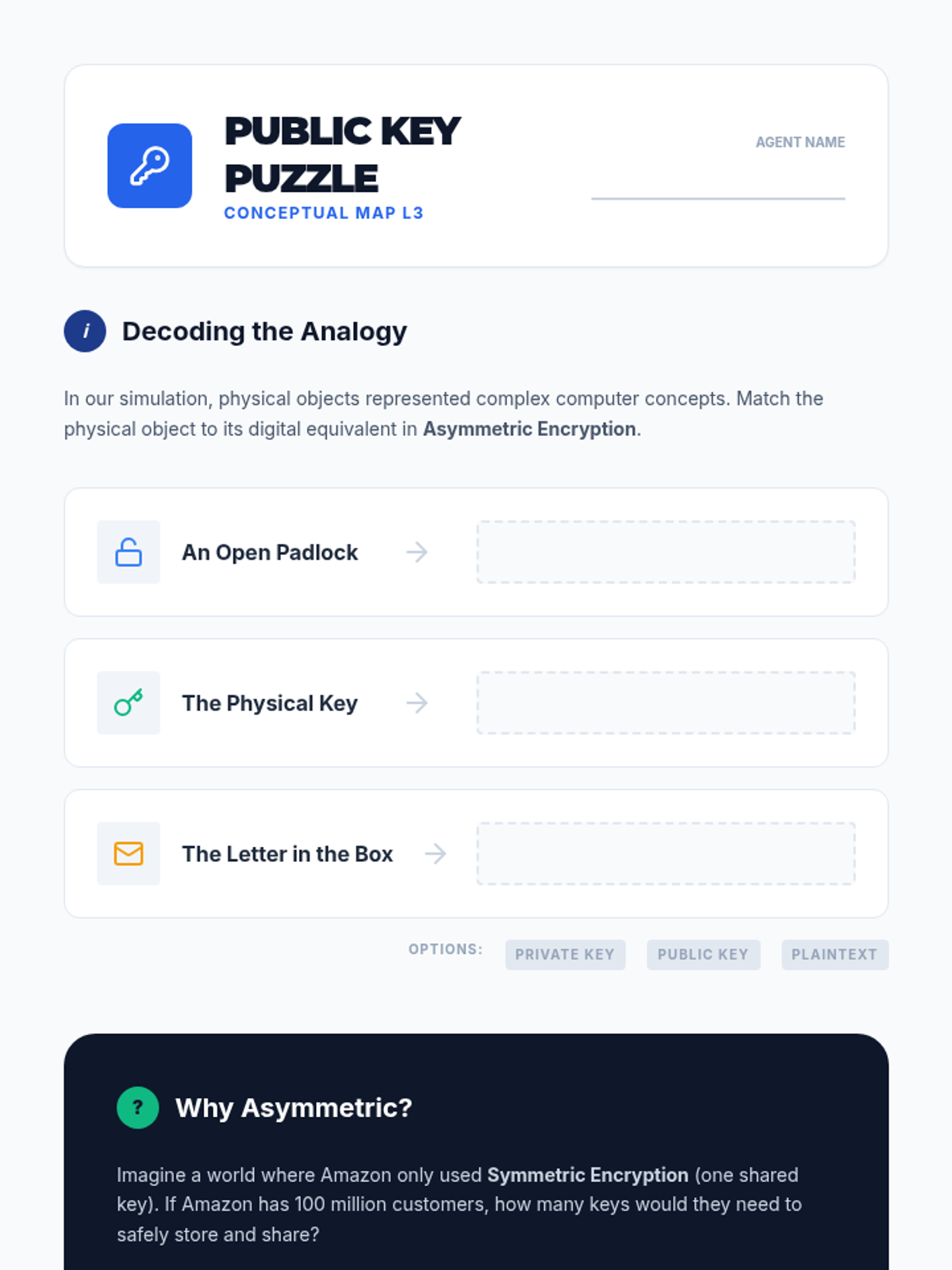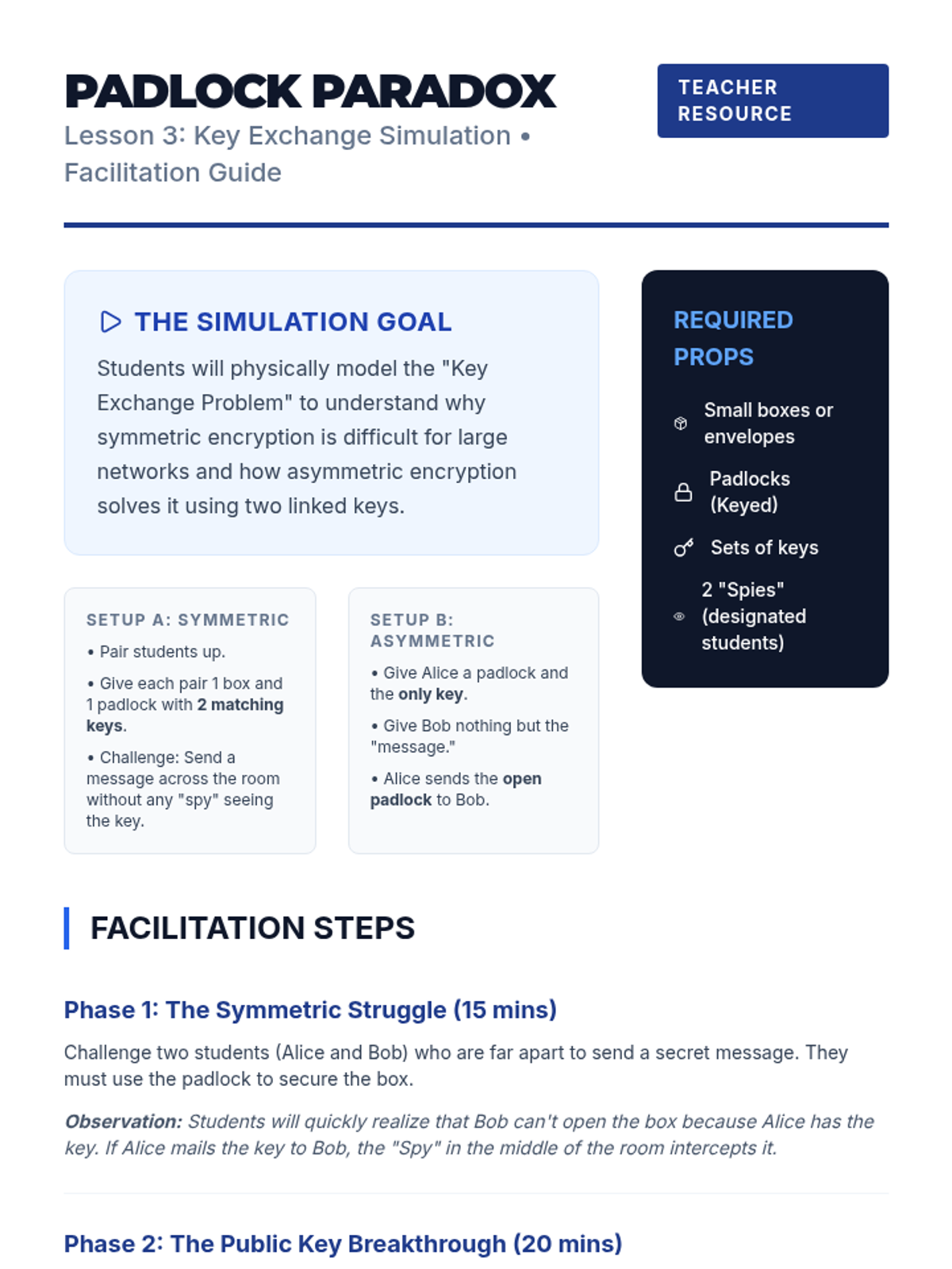 Students participate in a physical simulation to understand the problem of sharing keys safely and model how public-key encryption allows secure communication without pre-shared keys.
