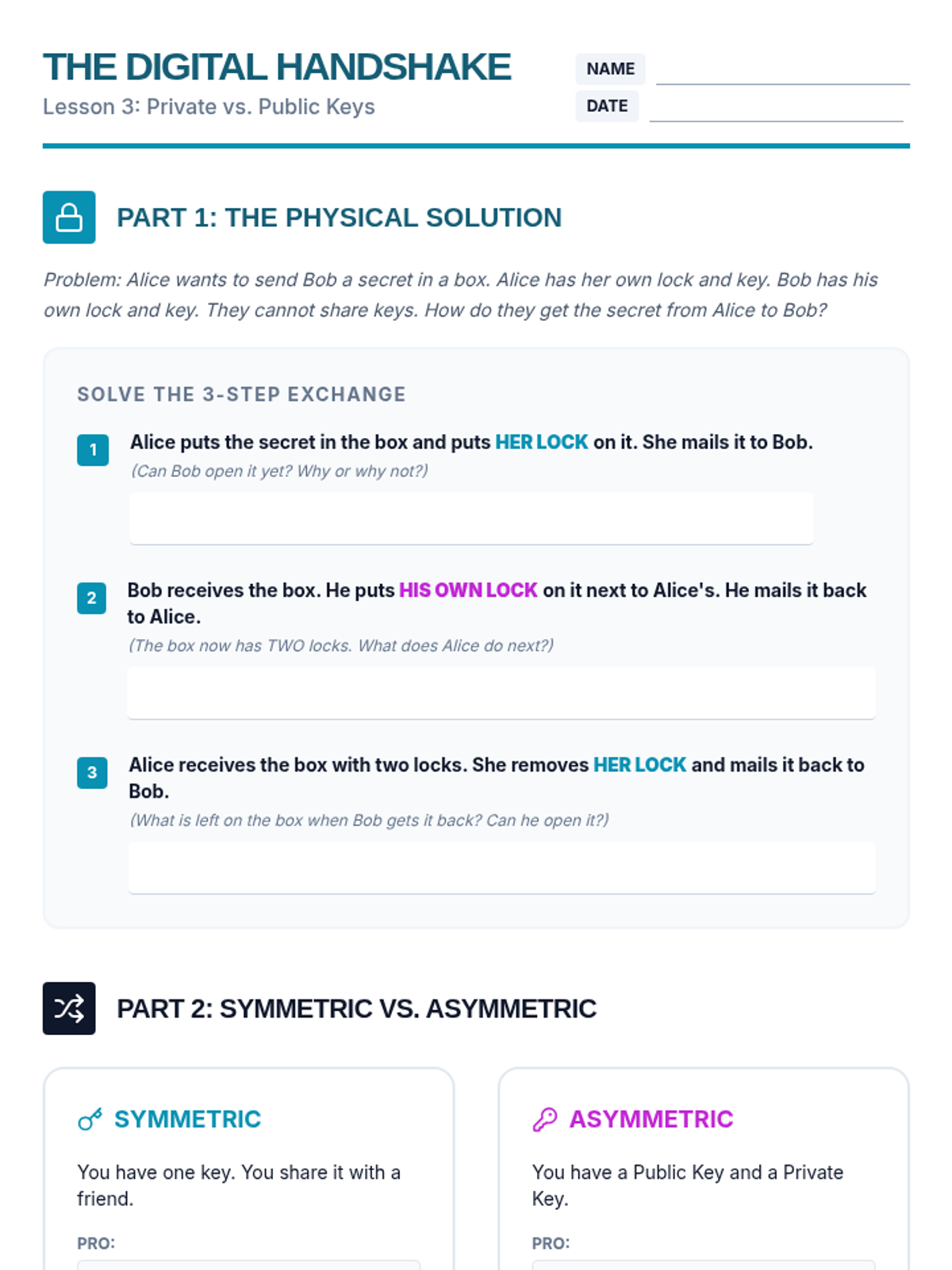 Students transition from manual codes to digital concepts, participating in a physical simulation to understand the difference between private-key (symmetric) and public-key (asymmetric) encryption.