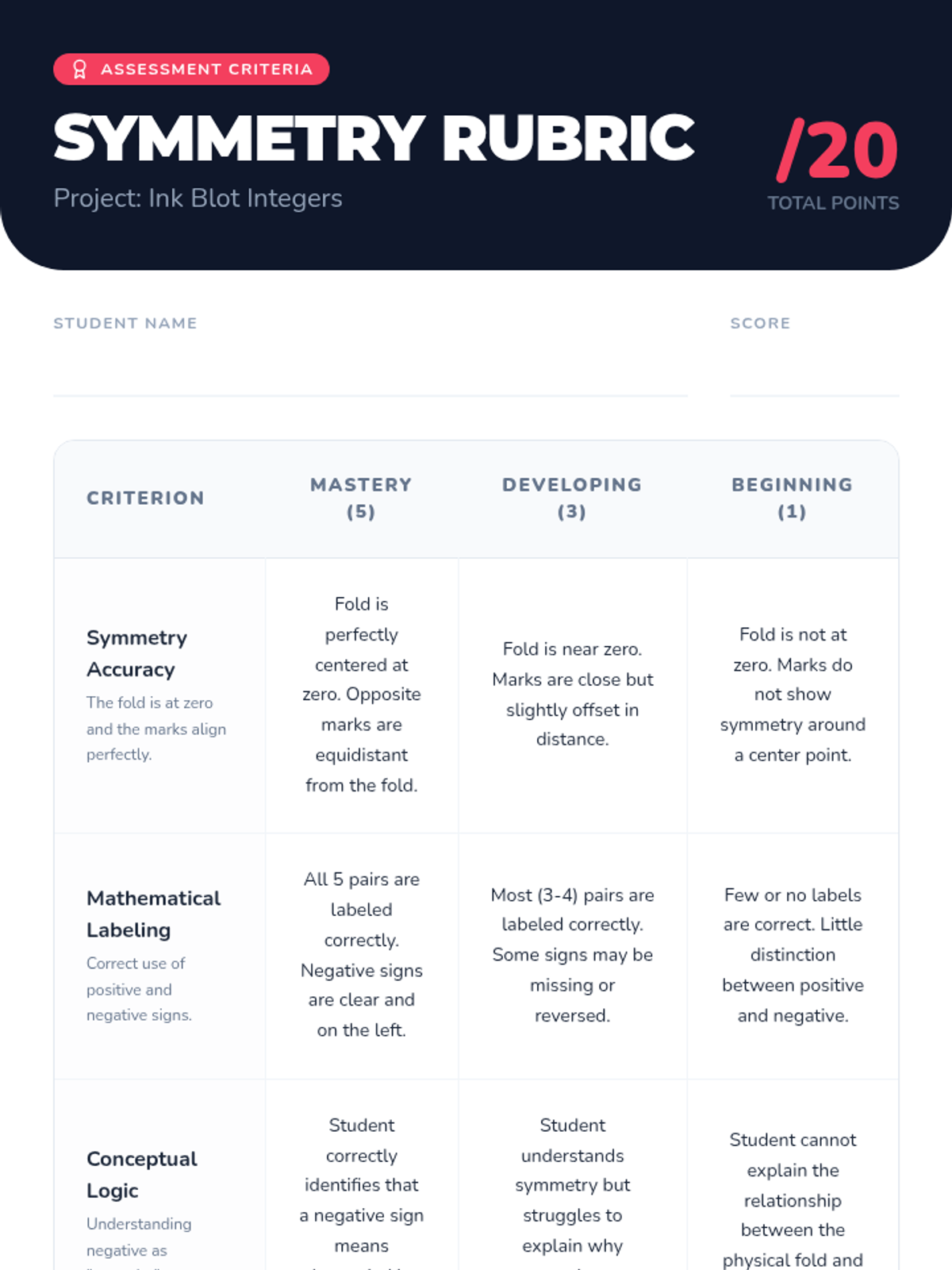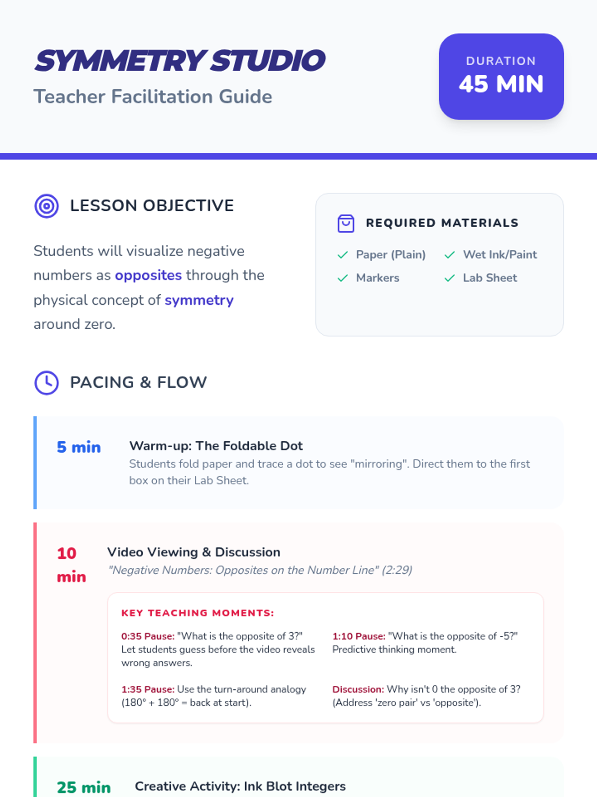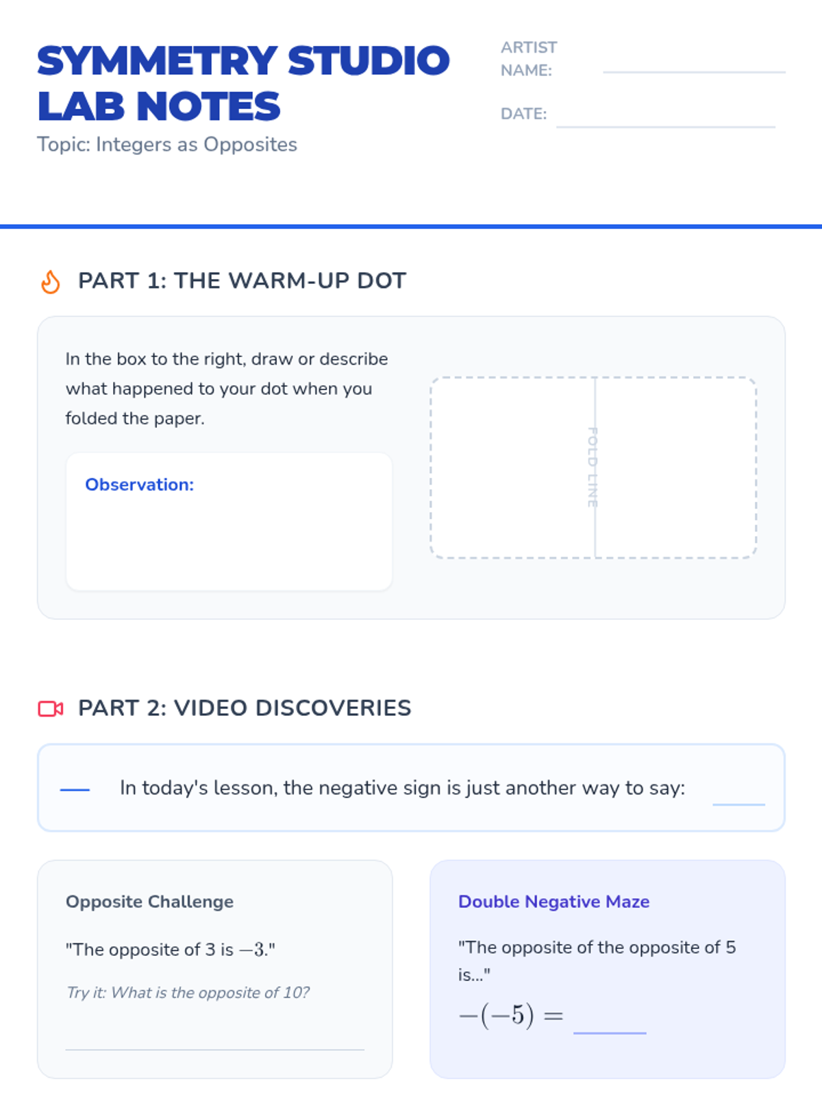 A visual math lesson for 6th graders to understand negative numbers as opposites using symmetry, physical paper folding, and wet ink transfers.