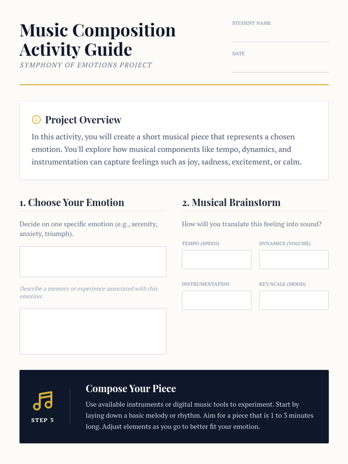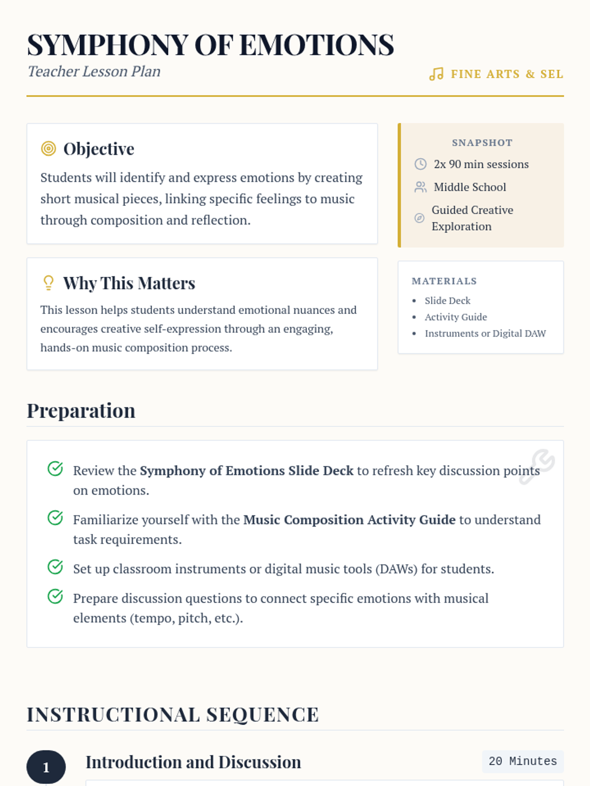 A lesson that explores the connection between music and human emotions, guiding middle school students through the process of composing short musical pieces that represent specific feelings.