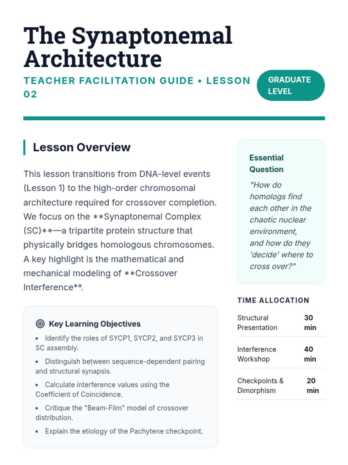 Investigate the structural proteins of the synaptonemal complex, the mechanics of homologous pairing, and the mathematical modeling of crossover interference.
