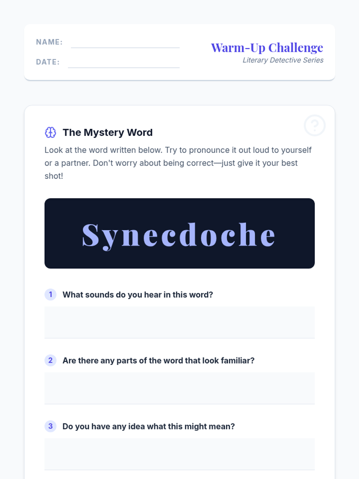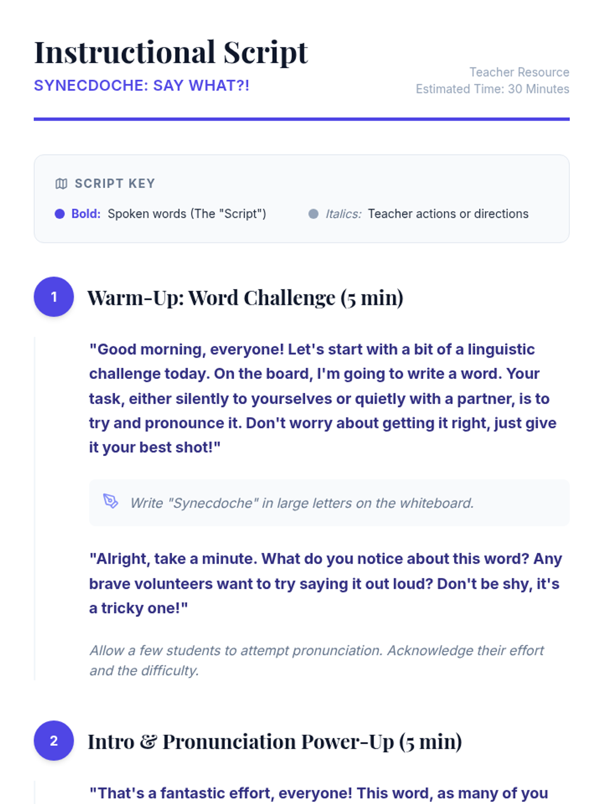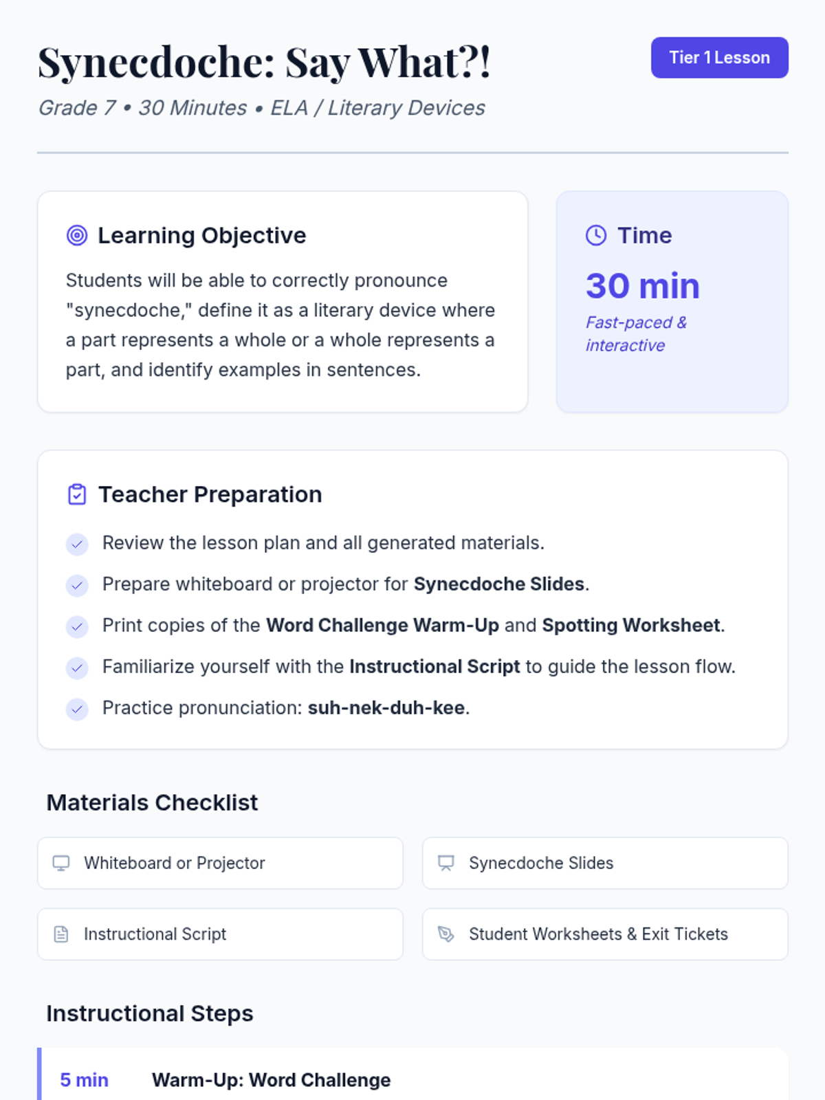 This lesson introduces 7th-grade students to the literary device of synecdoche, focusing on its pronunciation and meaning. Students will learn to identify and understand how parts can represent wholes (and vice versa) in everyday language and literature, enhancing their comprehension and analytical skills.