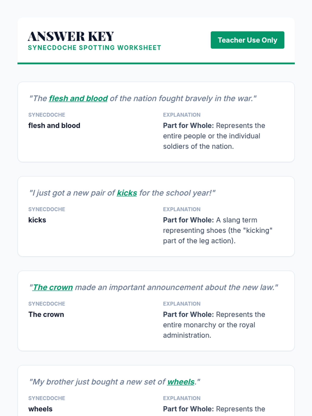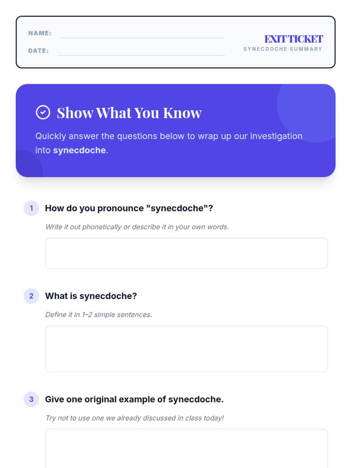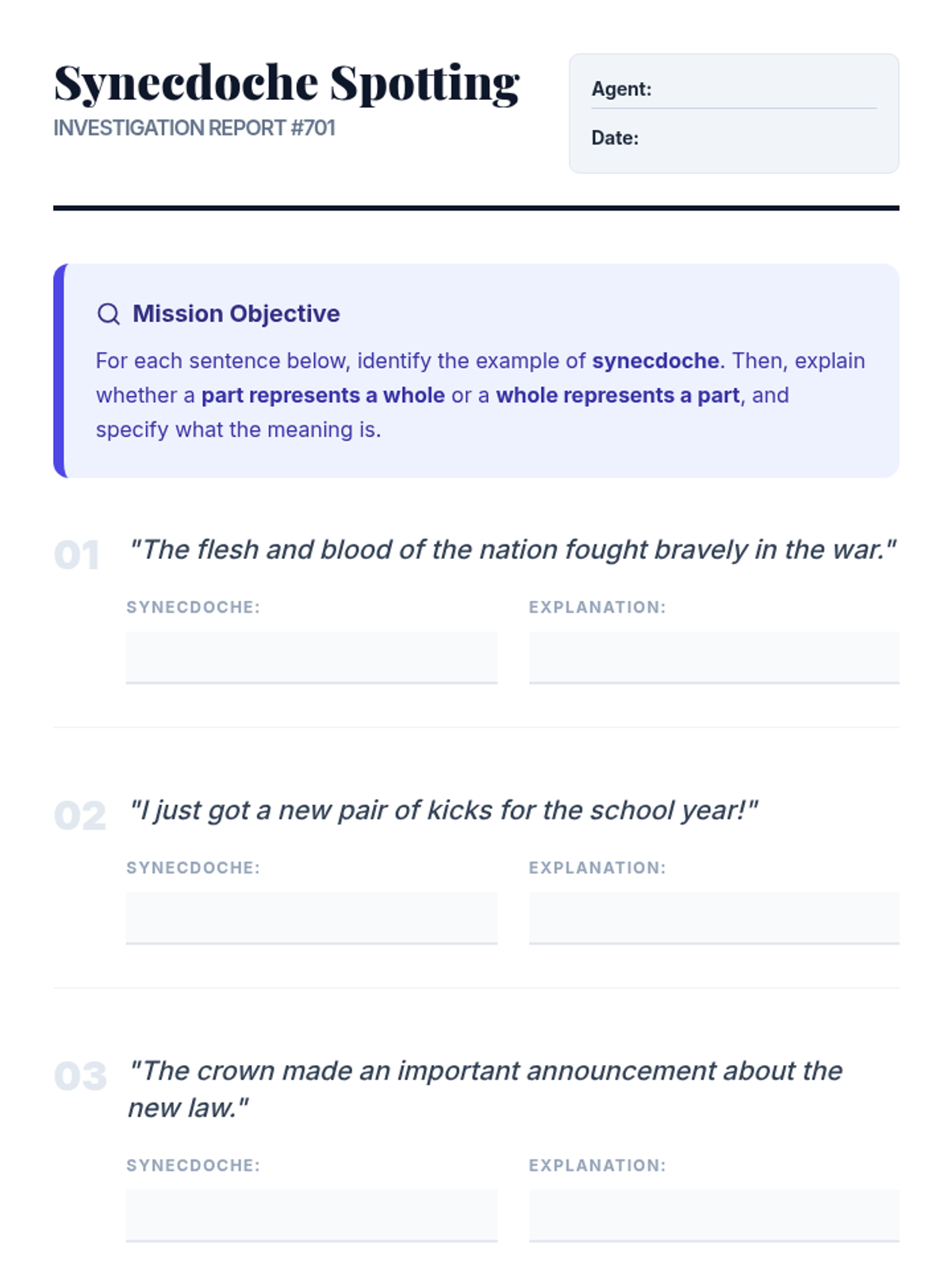 This lesson introduces 7th-grade students to the literary device of synecdoche, focusing on its pronunciation and meaning. Students will learn to identify and understand how parts can represent wholes (and vice versa) in everyday language and literature, enhancing their comprehension and analytical skills.