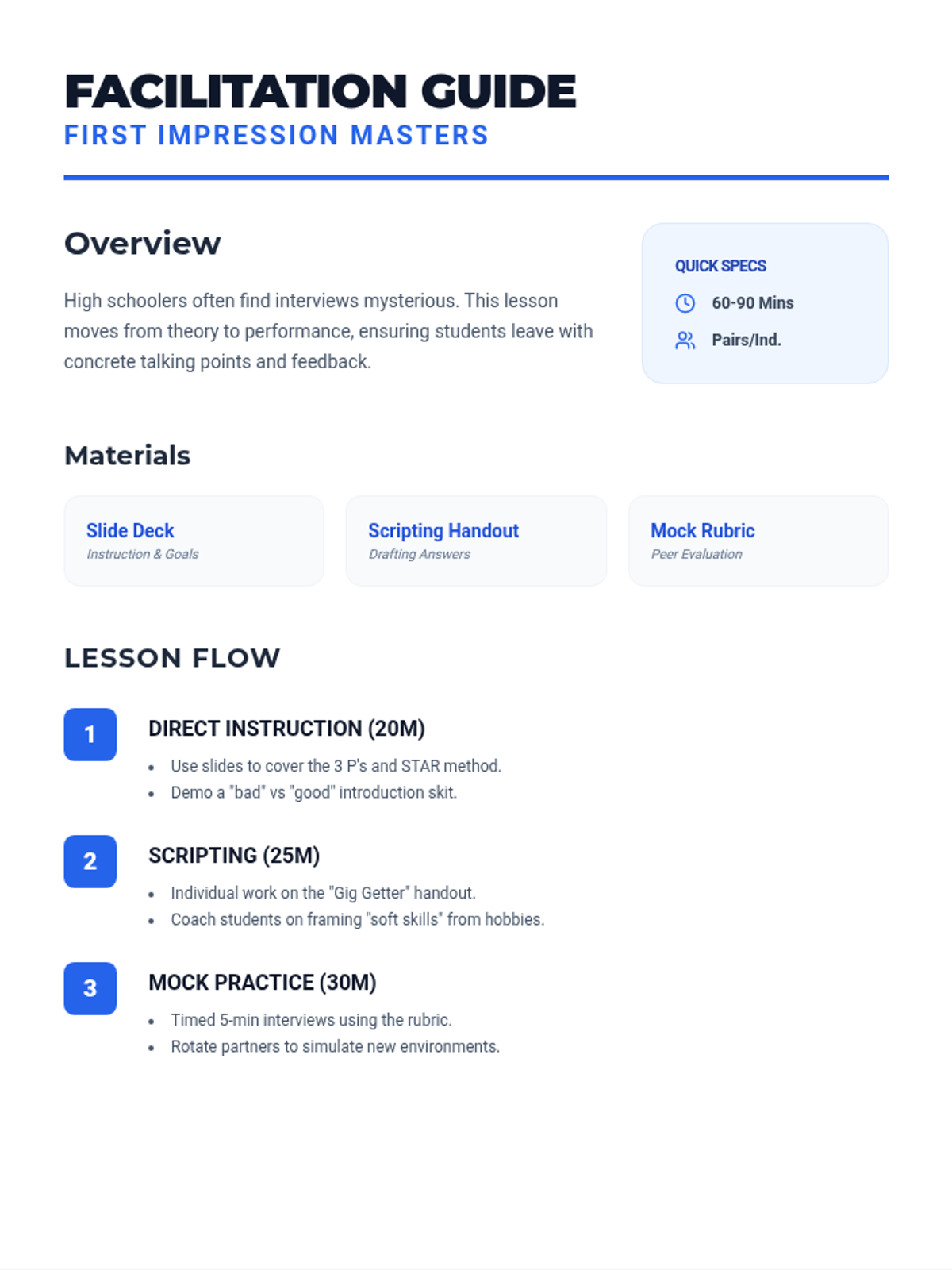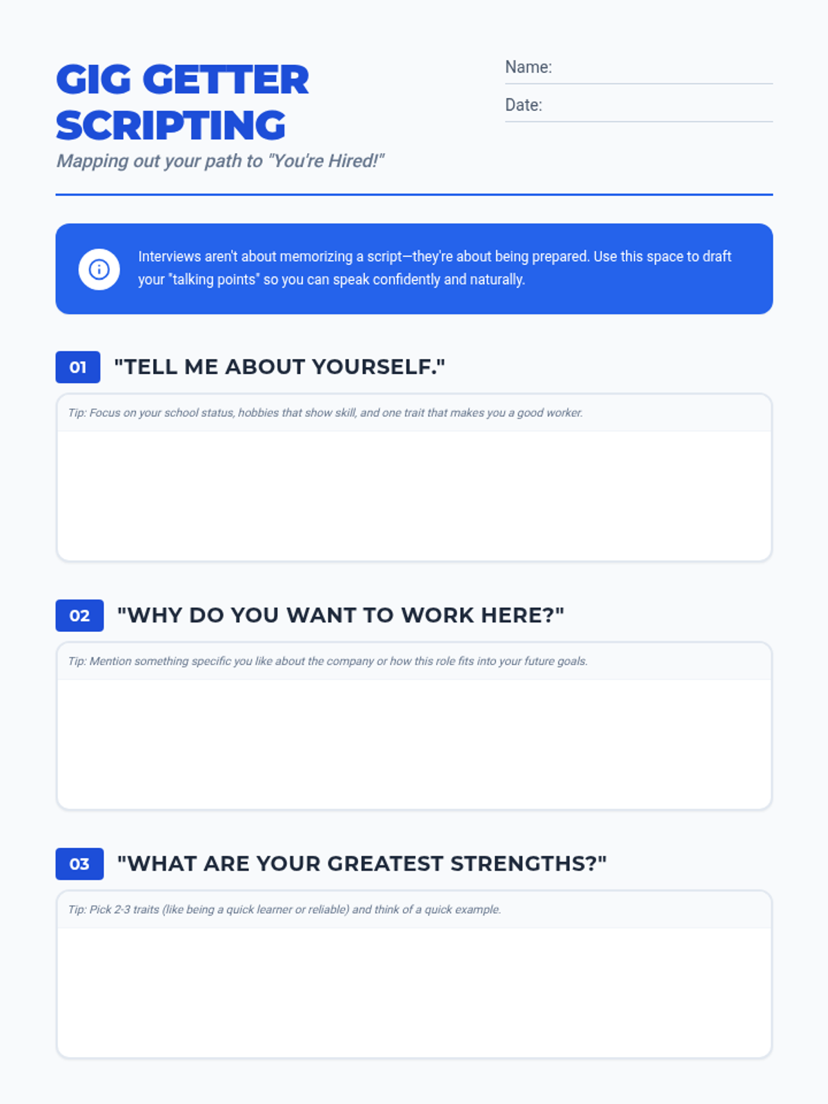 A comprehensive guide for high schoolers to master their first job interviews. Includes scripting practice for common questions and visual guides for professional presentation.