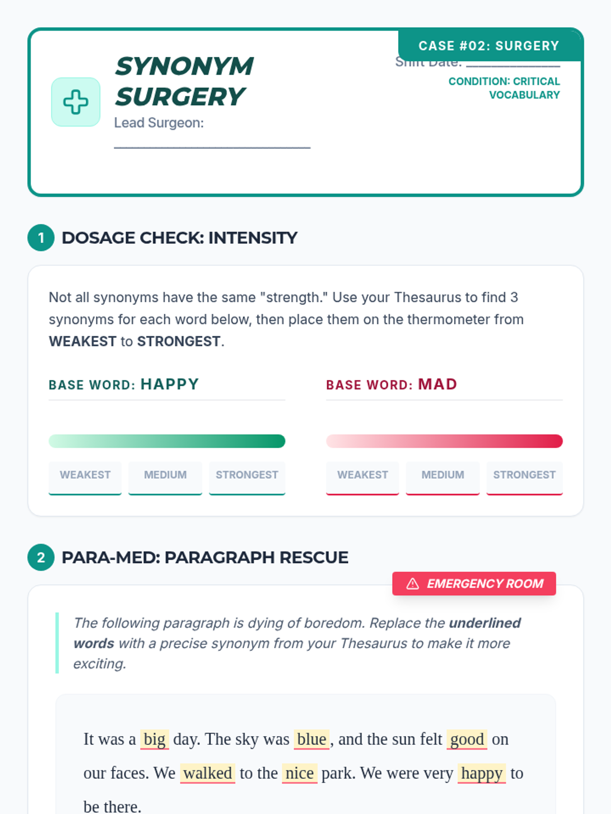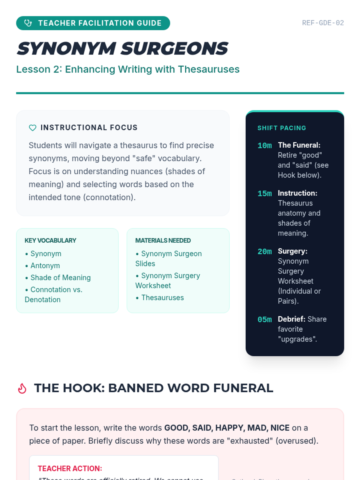 Learners explore the thesaurus to replace overused words with precise synonyms, focusing on shades of meaning and connotation.