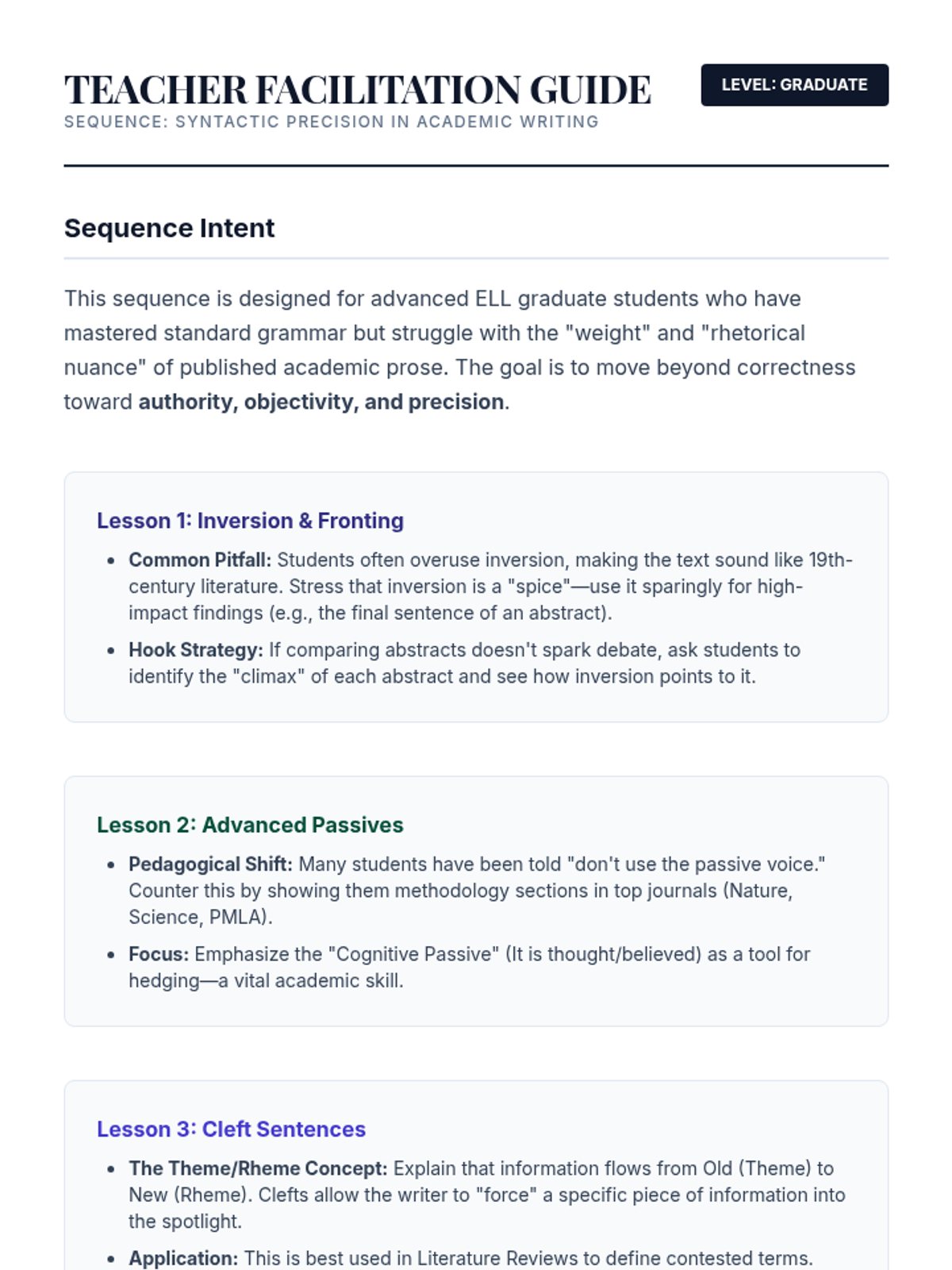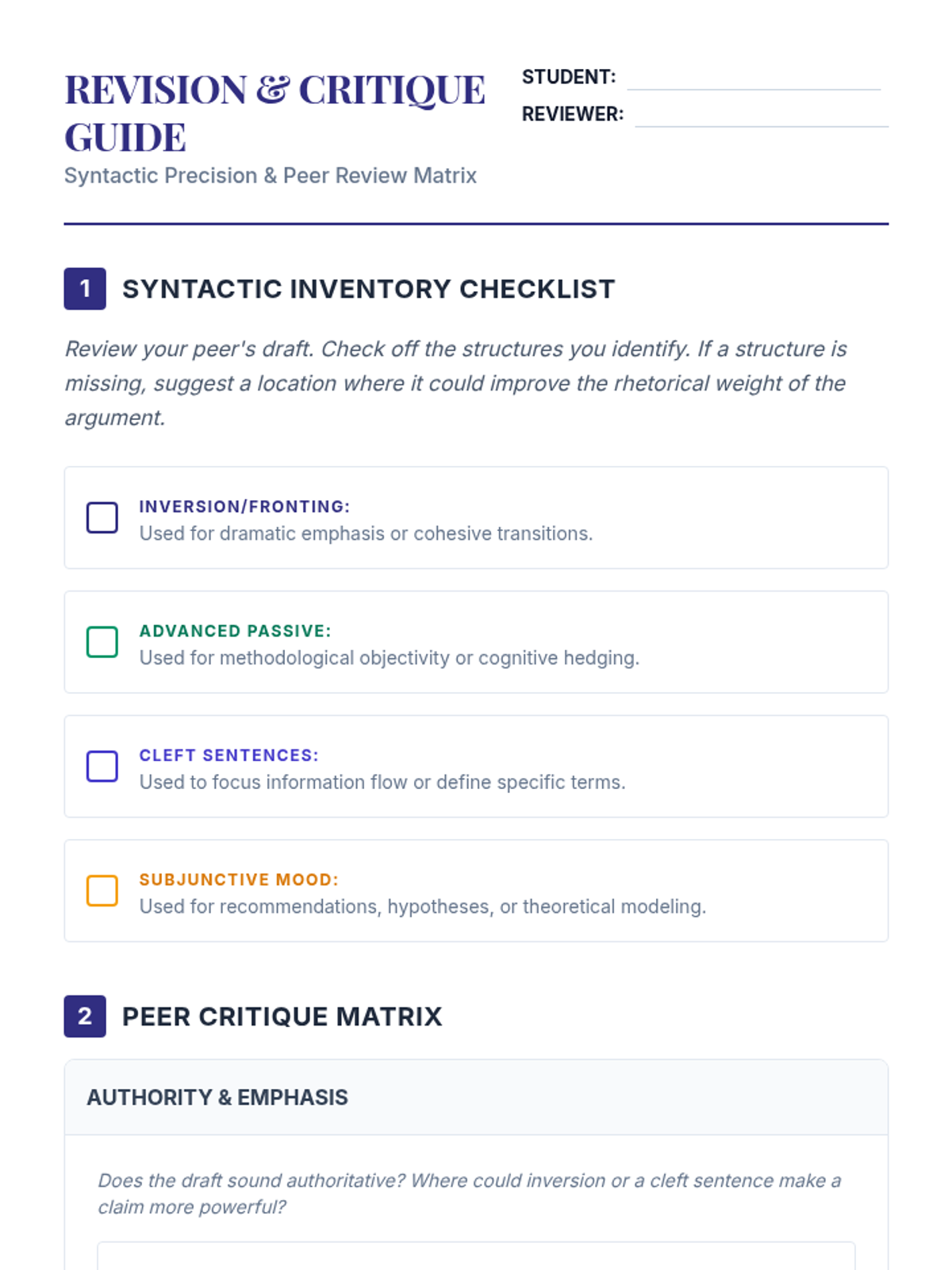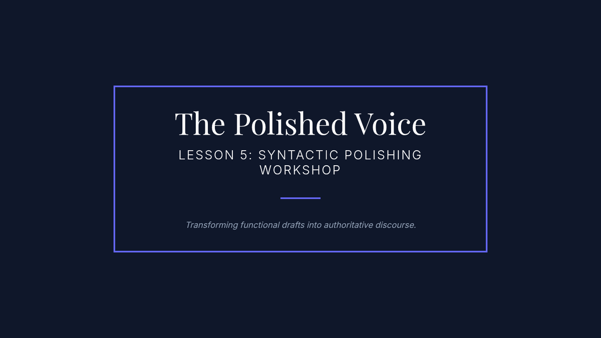 A culminating session where students apply advanced grammar concepts to their own research drafts. Peer reviews focus on syntactic variety, flow, and the strategic use of complex structures.