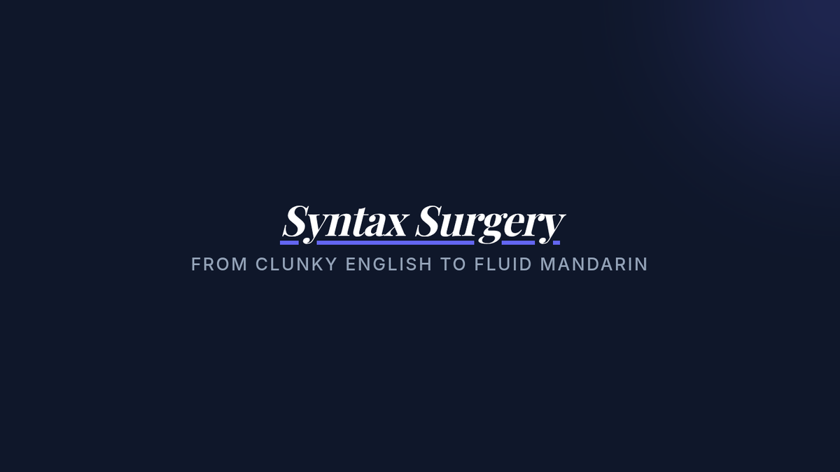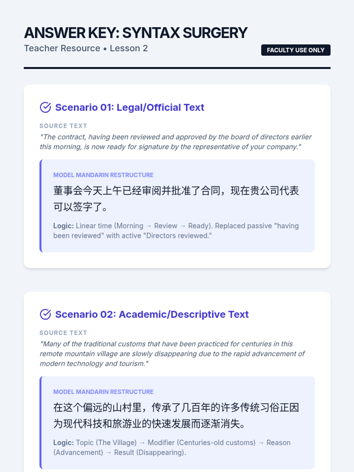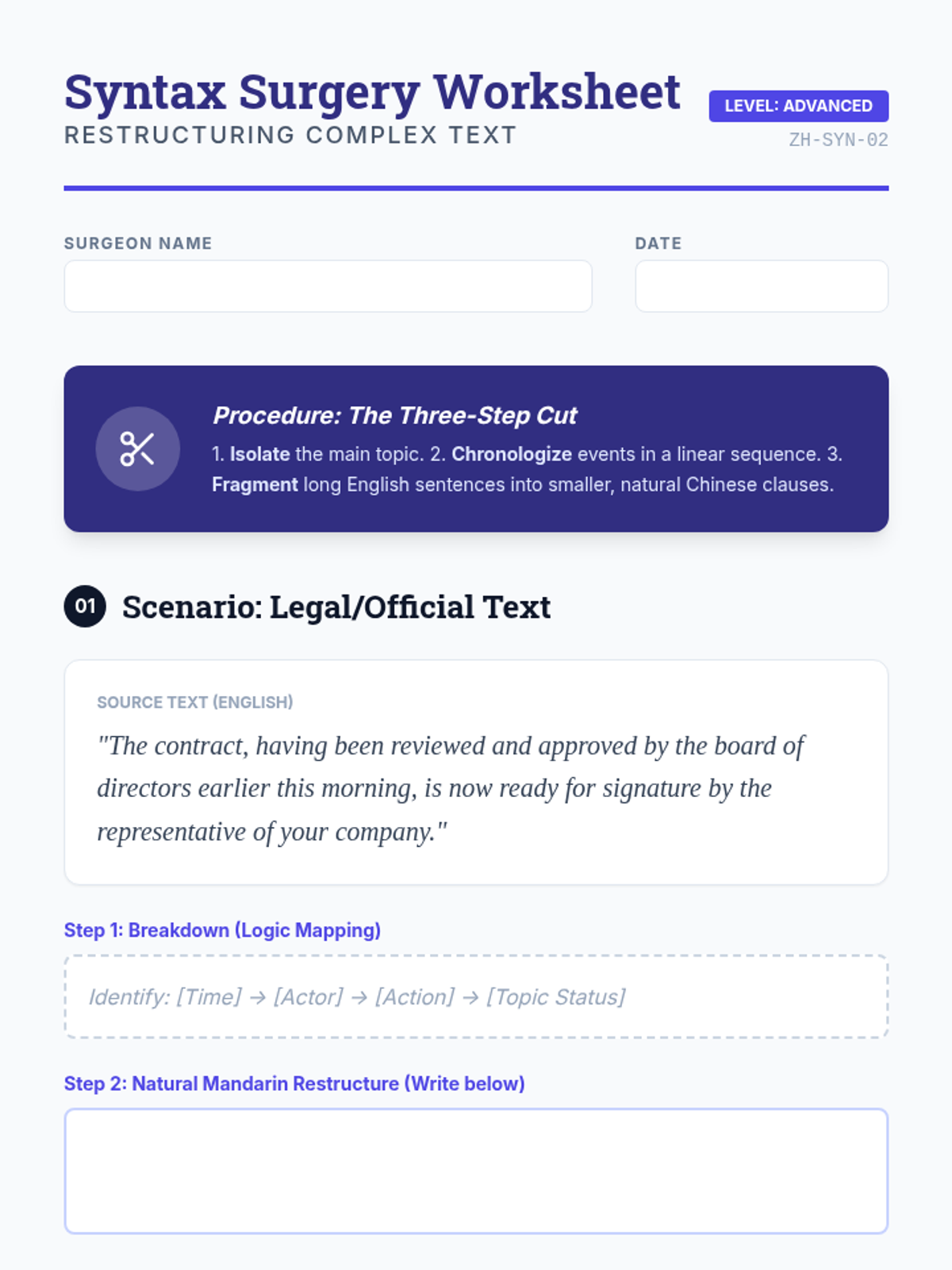 Learners practice restructuring English sentences (often passive or complex) into natural Chinese syntax (topic-comment structures). Focus is on breaking long English sentences into shorter Chinese segments.