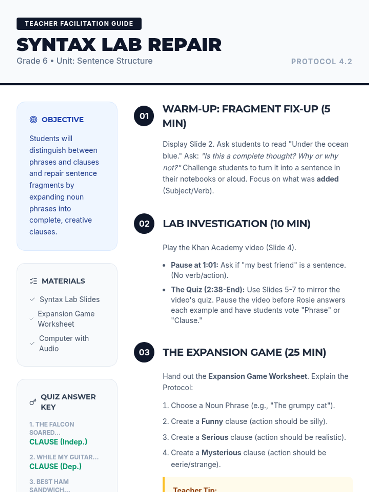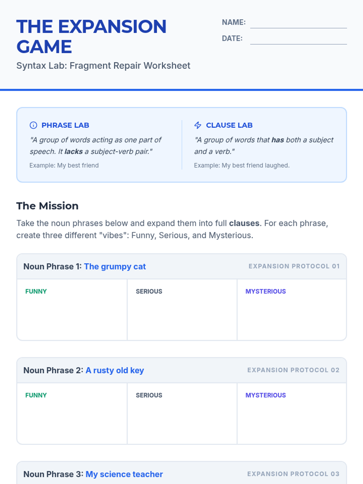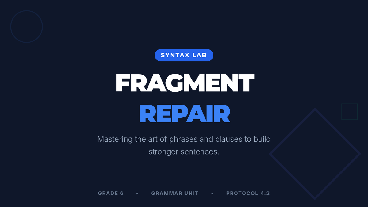 A 6th-grade grammar lesson where students distinguish between phrases and clauses and learn to repair sentence fragments by expanding noun phrases into complete, creative clauses.