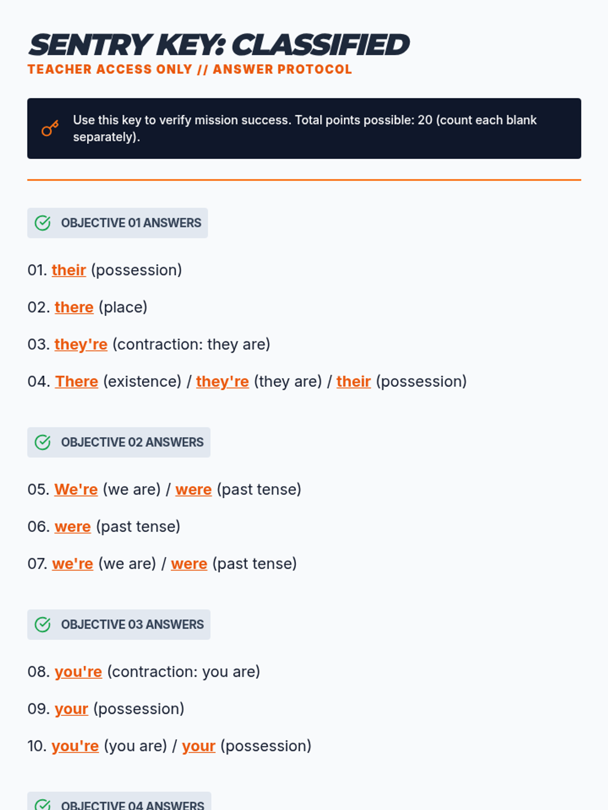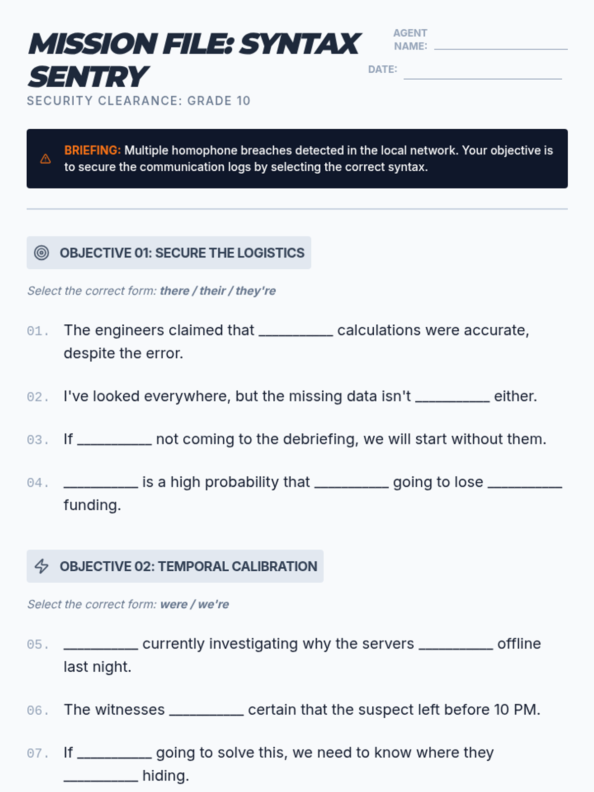 A high-speed grammar refresher for 10th graders focusing on the common pitfalls of homophones: they're/their/there and were/we're. Designed for a 10-minute bell-ringer or quick review session.