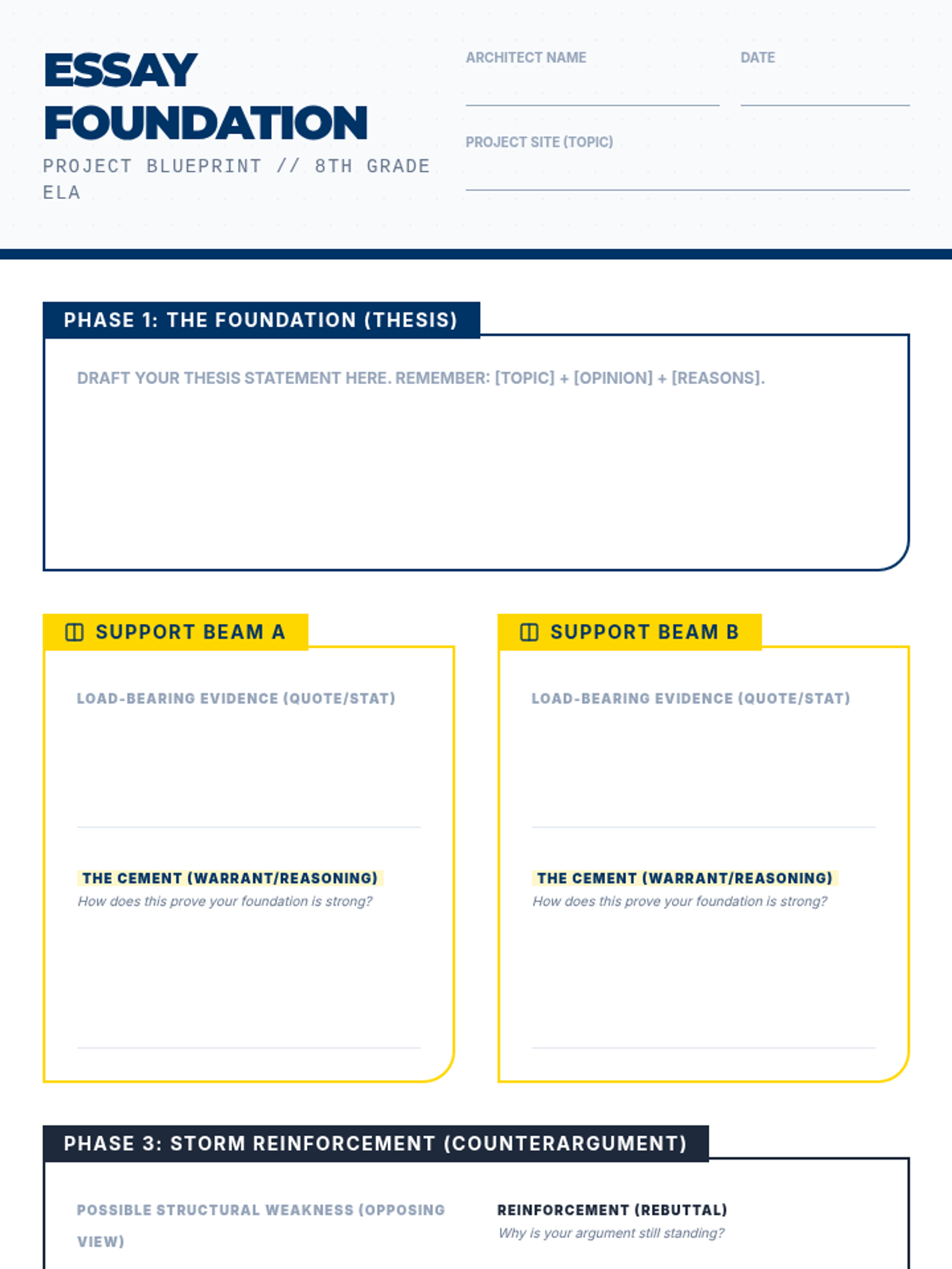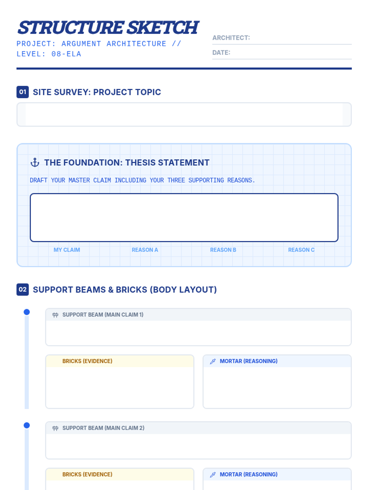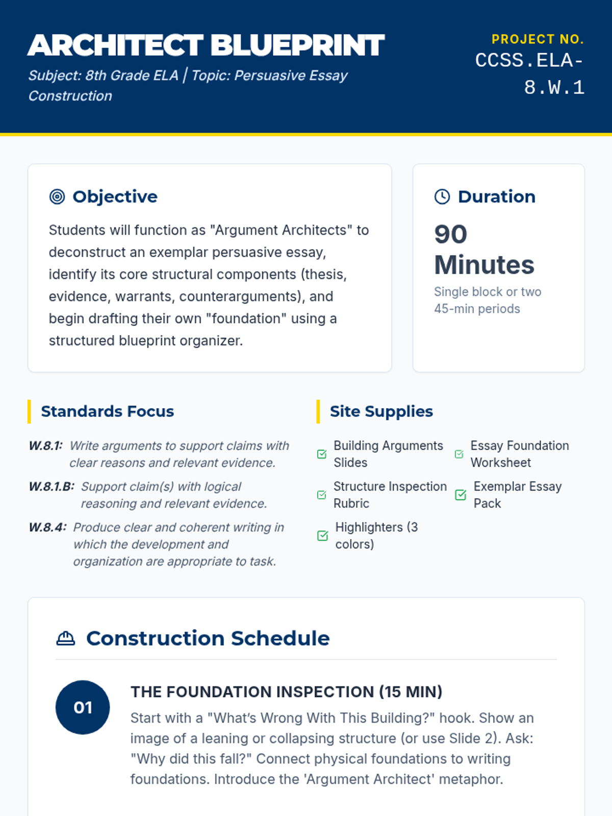 A comprehensive lesson where 8th graders learn to construct persuasive essays using an 'architectural' framework, focusing on thesis foundations, structural claims, and evidentiary reinforcement.