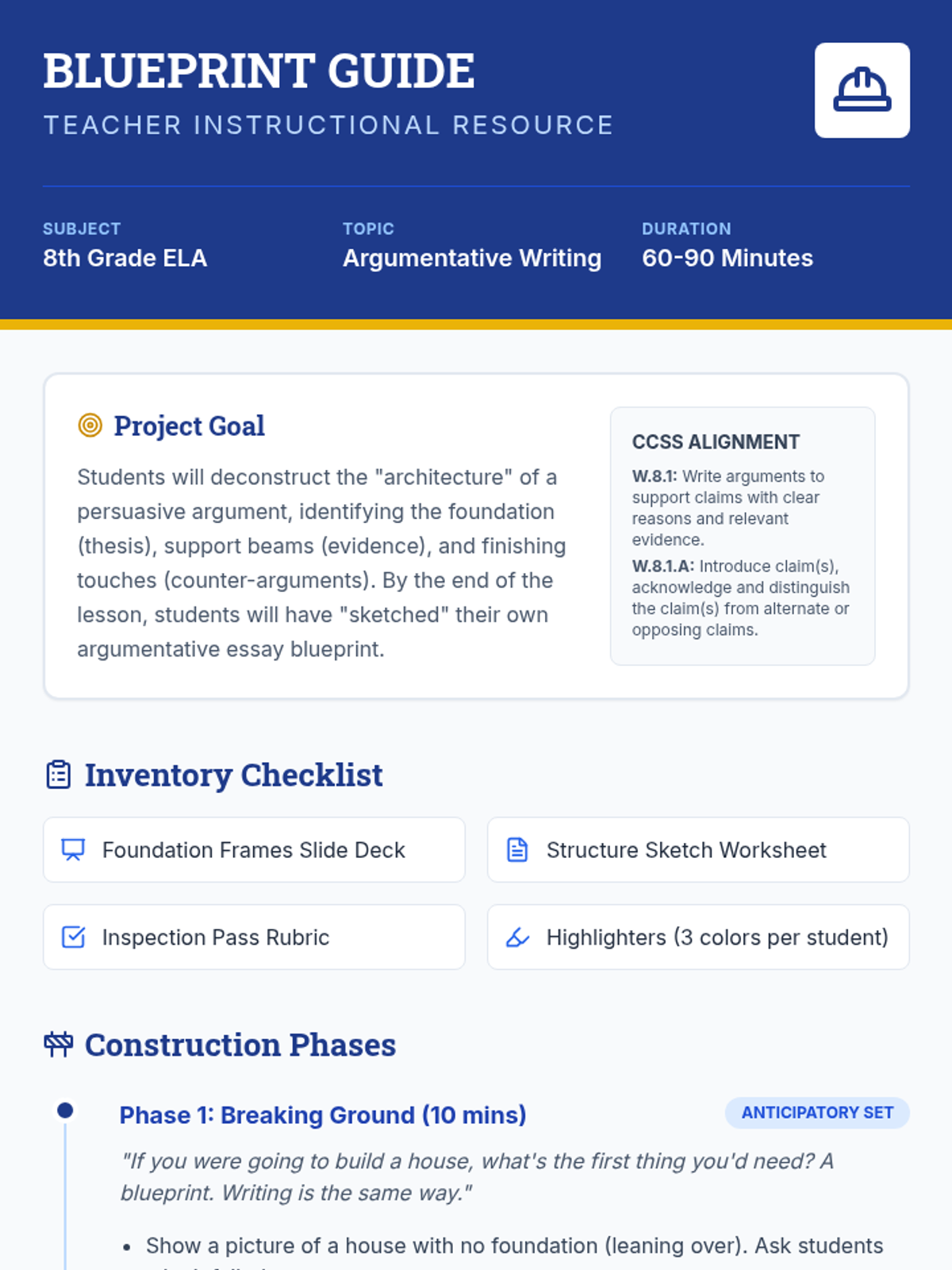 A comprehensive 8th-grade ELA lesson on persuasive writing where students act as architects to build robust, evidence-backed arguments through systematic planning and organization.