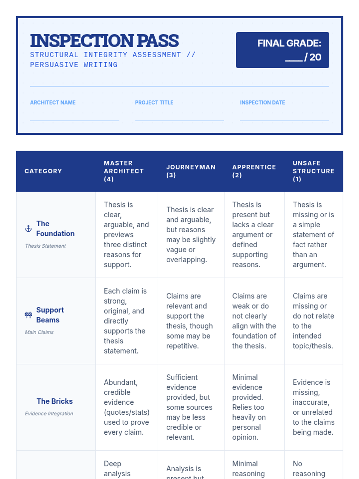 A lesson where students learn to decode and apply rubrics to argumentative writing, treating the rubric as a blueprint for forging strong, defensible arguments.