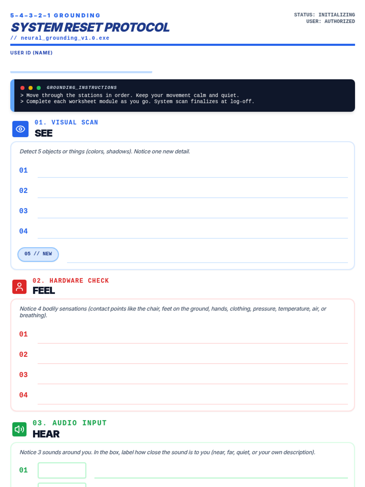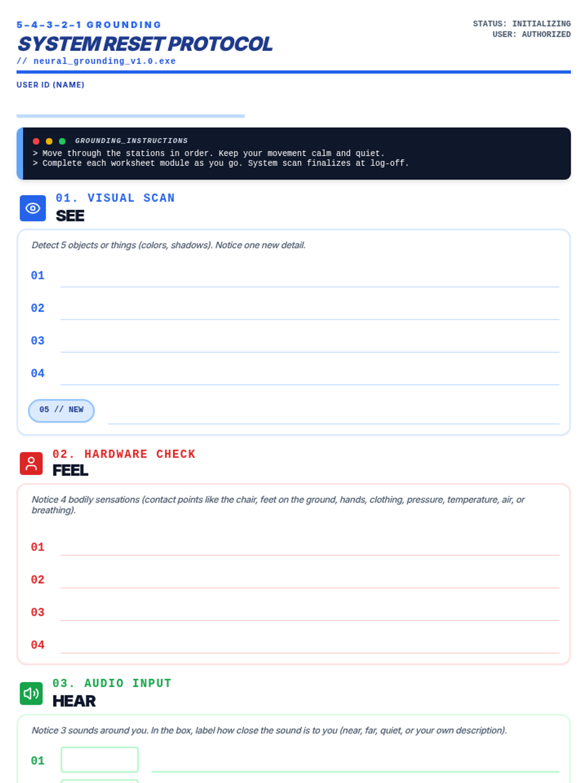 A lesson teaching students how to use the 5-4-3-2-1 grounding technique to manage stress and anxiety, framed through a technical 'system reset' metaphor. Students learn to recognize the 'spinning' state of anxiety and intercept it using sensory inputs.