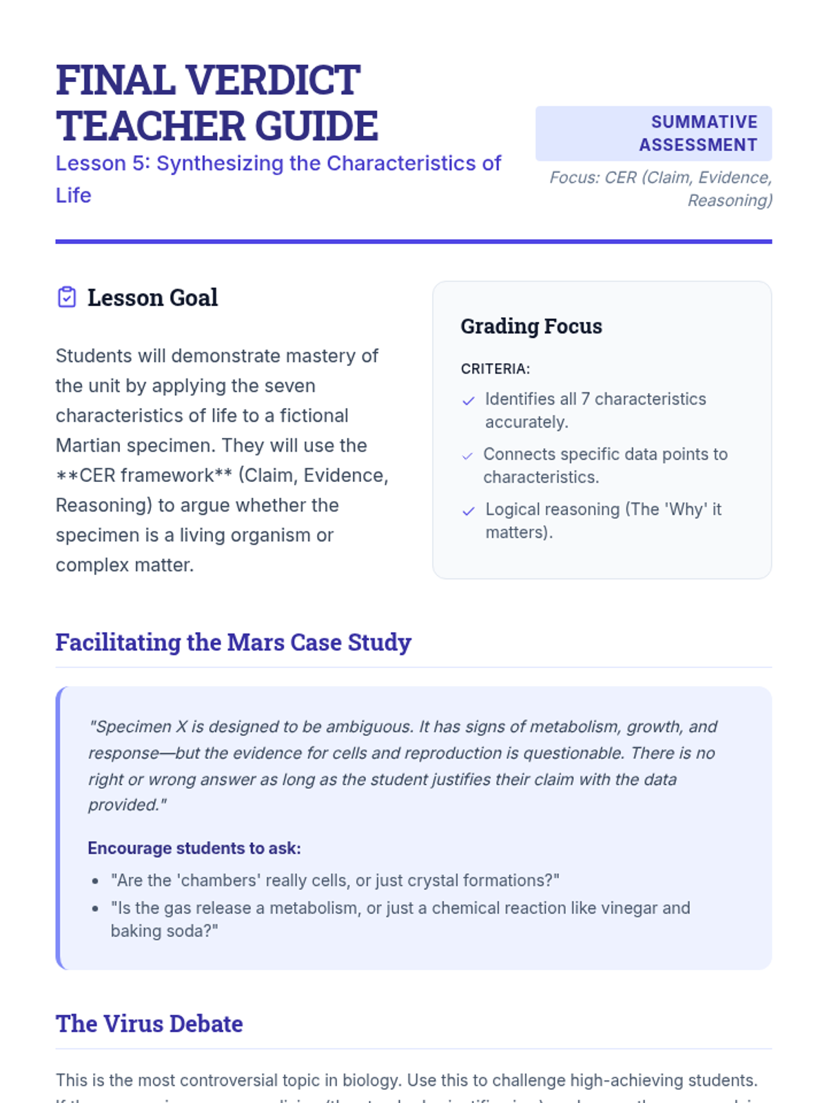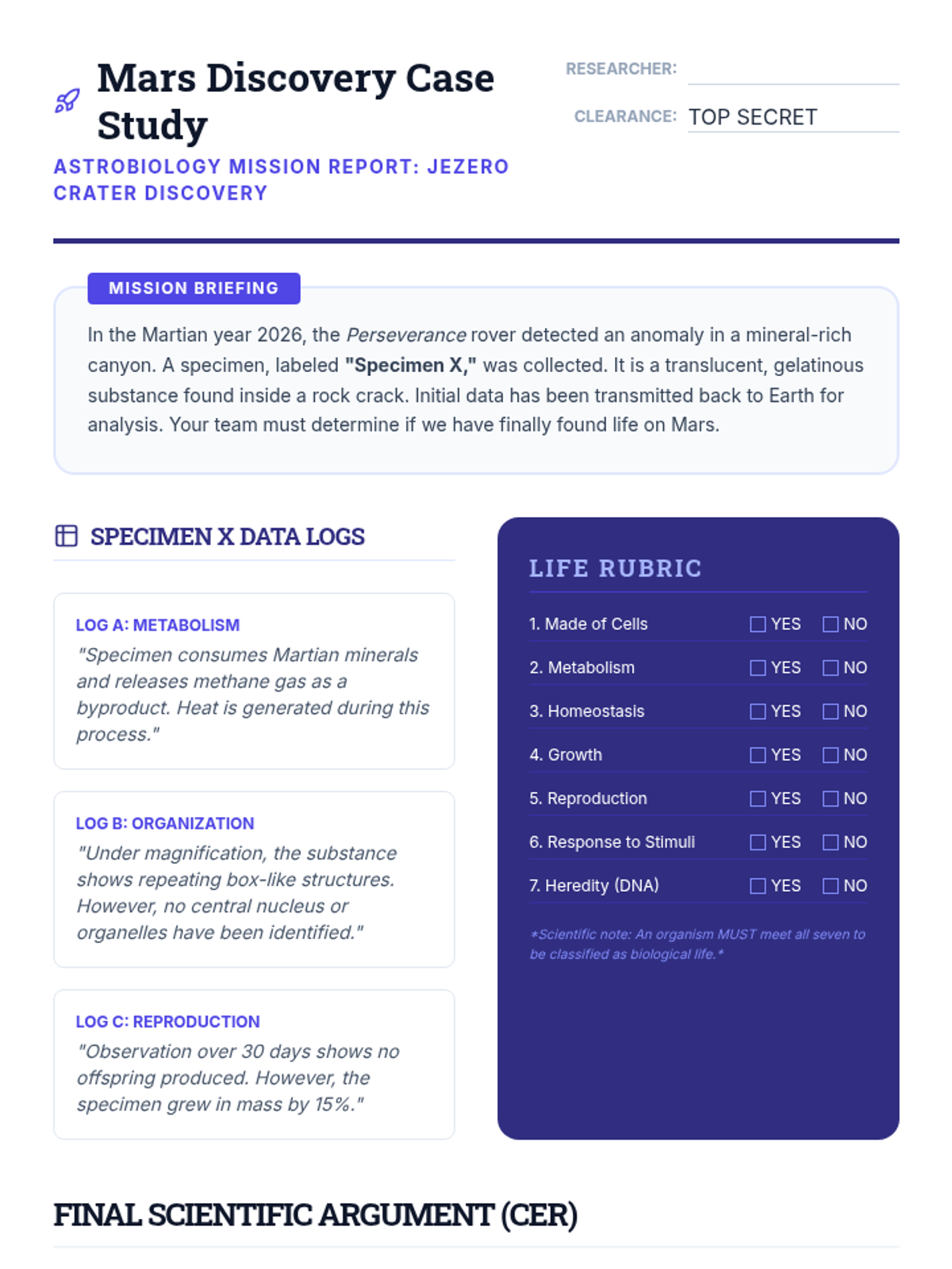 Students apply their knowledge to a final case study involving a fictional Mars discovery or a virus, writing a scientific argument to classify the specimen based on the characteristics of life.
