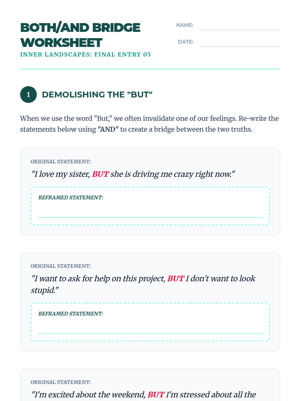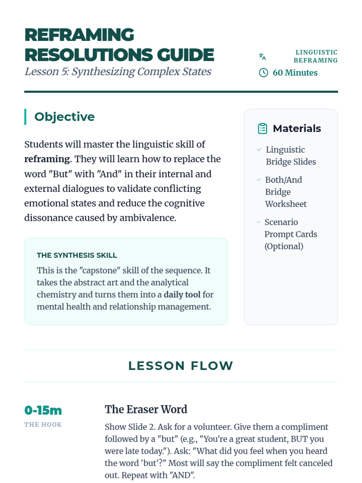 Students practice linguistic reframing using 'Both/And' statements to validate and synthesize conflicting emotional states.