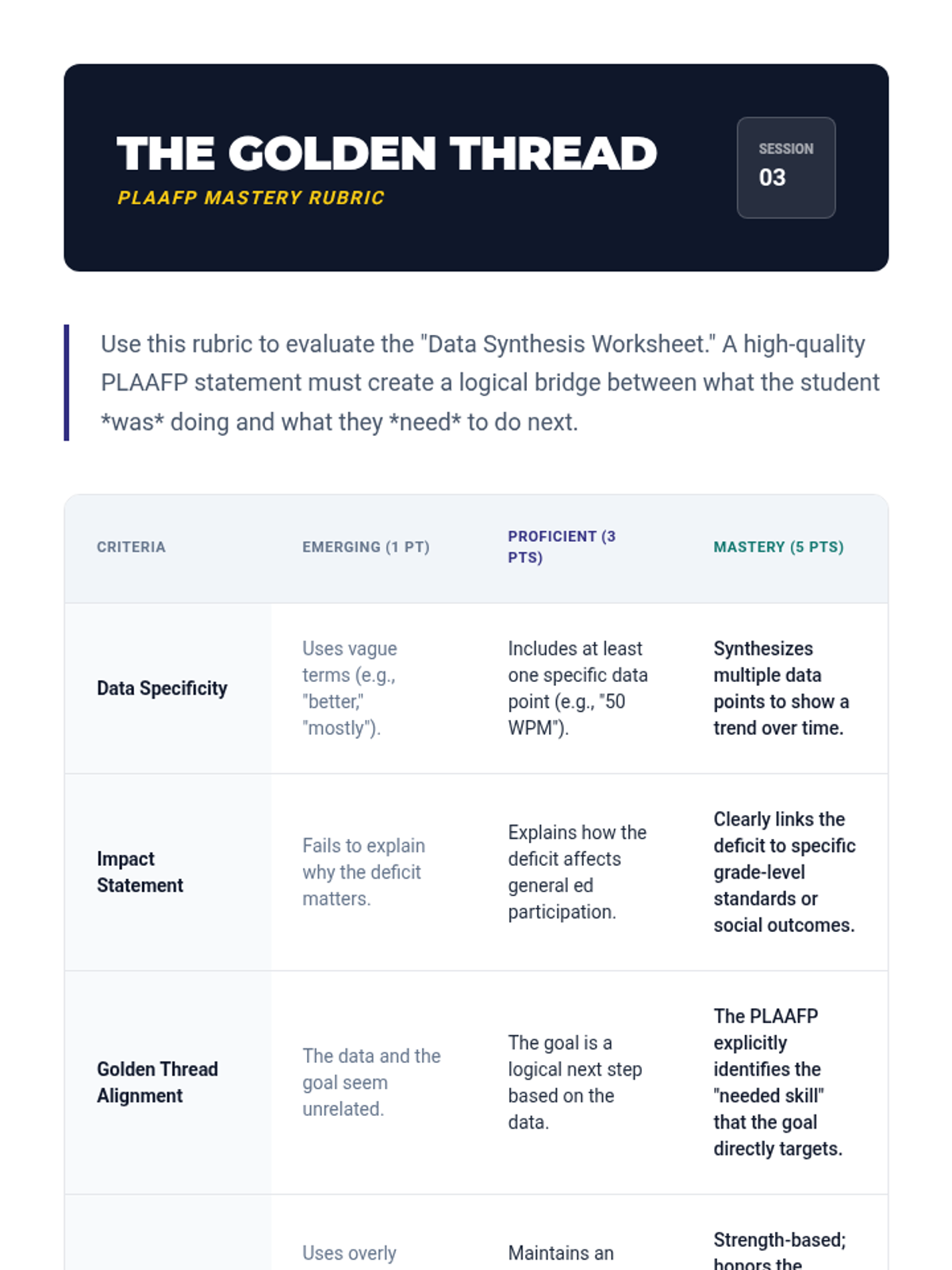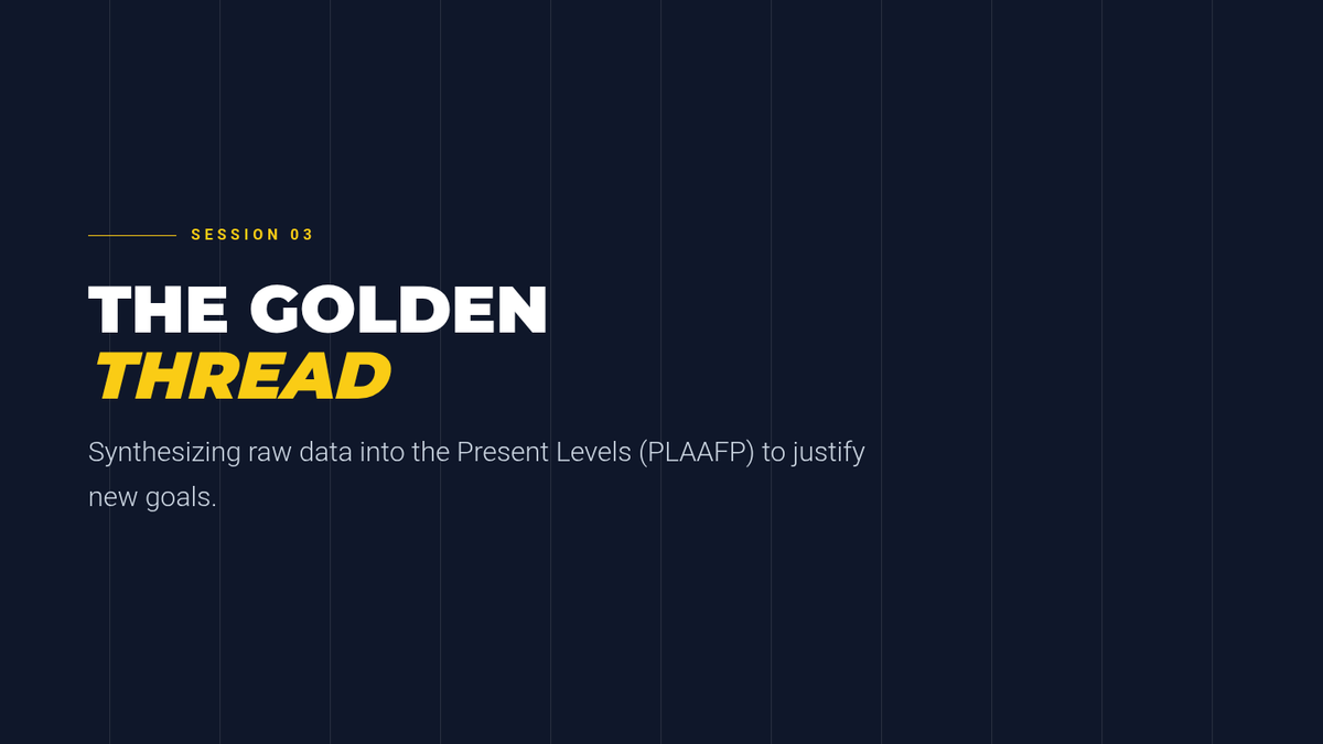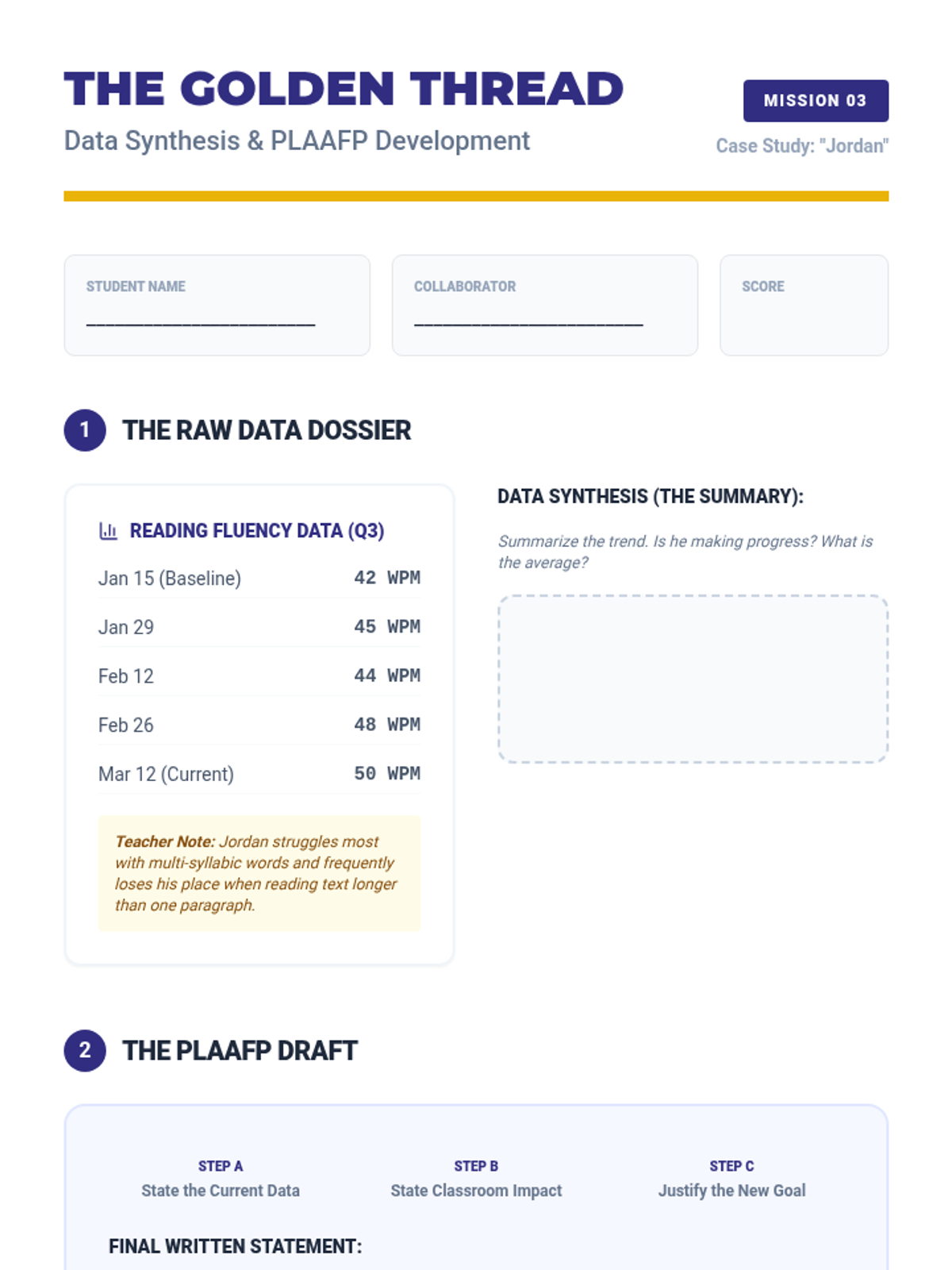 Students learn to synthesize monitoring data into the PLAAFP section of an IEP, ensuring a clear 'golden thread' from data to goals.