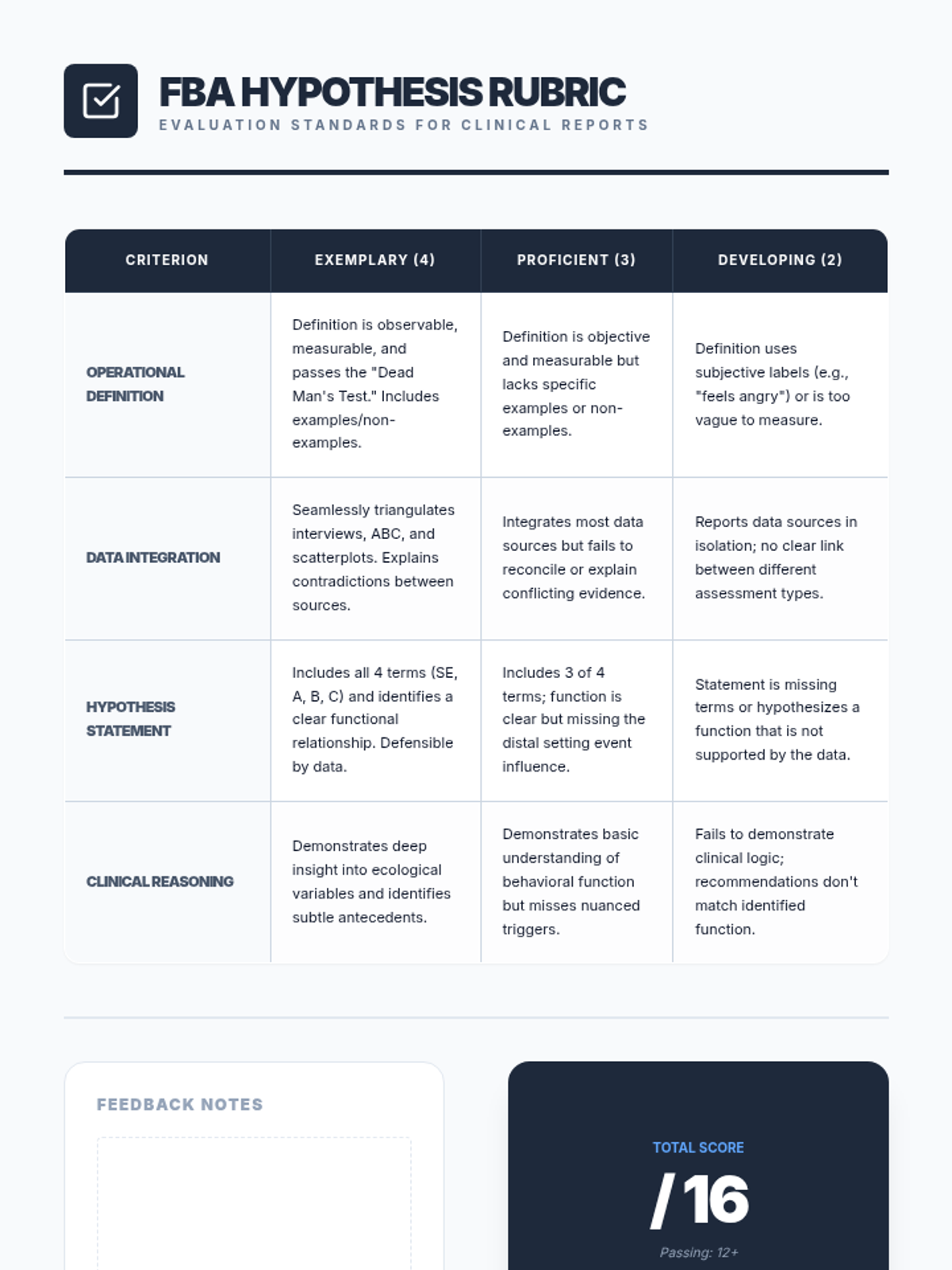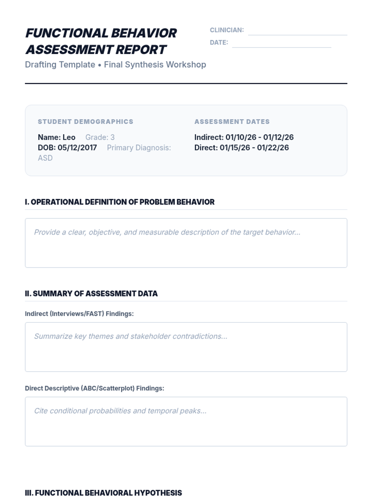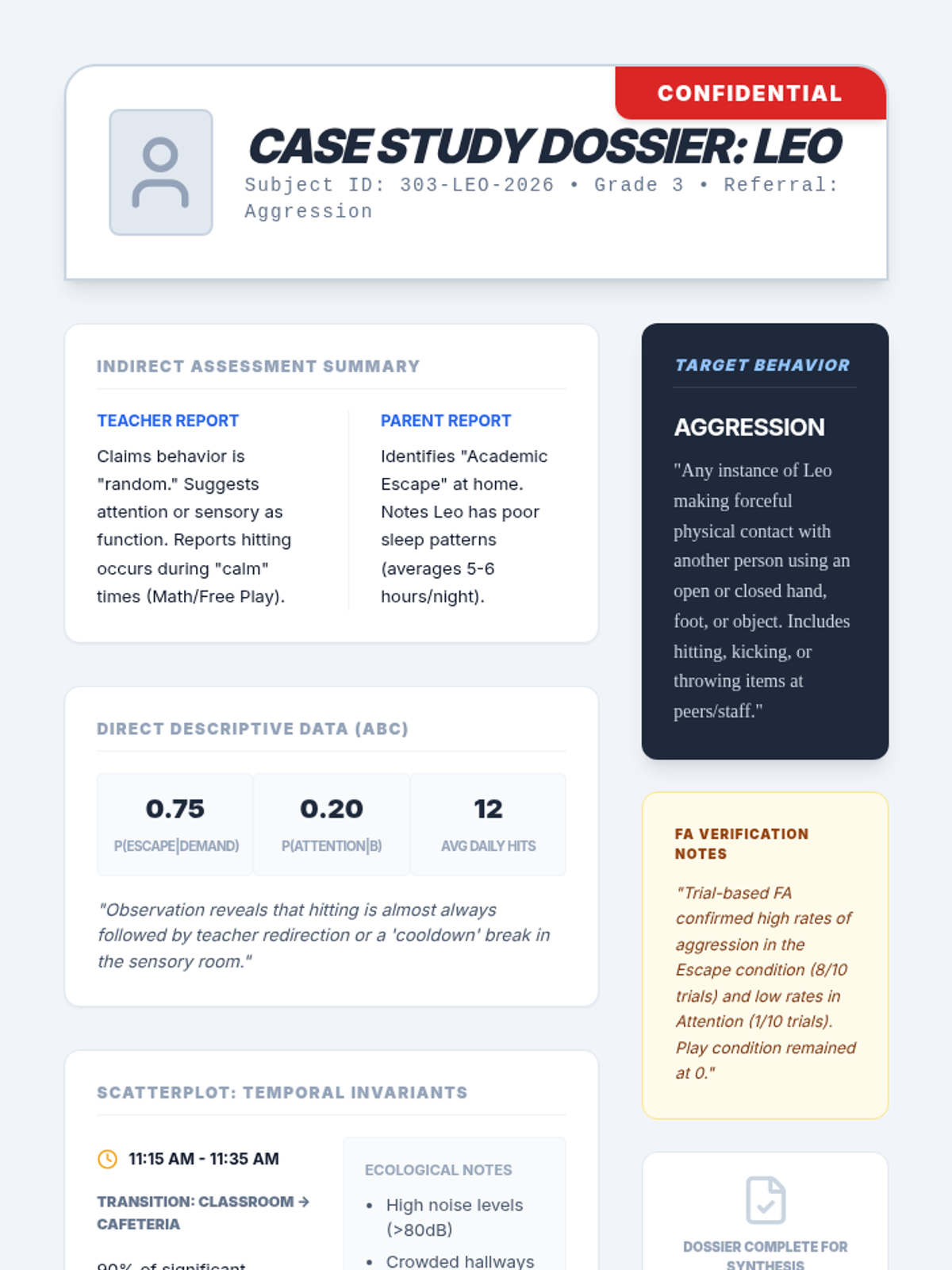 The capstone workshop where students synthesize all longitudinal data into a formal FBA report. Includes writing defensible four-term contingency hypothesis statements.