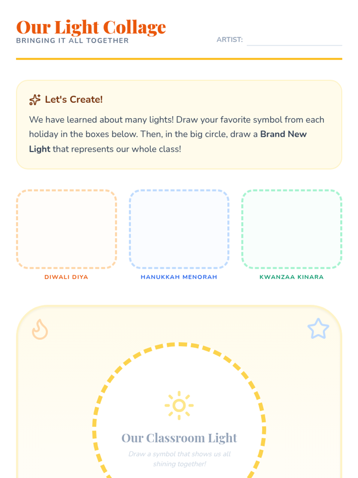 Students compare different light traditions and synthesize their learning by creating a collective symbol of light for their classroom community.