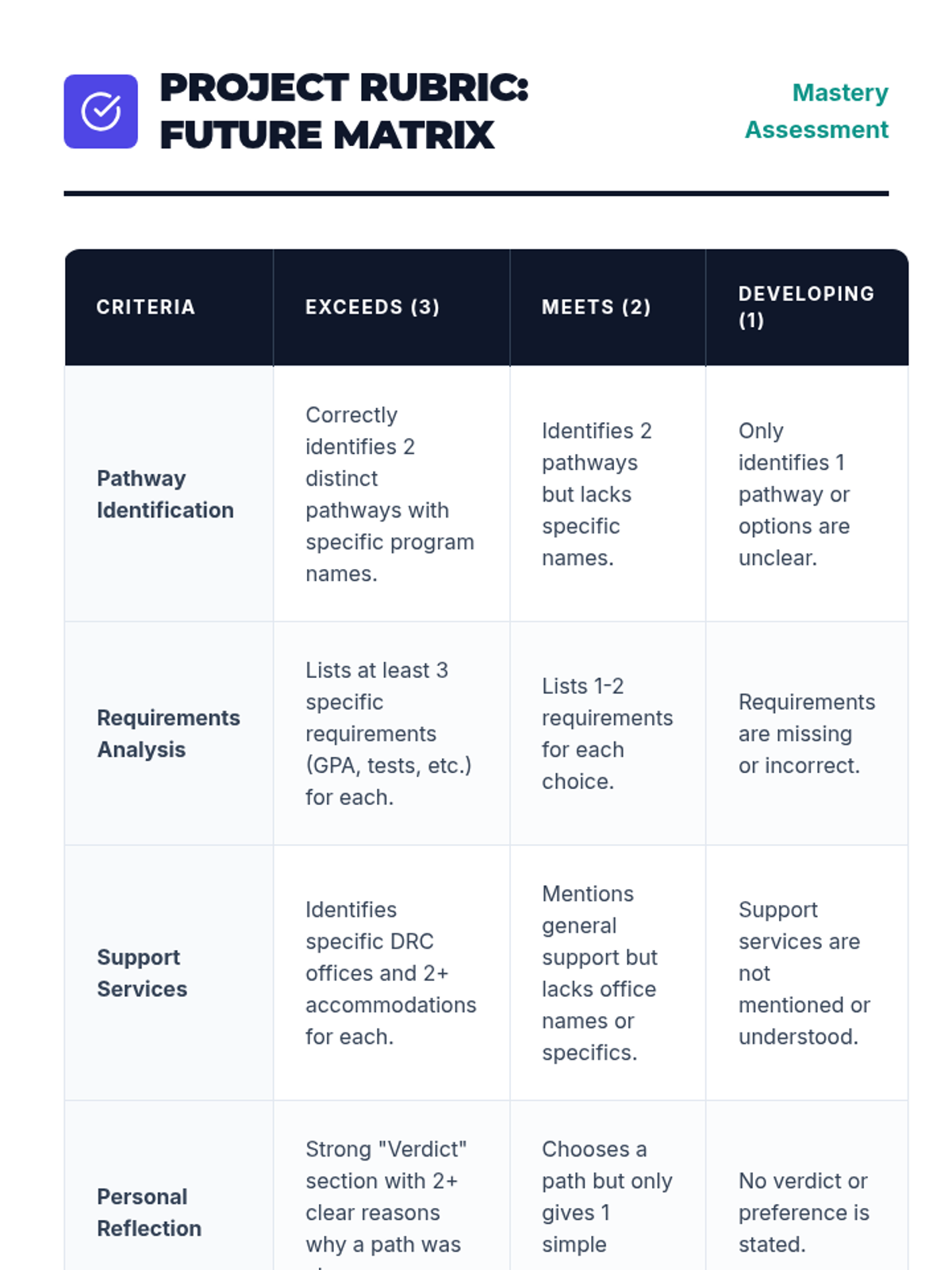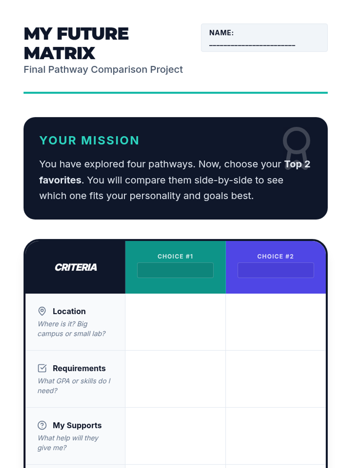 Students synthesize their learning by creating a personalized comparison matrix and presentation of their top two post-secondary pathway choices.