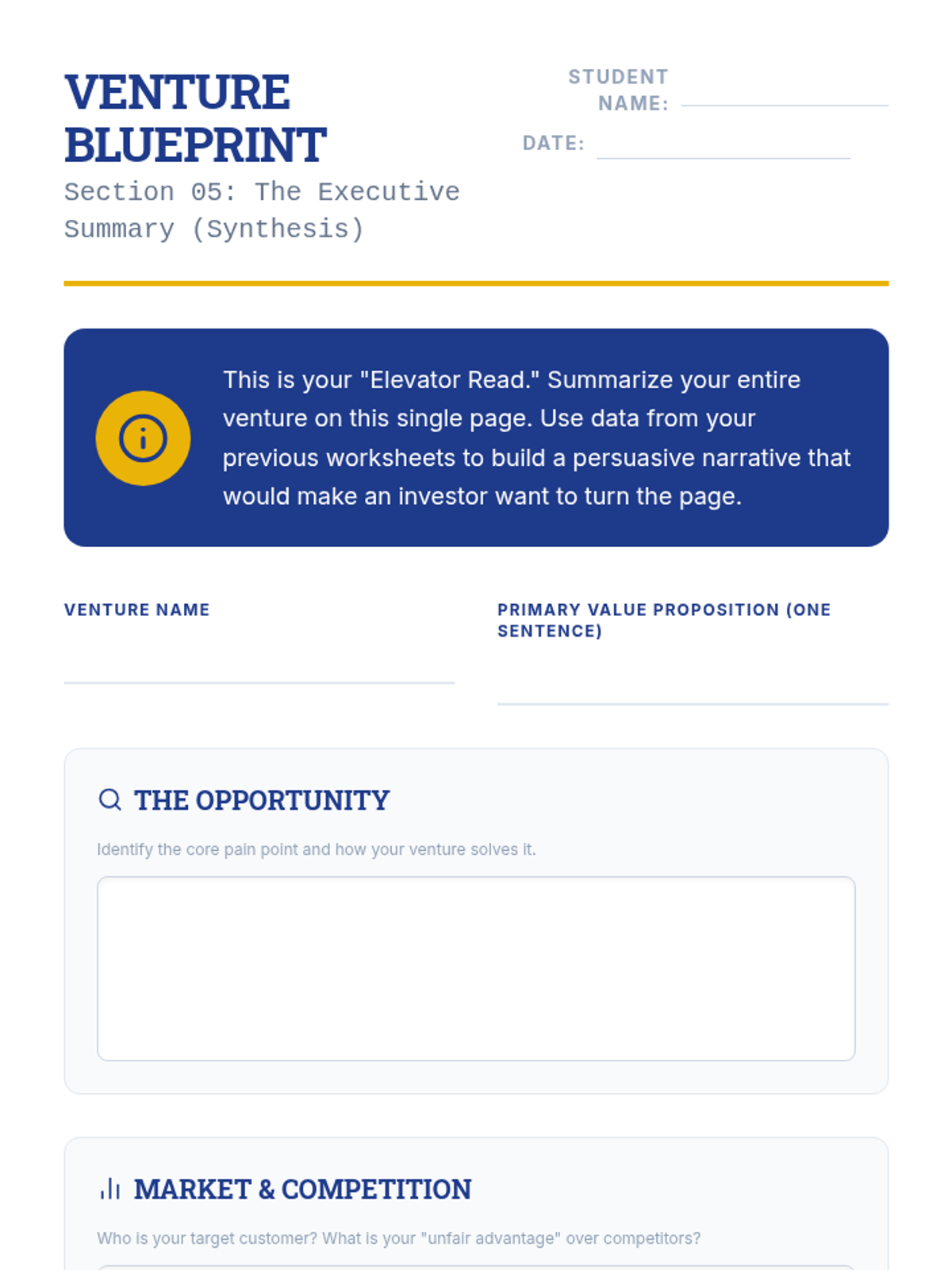 Students learn to condense their entire business plan into a compelling one-page Executive Summary designed to capture investor interest.