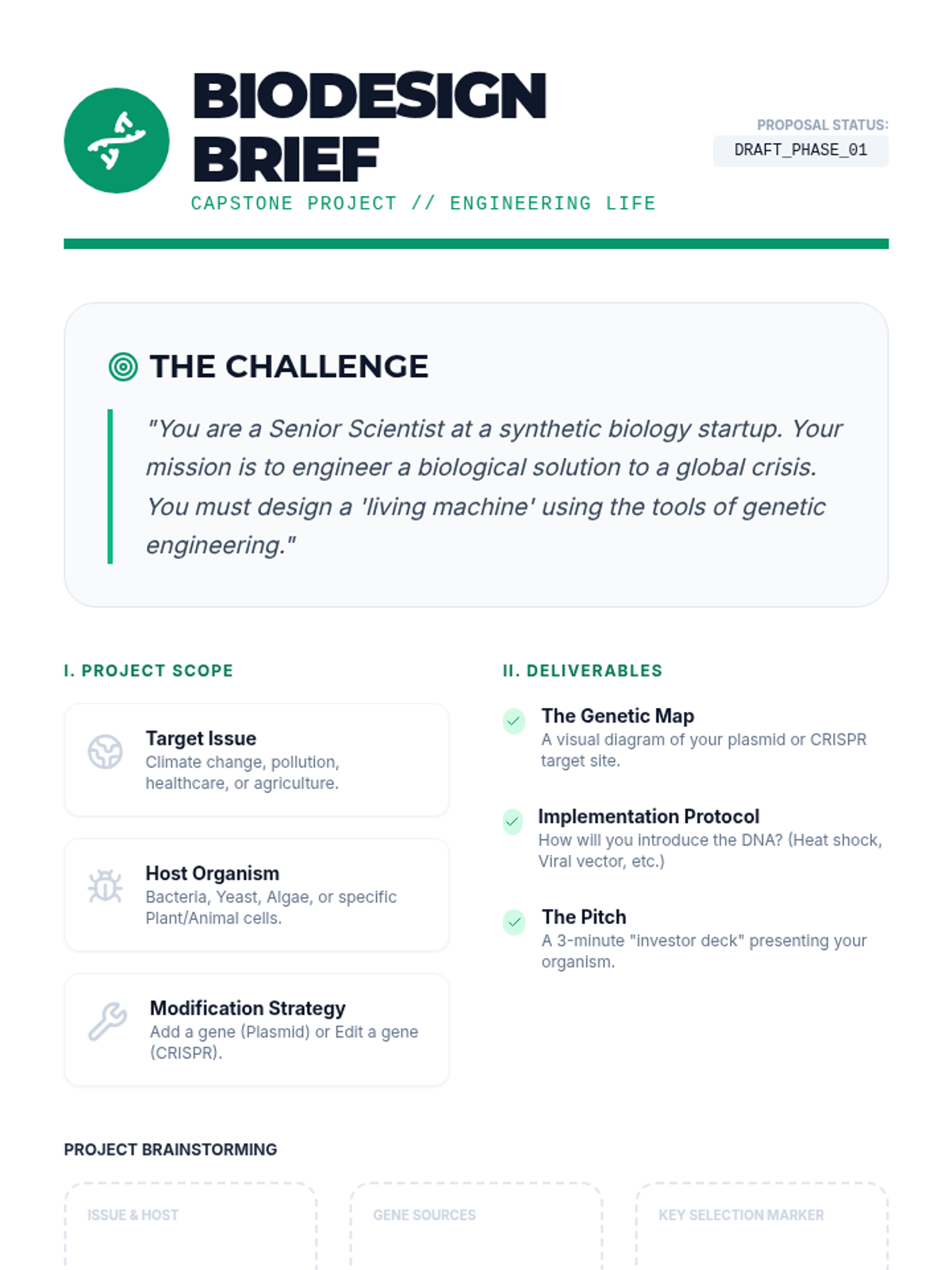 A capstone project where students apply their knowledge to design a synthetic organism that solves a specific environmental or medical problem.