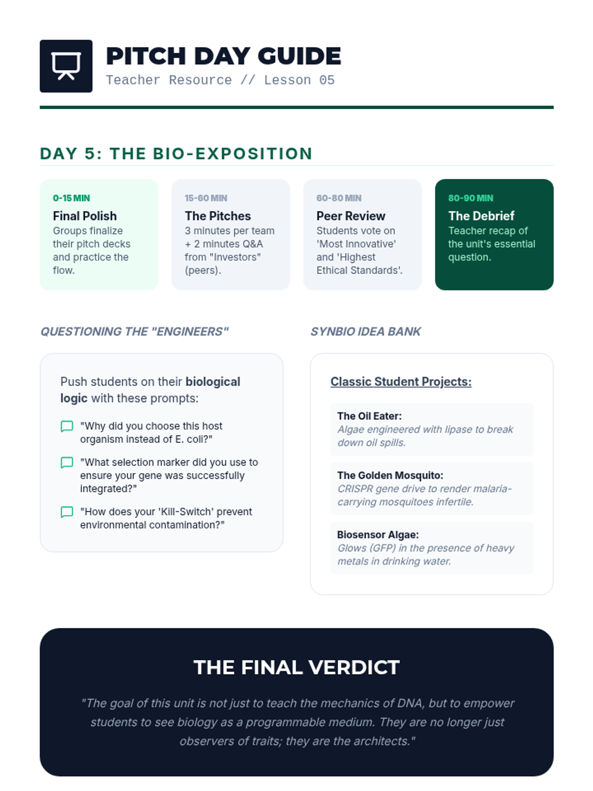 The unit capstone experience where students present their marketing campaigns as founders. Includes a two-day formal pitch event with peer judging, Shark Tank-style Q&A, and 'Class Cash' investment reflections.