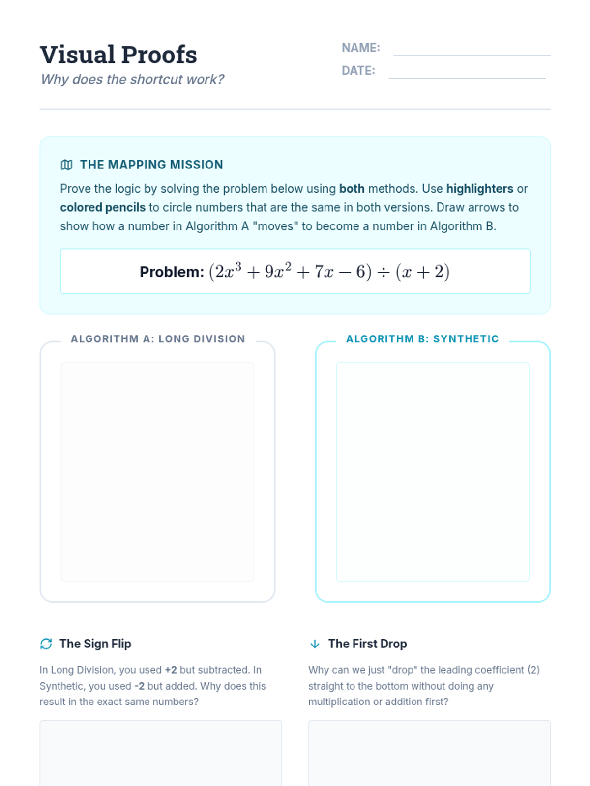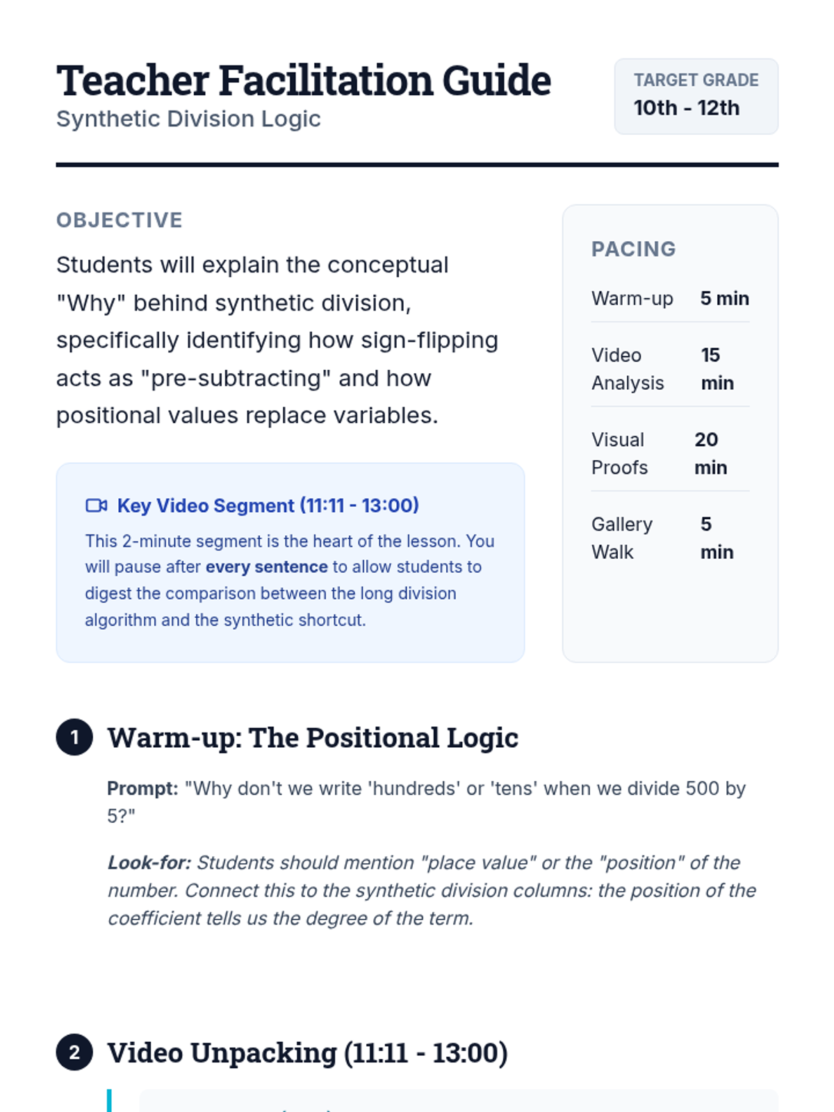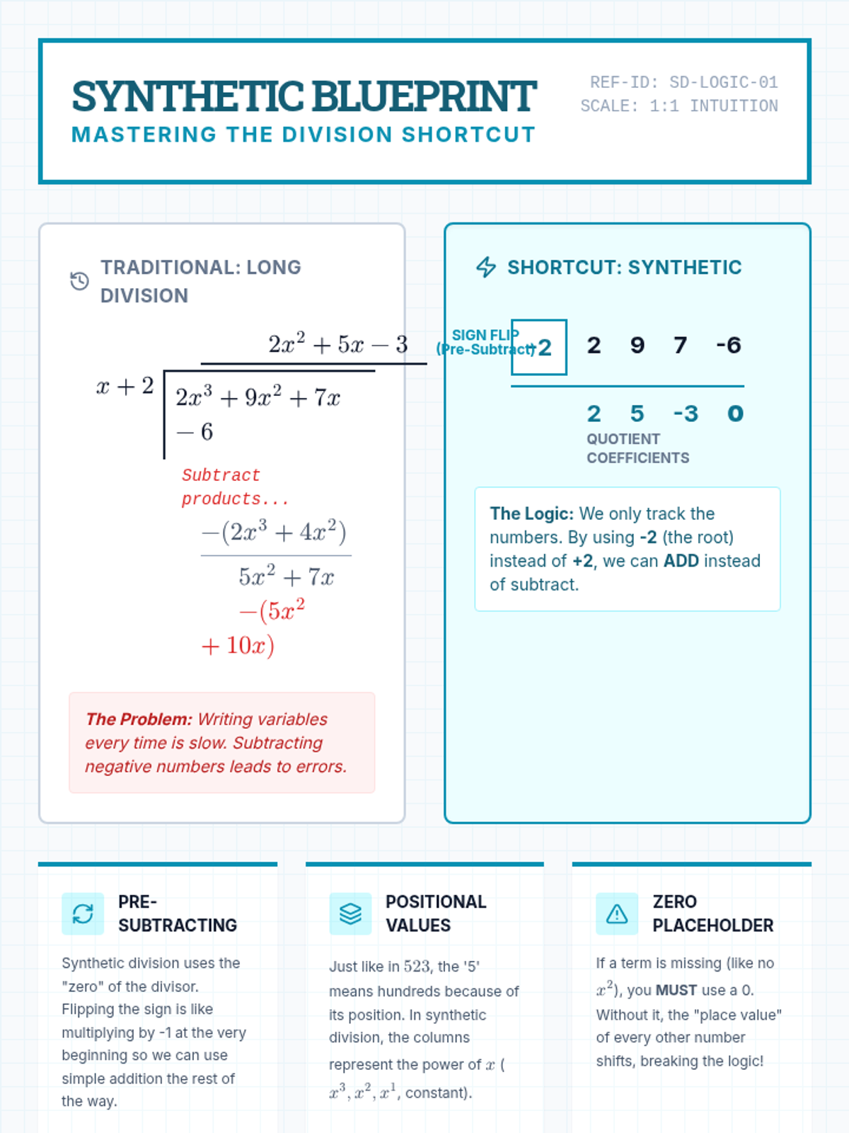 This lesson focuses on the conceptual 'Why' behind synthetic division, moving beyond the algorithm to understand sign-flipping as 'pre-subtracting' and the role of coefficients as positional values.