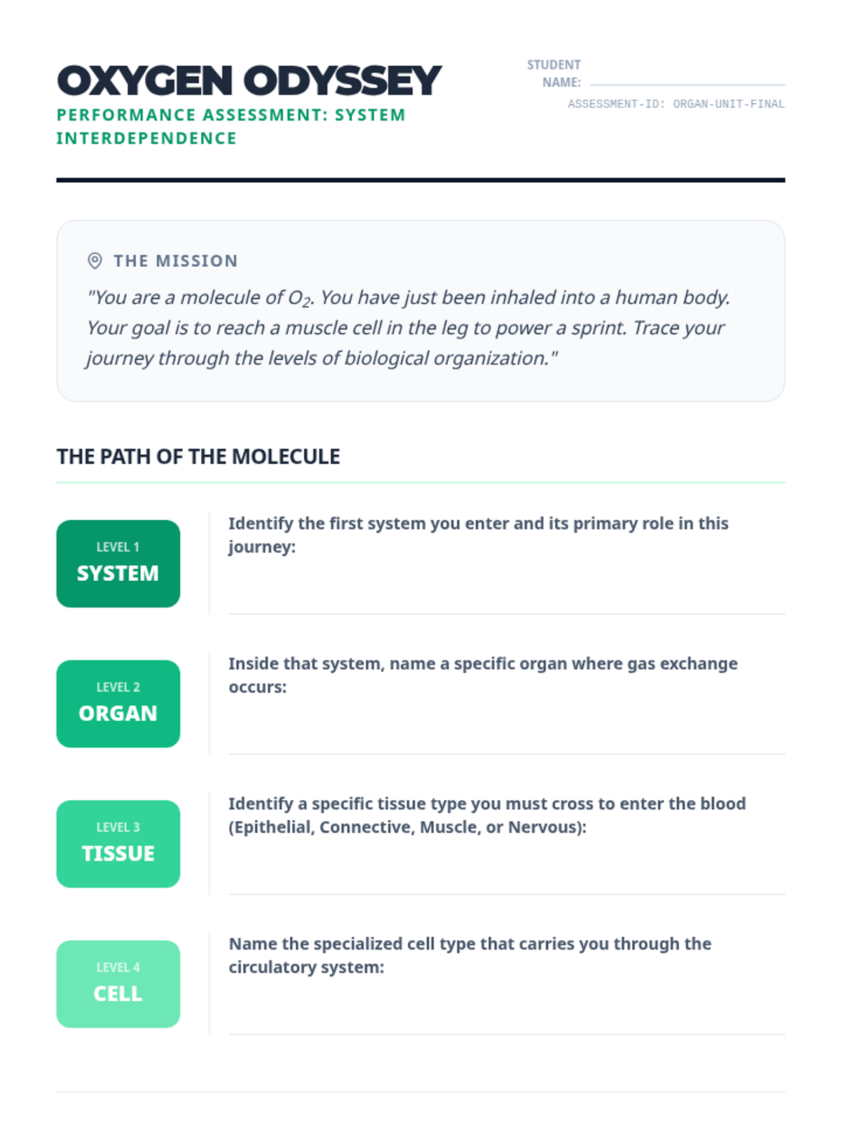 A summative assessment where students map interactions between major organ systems and trace the path of molecules through various biological levels.