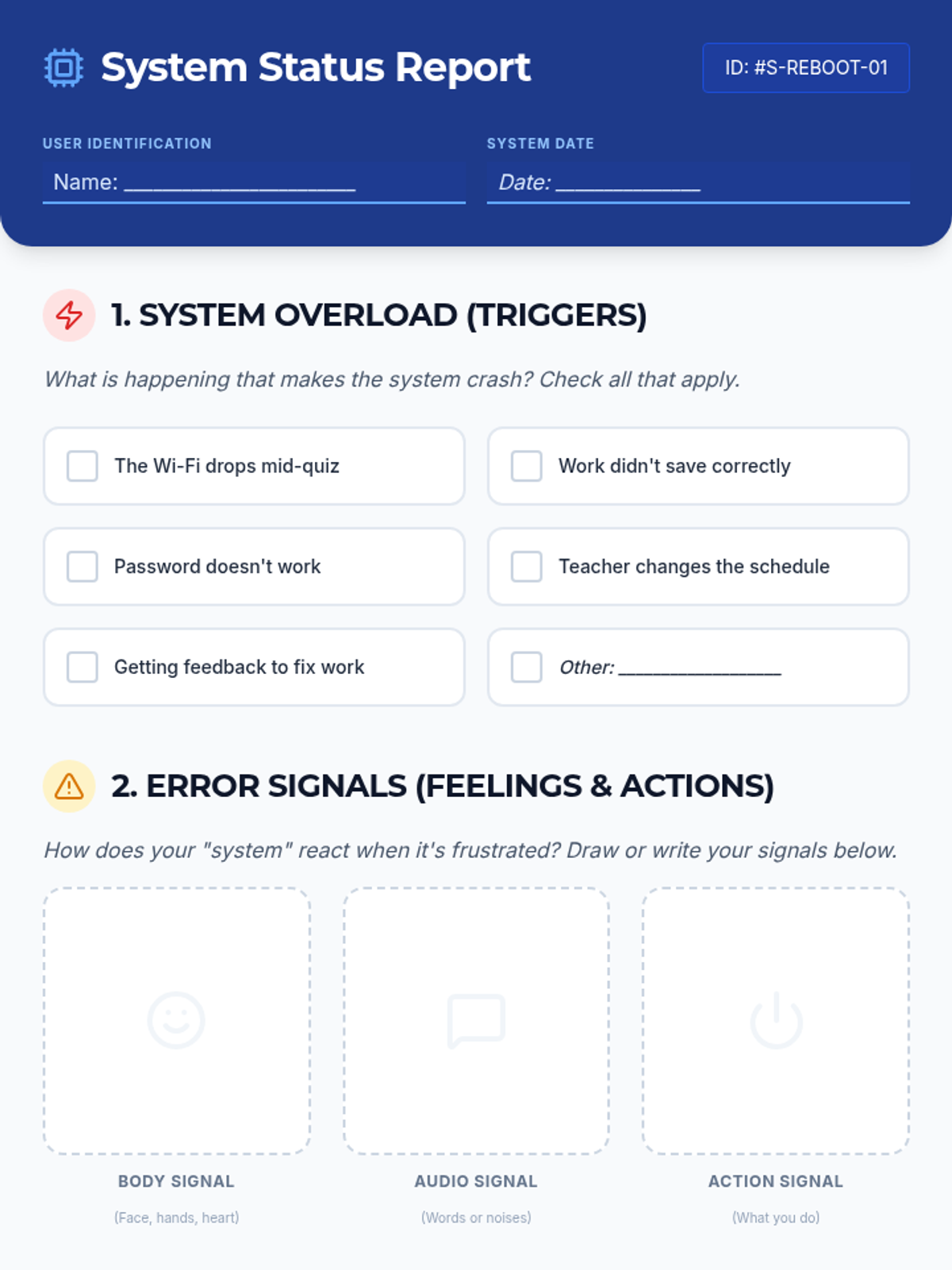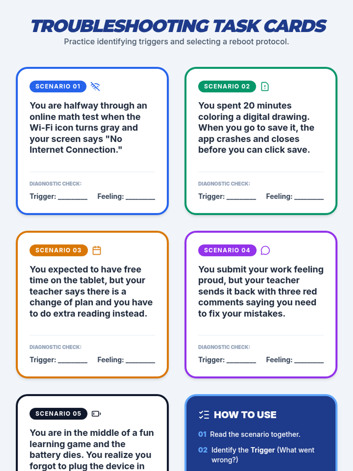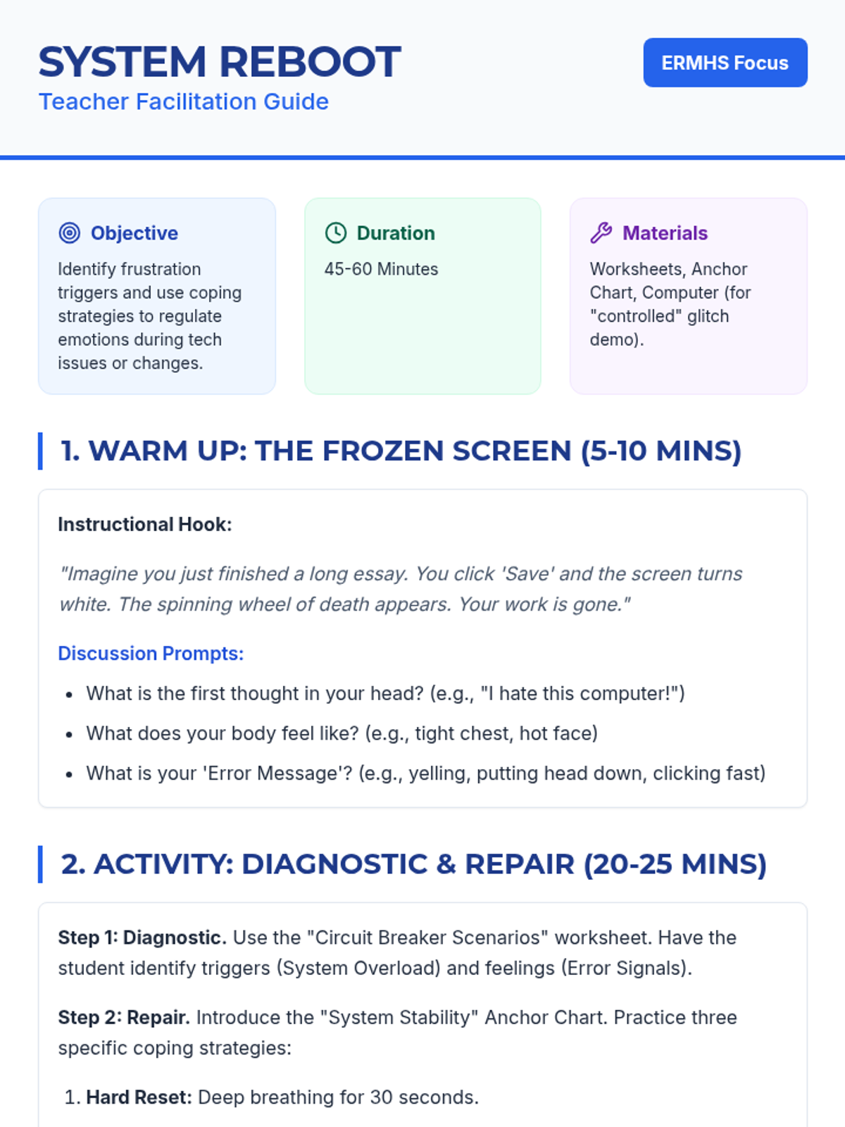 A lesson designed to help students identify frustration triggers related to technical difficulties and unexpected changes, and practice using self-selected coping strategies for emotional regulation.