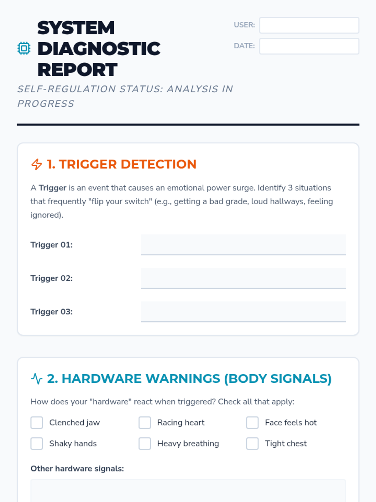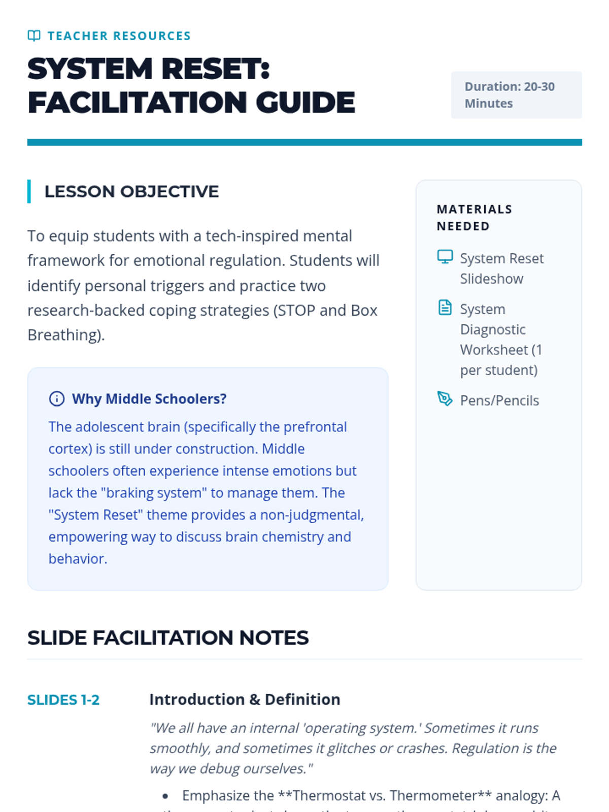 A mini-lesson for middle schoolers focusing on identifying emotional triggers and implementing healthy coping strategies using a 'System Reset' tech-inspired theme.