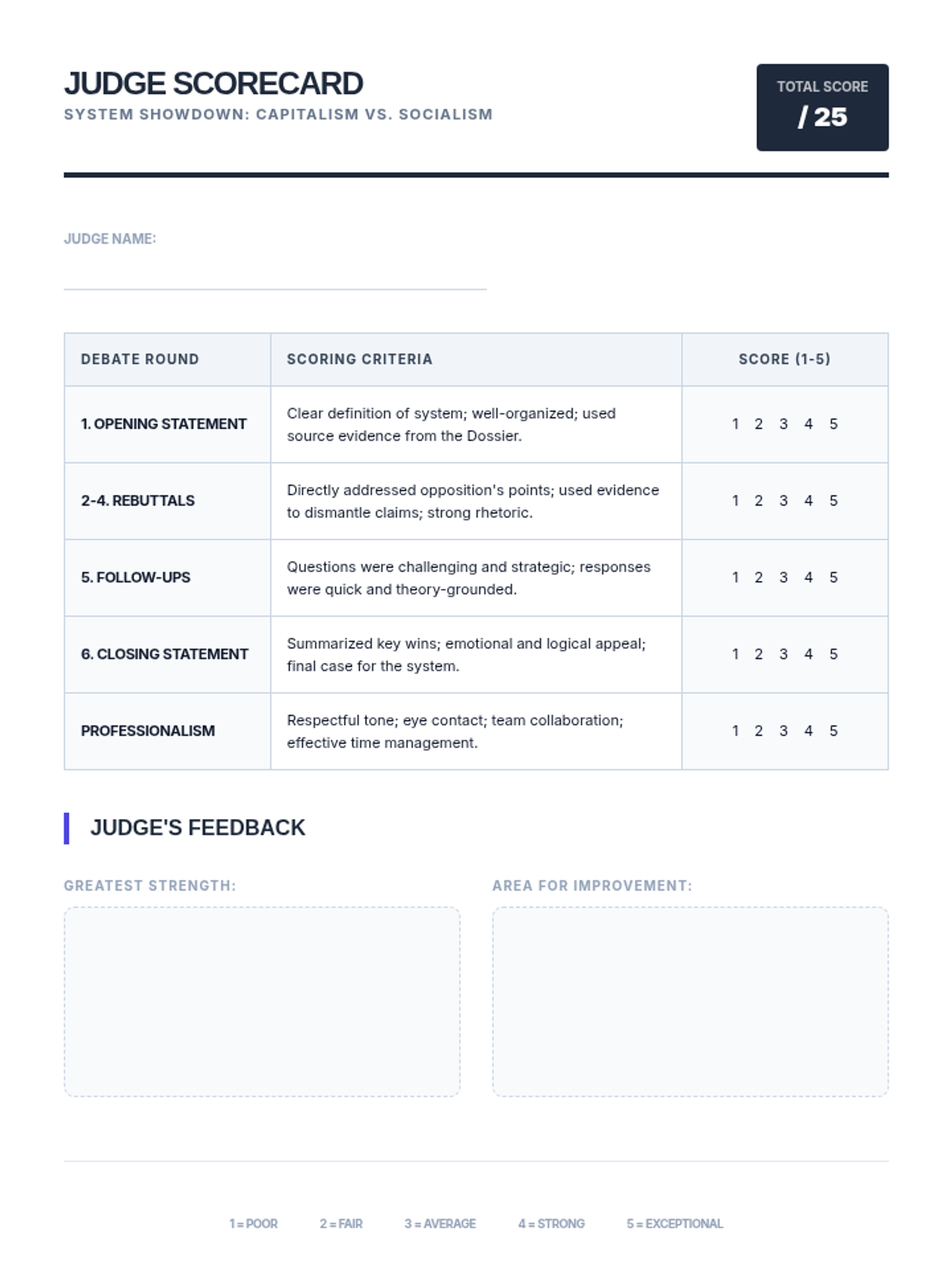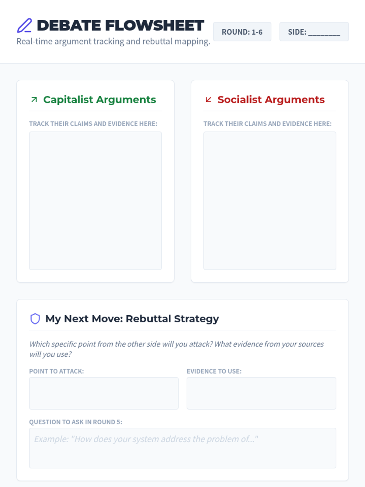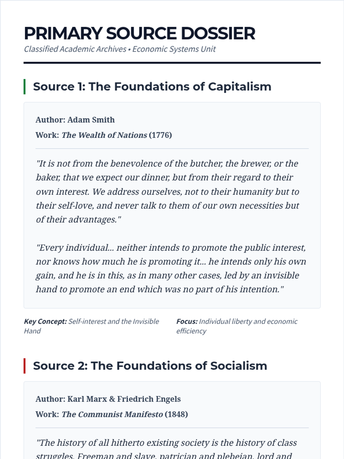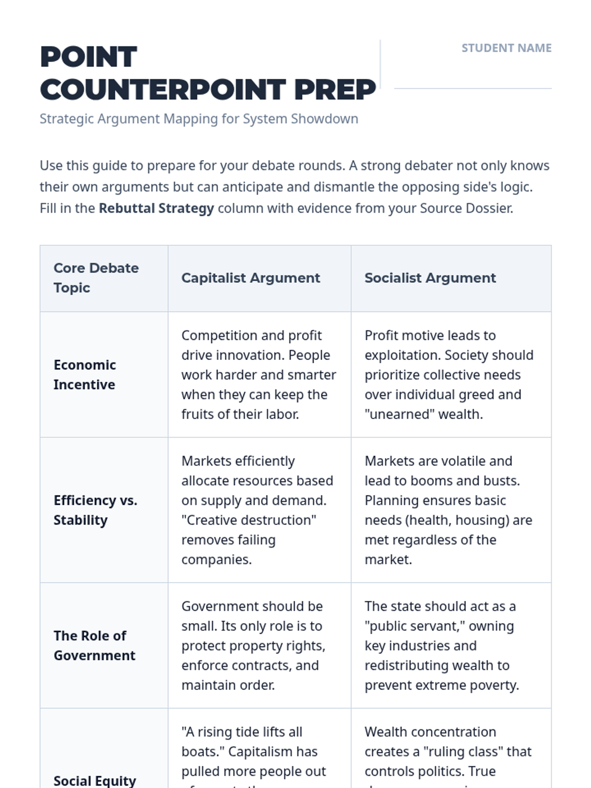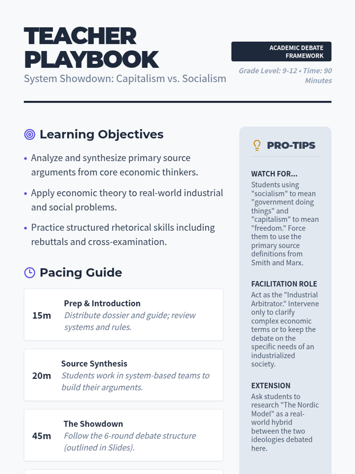 A comprehensive debate-focused lesson comparing Capitalism and Socialism, featuring primary sources, preparation guides, and a structured debate framework for an industrialized society.