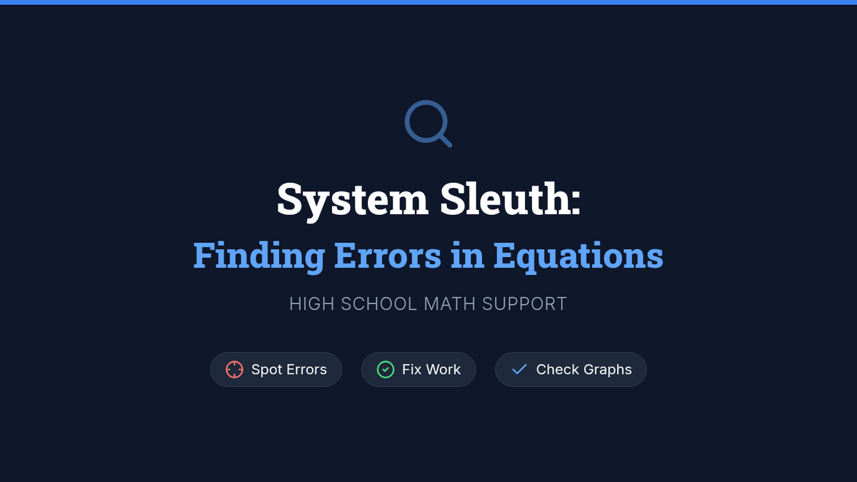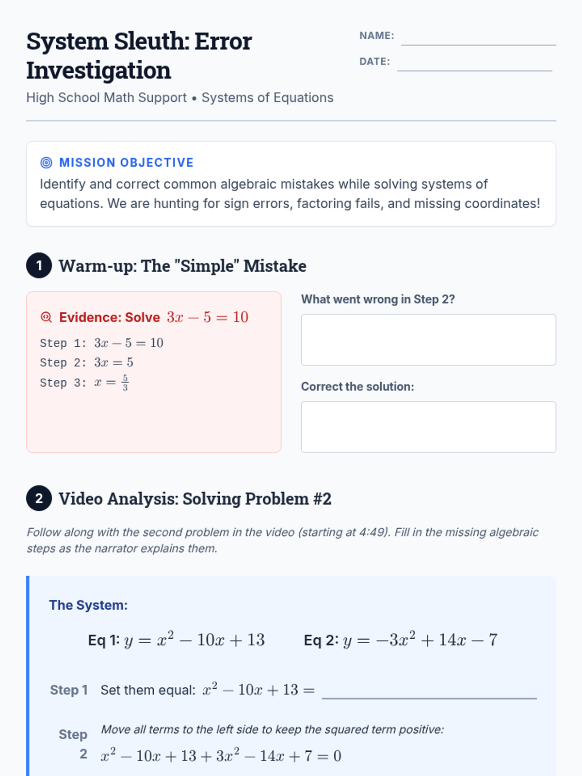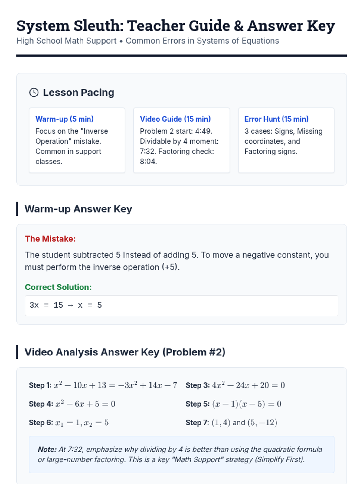 A targeted math support lesson focused on identifying and correcting common algebraic errors when solving systems of linear and quadratic equations using substitution and factoring.