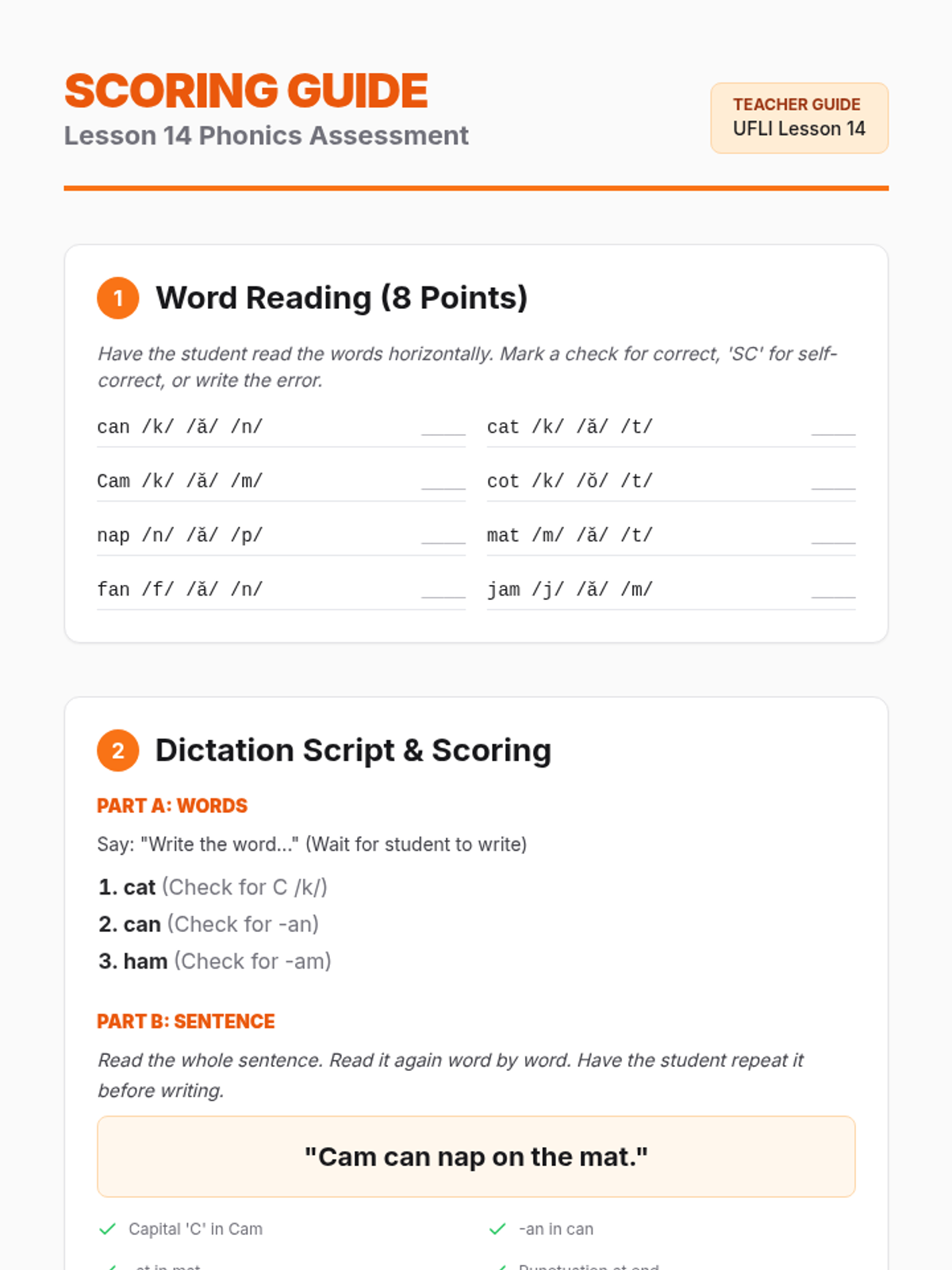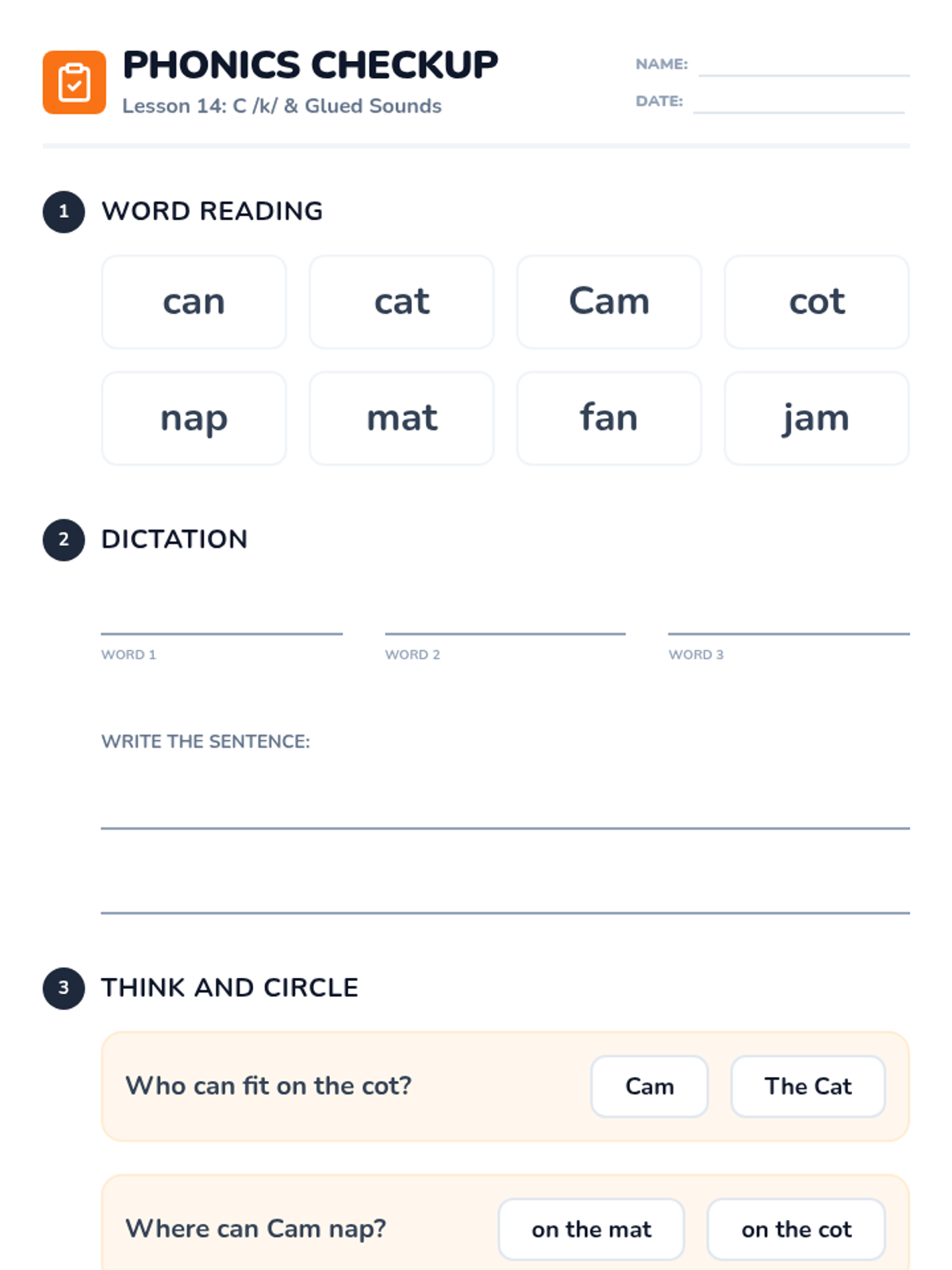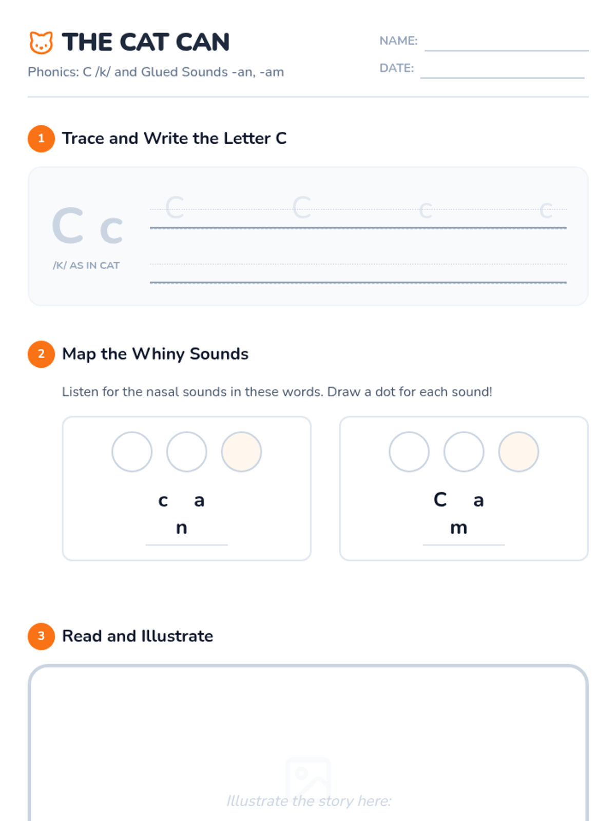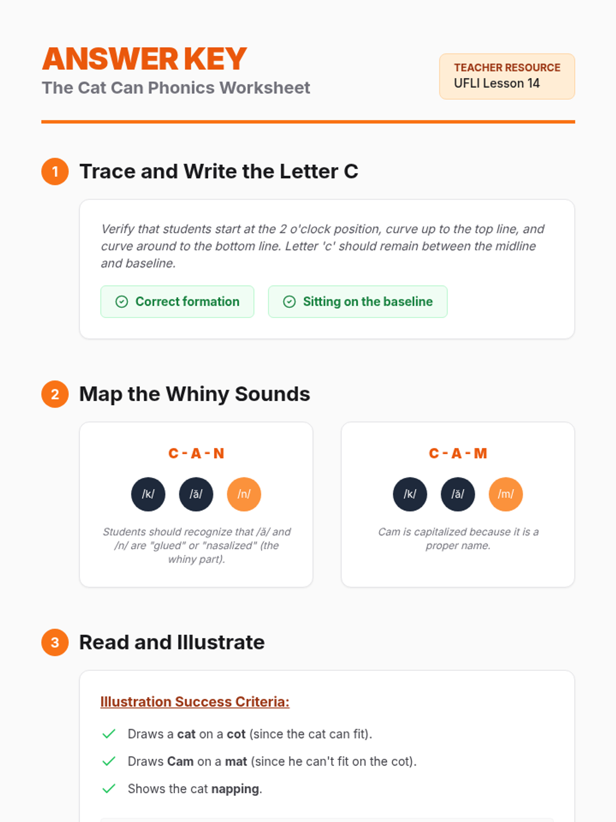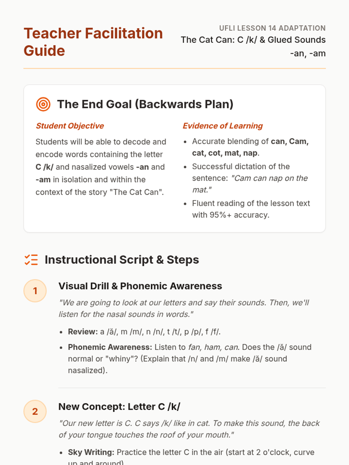A structured literacy lesson focused on the letter C /k/ and glued sounds -an and -am, using the decodable text 'The Cat Can'. This lesson follows a backwards planning approach to ensure students can decode and encode CVC words and nasalized vowels.