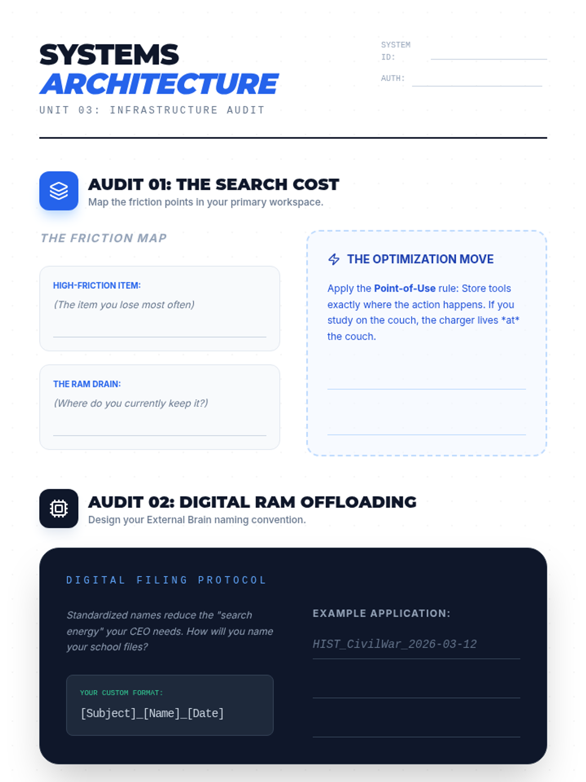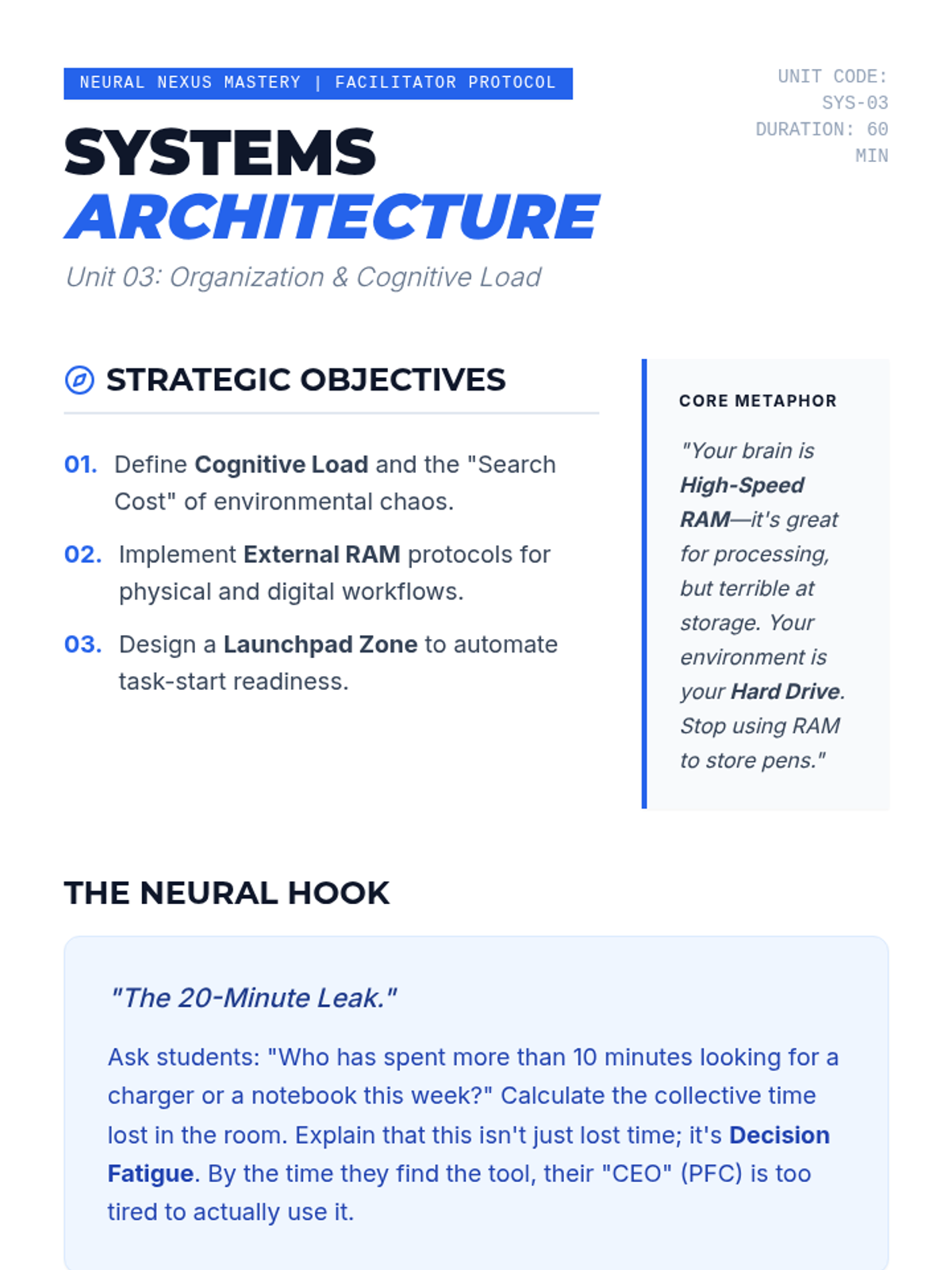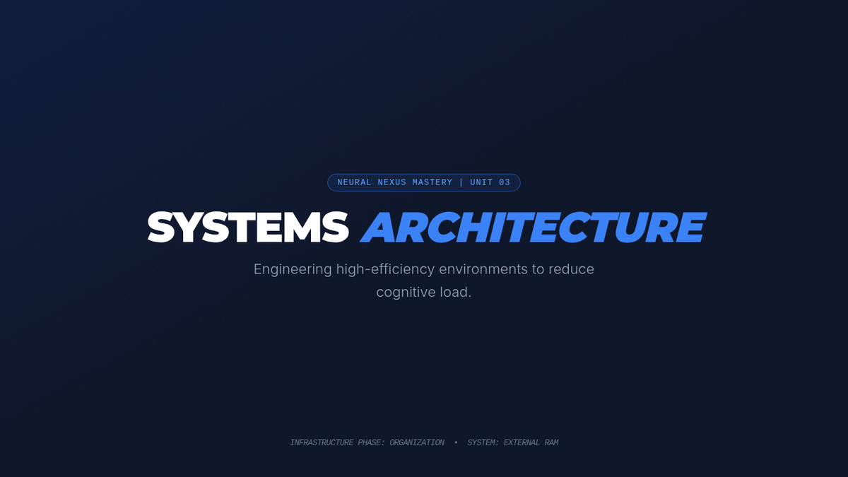Teaches systems-level organization for physical and digital workflows. Focuses on reducing cognitive load by externalizing memory and creating high-efficiency environments.